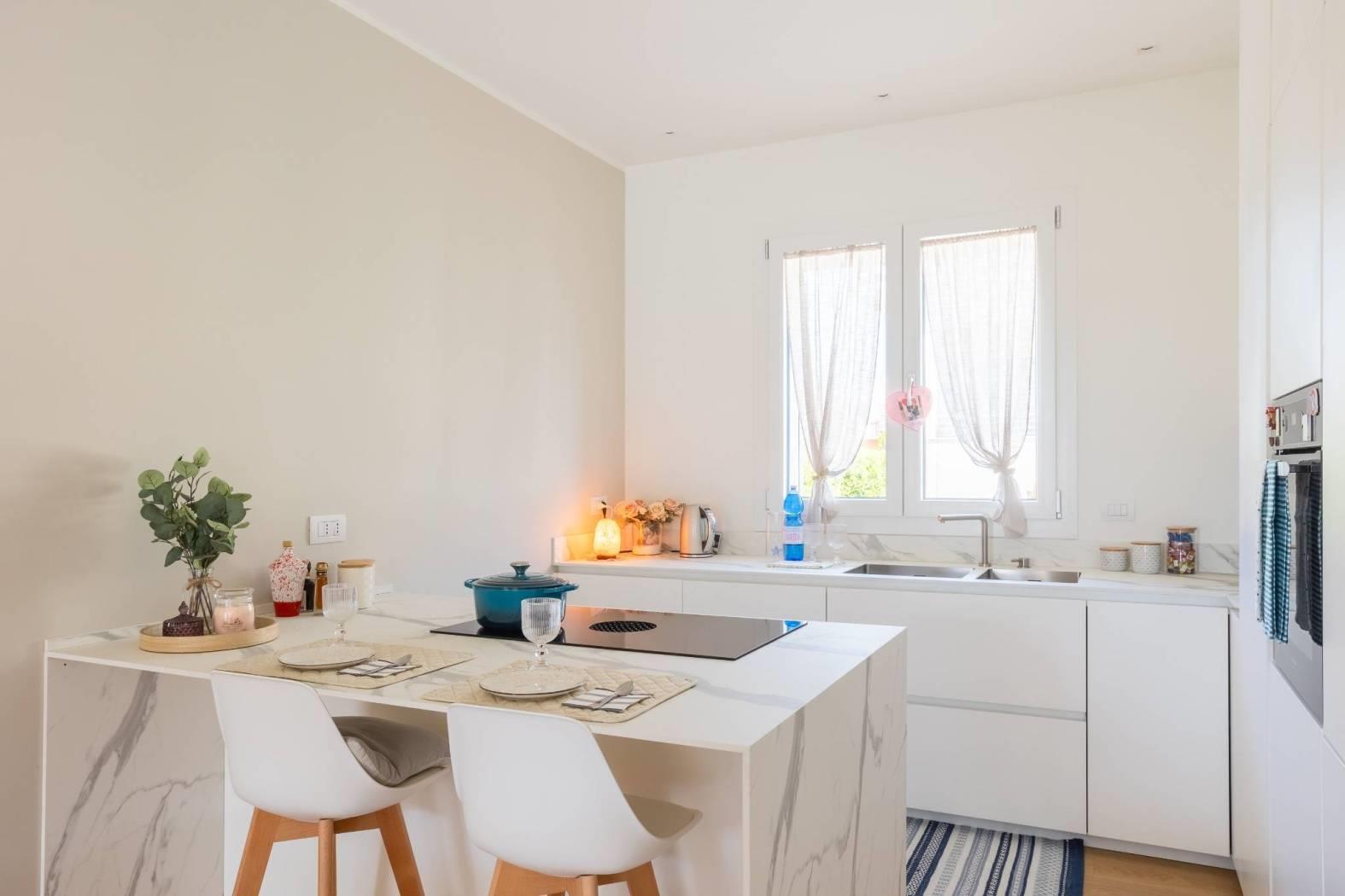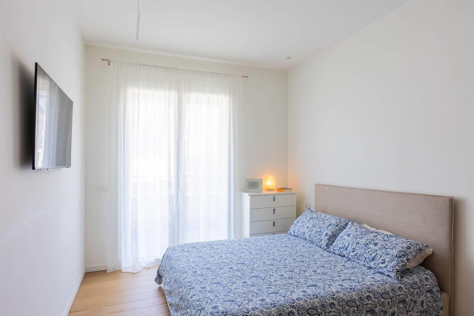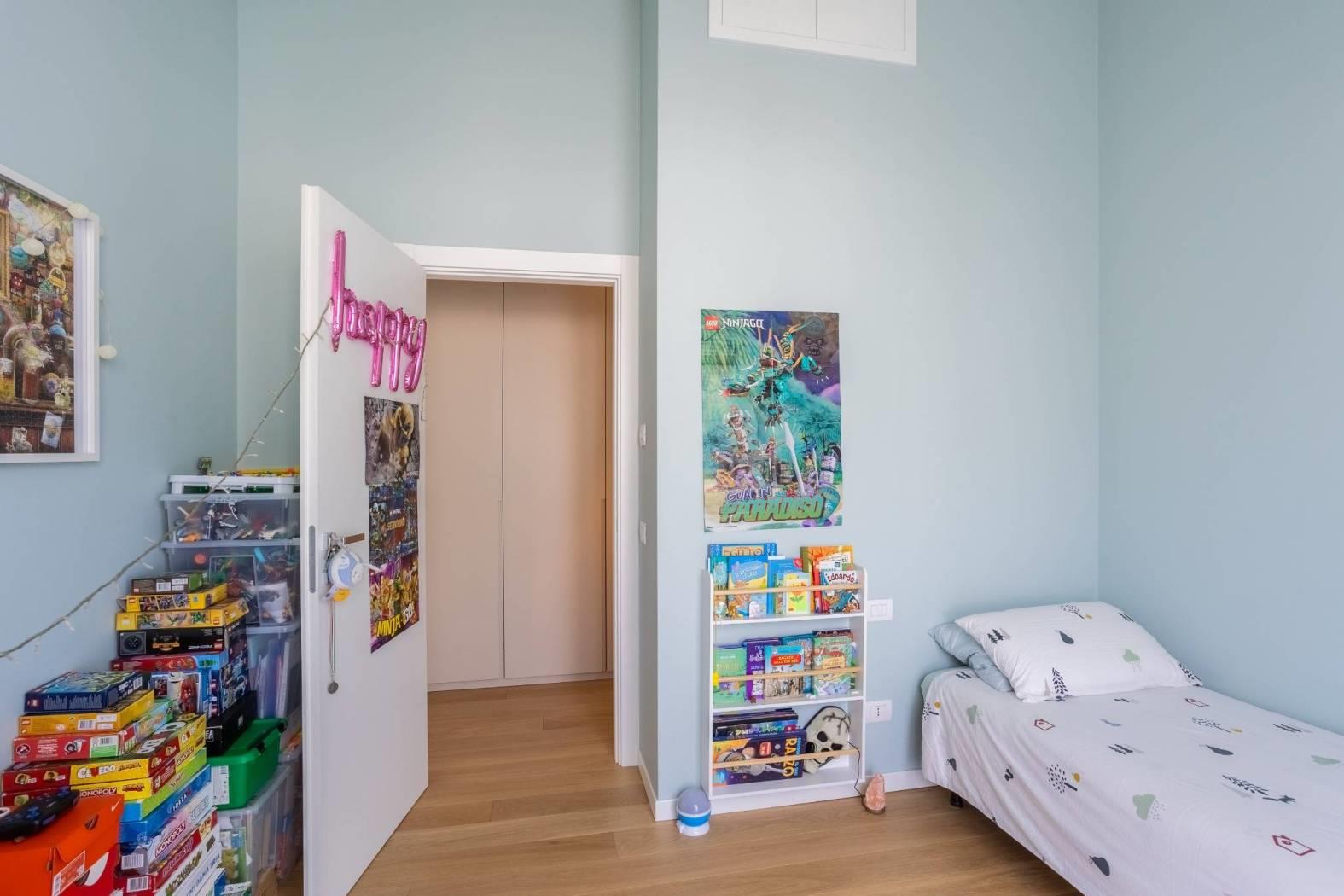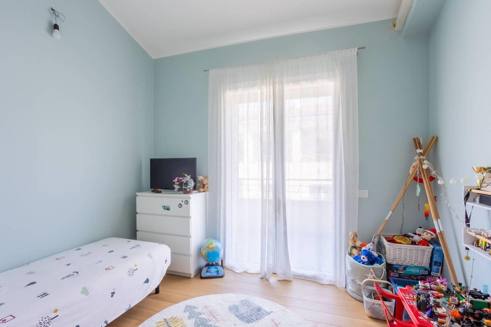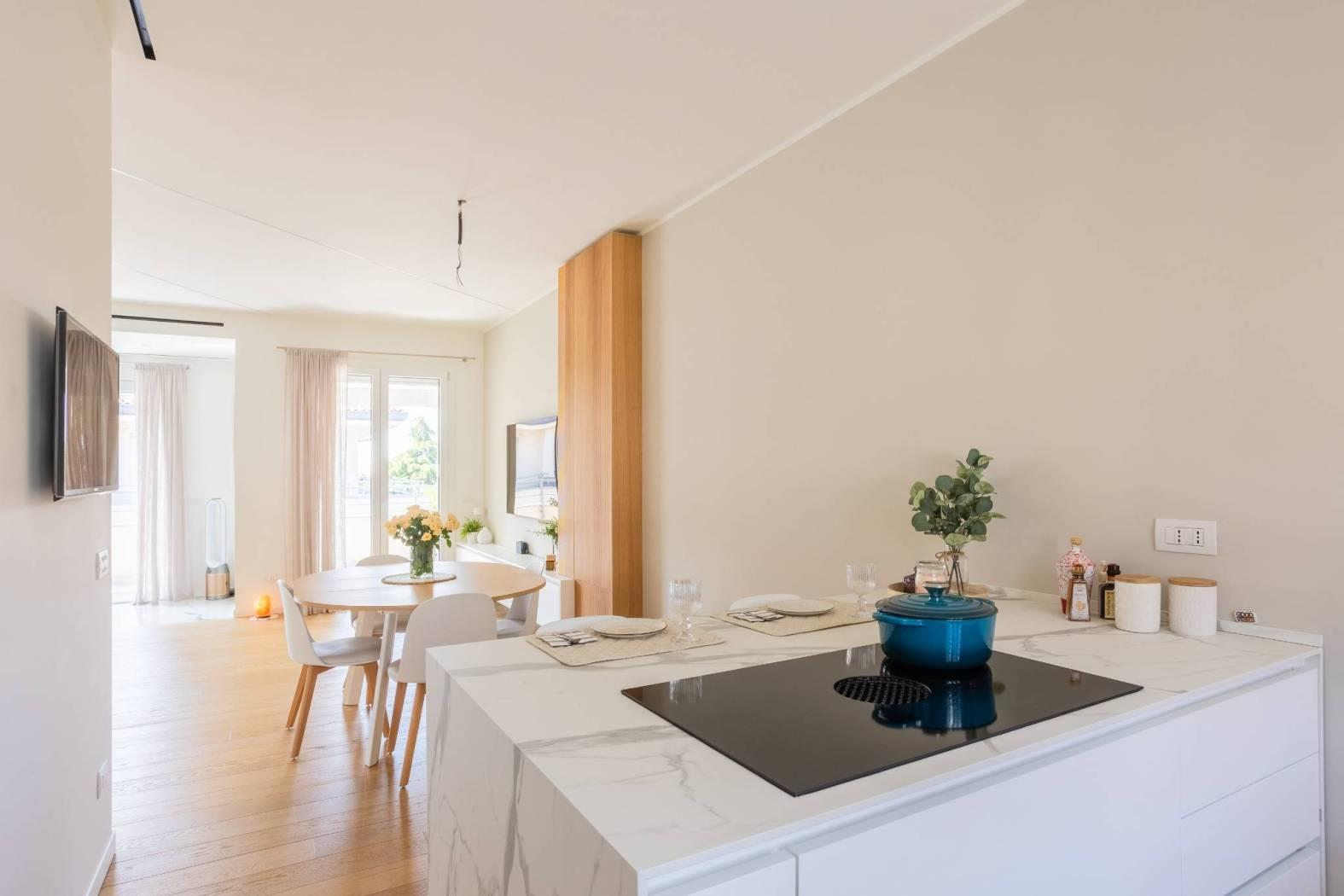L'appartamento è composto da un doppio soggiorno con affaccio affaccio su terrazzo, dotato di tende motorizzate per il massimo comfort, cucina abitabile a vista sul soggiorno che crea un ambiente conviviale e accogliente, il disimpegno conduce a un bagno padronale, mentre le due camere da letto, una matrimoniale con bagno en-suite e una cameretta, offrono spazi privati ben organizzati e affaccio su un comodo balcone di servizio.
