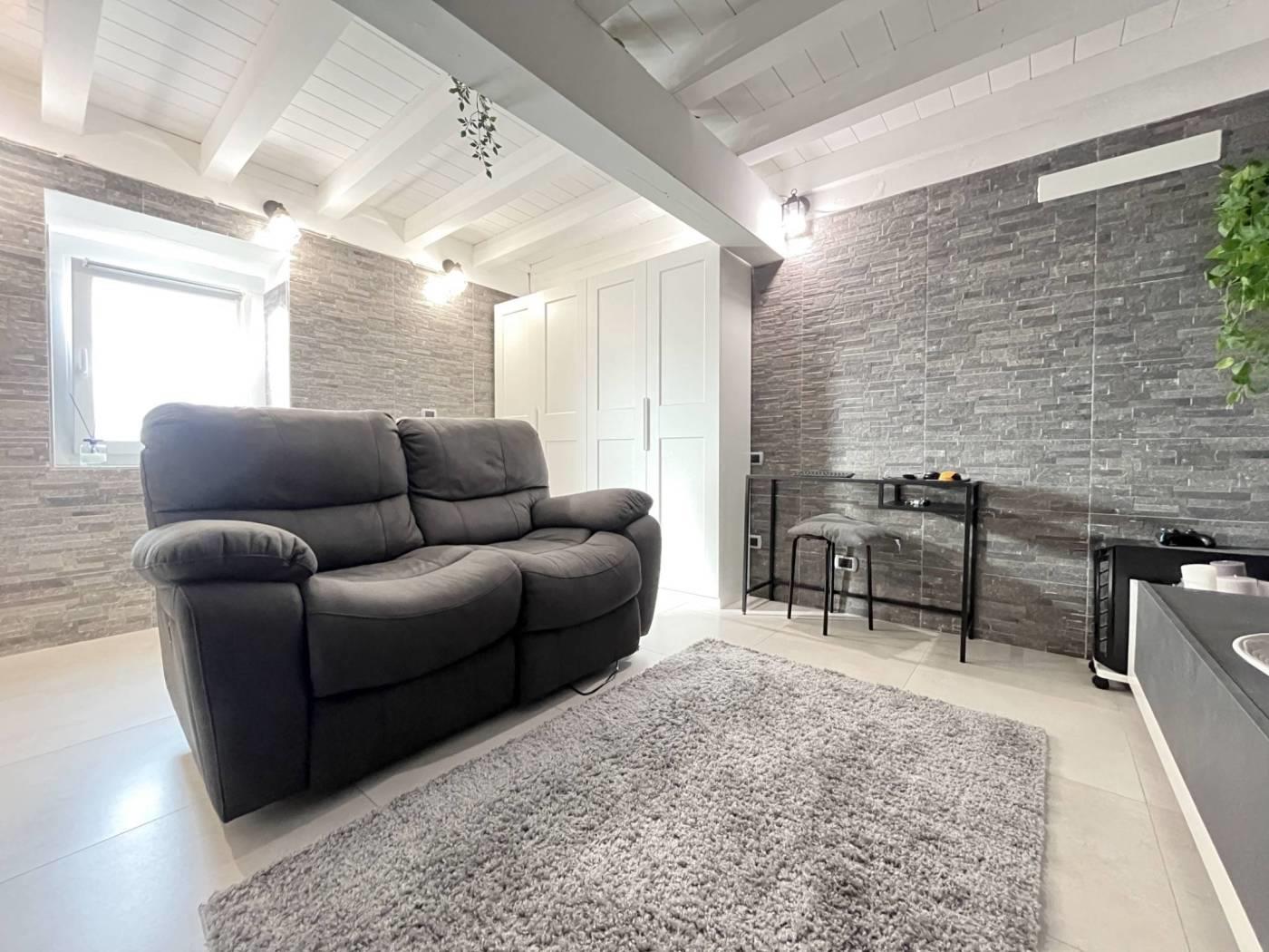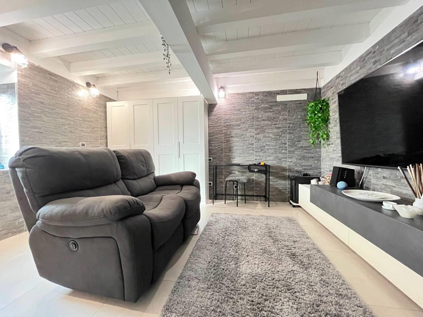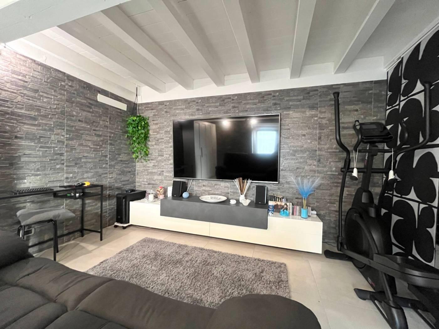 Ingresso direttamente nel soggiorno con cucina a vista, corridoio con pratica armadiatura con lavatrice all'interno, camera da letto matrimoniale e servizio finestrato; dal soggiorno tramite scala interna si scende verso il locale taverna sfruttabile come secondo soggiorno, come locale hobby/accessorio oppure come locale studio.