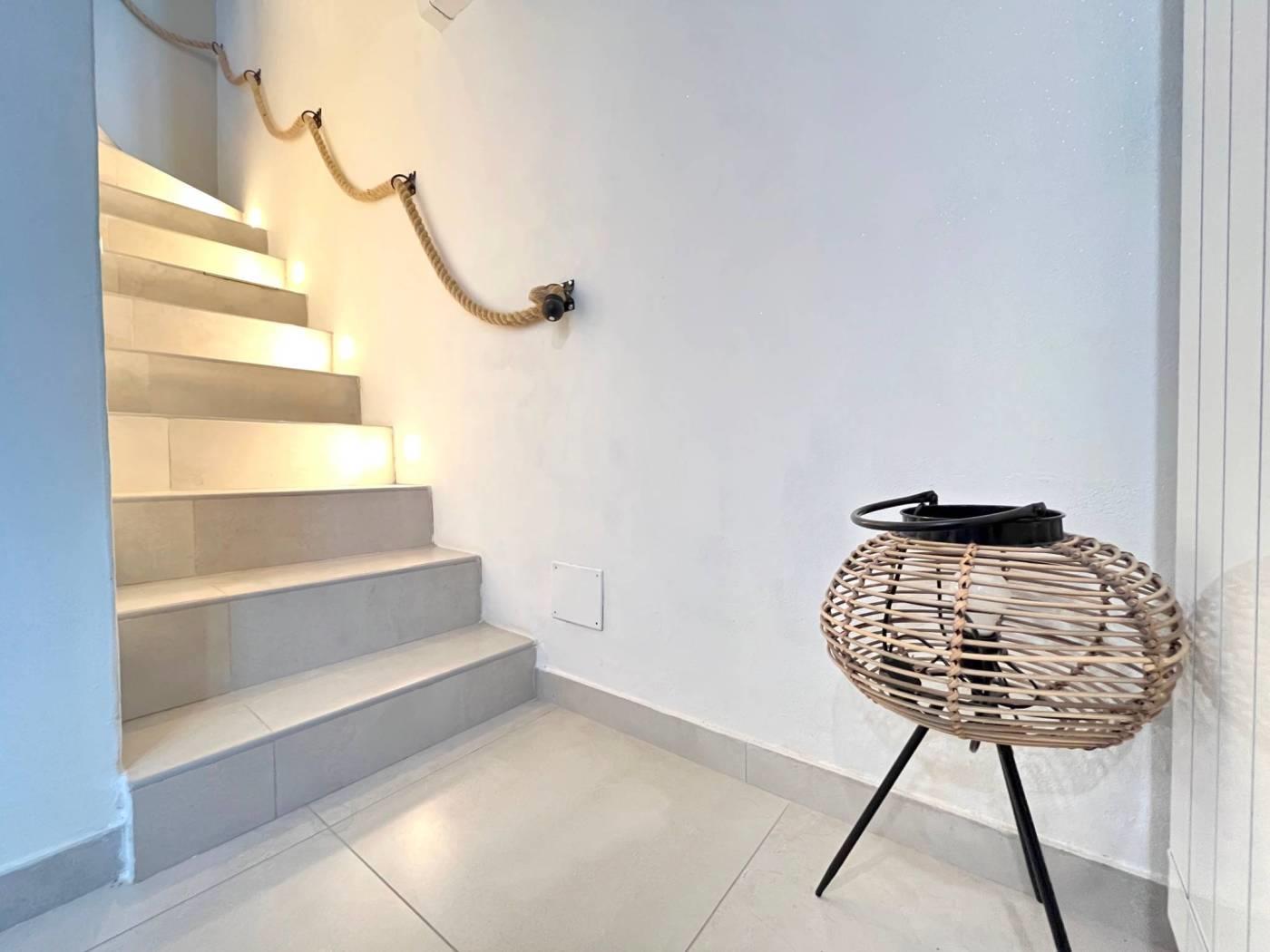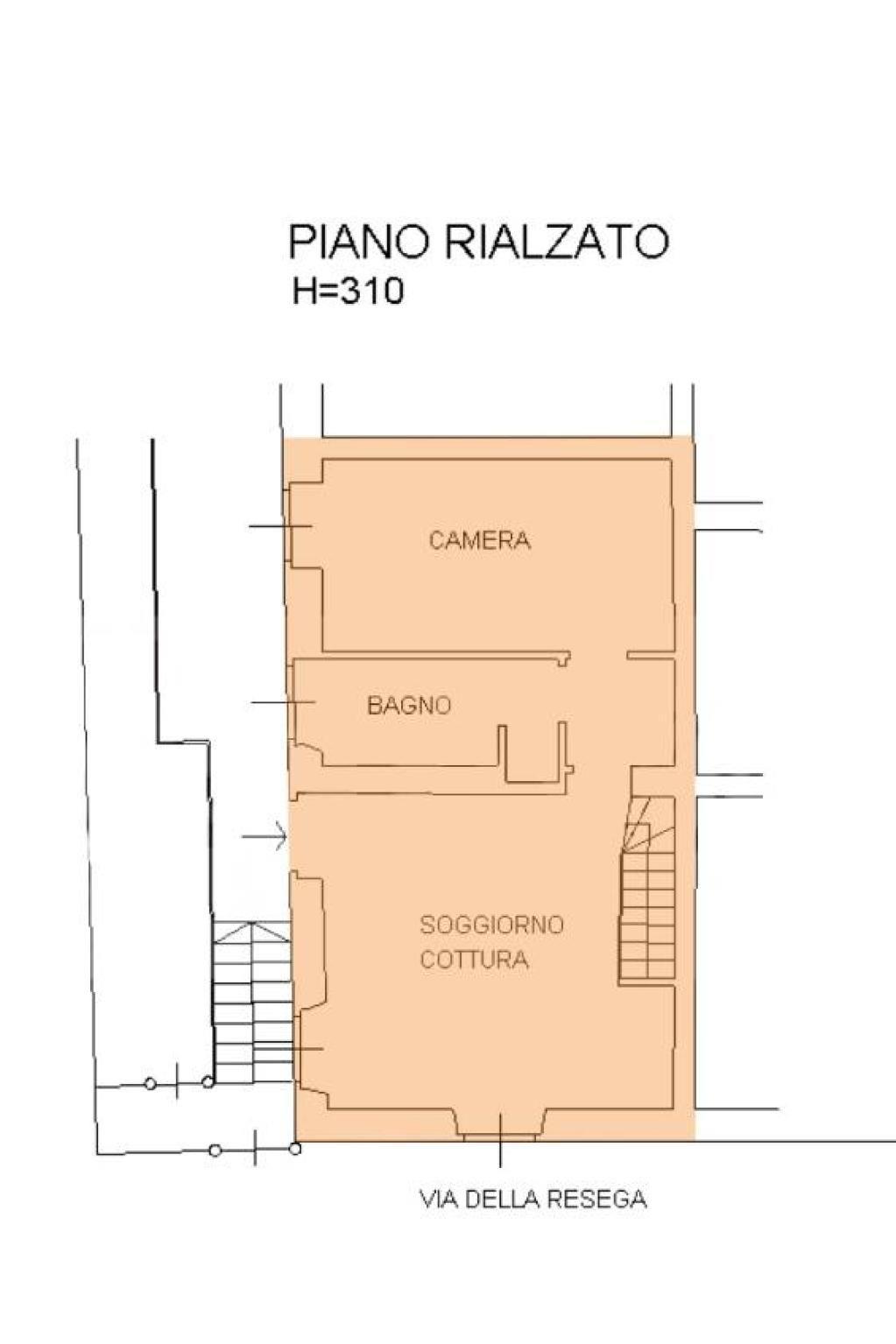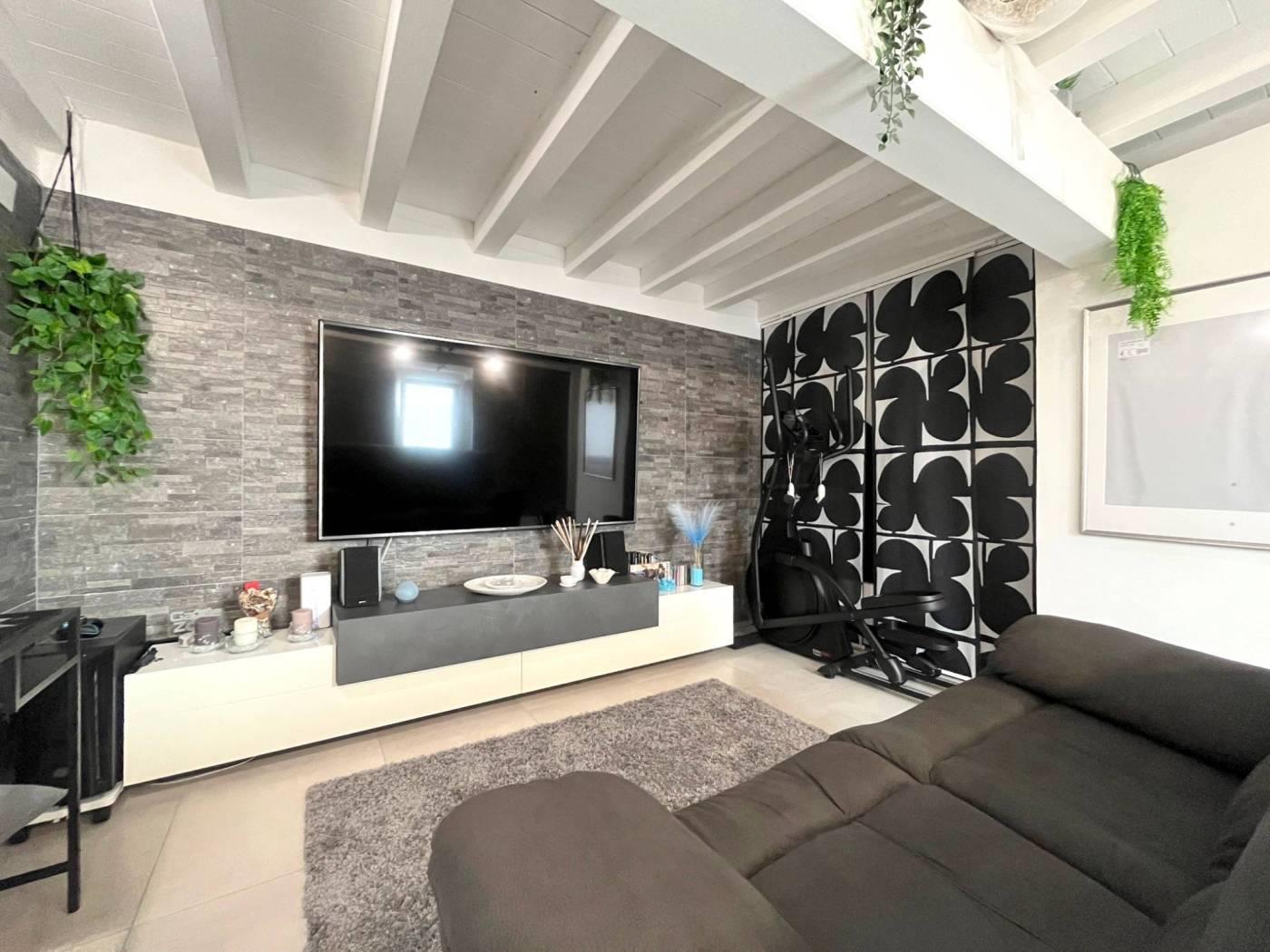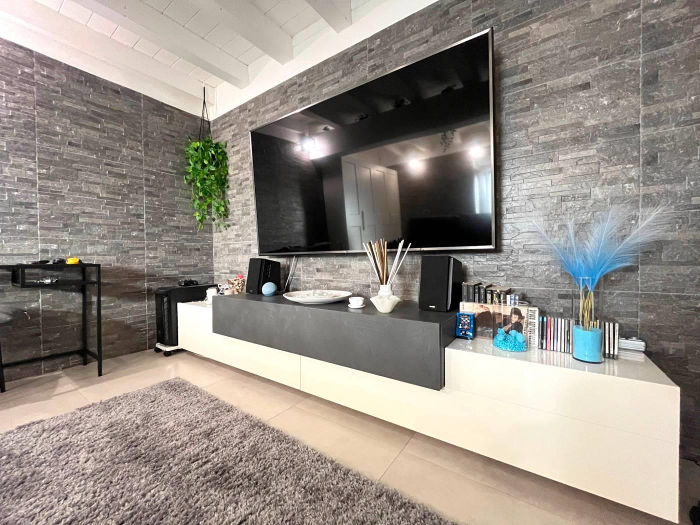 Ingresso direttamente nel soggiorno con cucina a vista, corridoio con pratica armadiatura con lavatrice all'interno, camera da letto matrimoniale e servizio finestrato; dal soggiorno tramite scala interna si scende verso il locale taverna sfruttabile come secondo soggiorno, come locale hobby/accessorio oppure come locale studio.