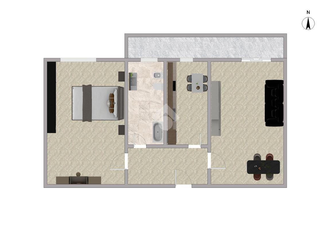 Entrando troviamo un disimpegno che divide gli ambienti. Soggiorno, cucina abitabile, spaziosa camera matrimoniale e bagno finestrato con vasca.