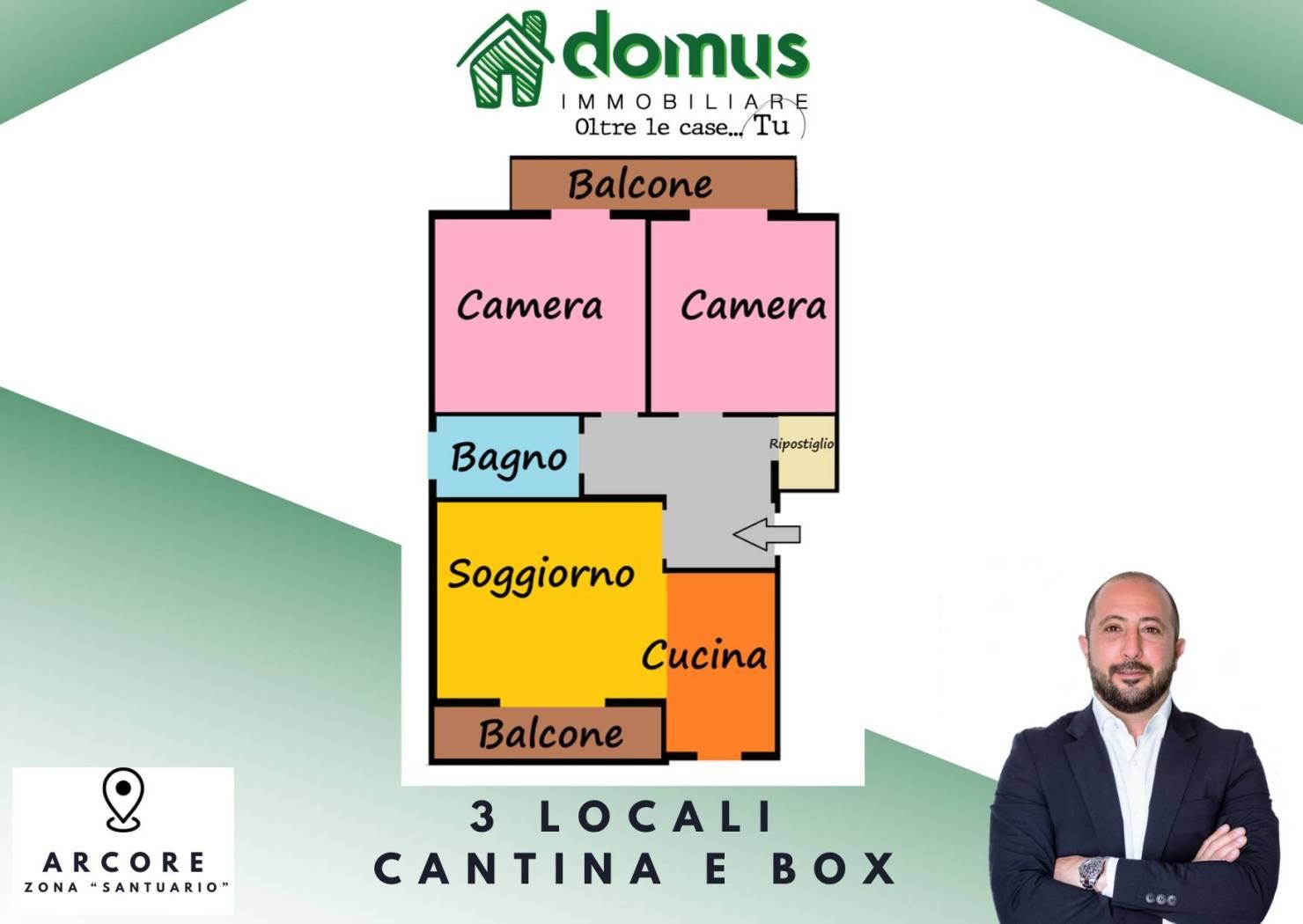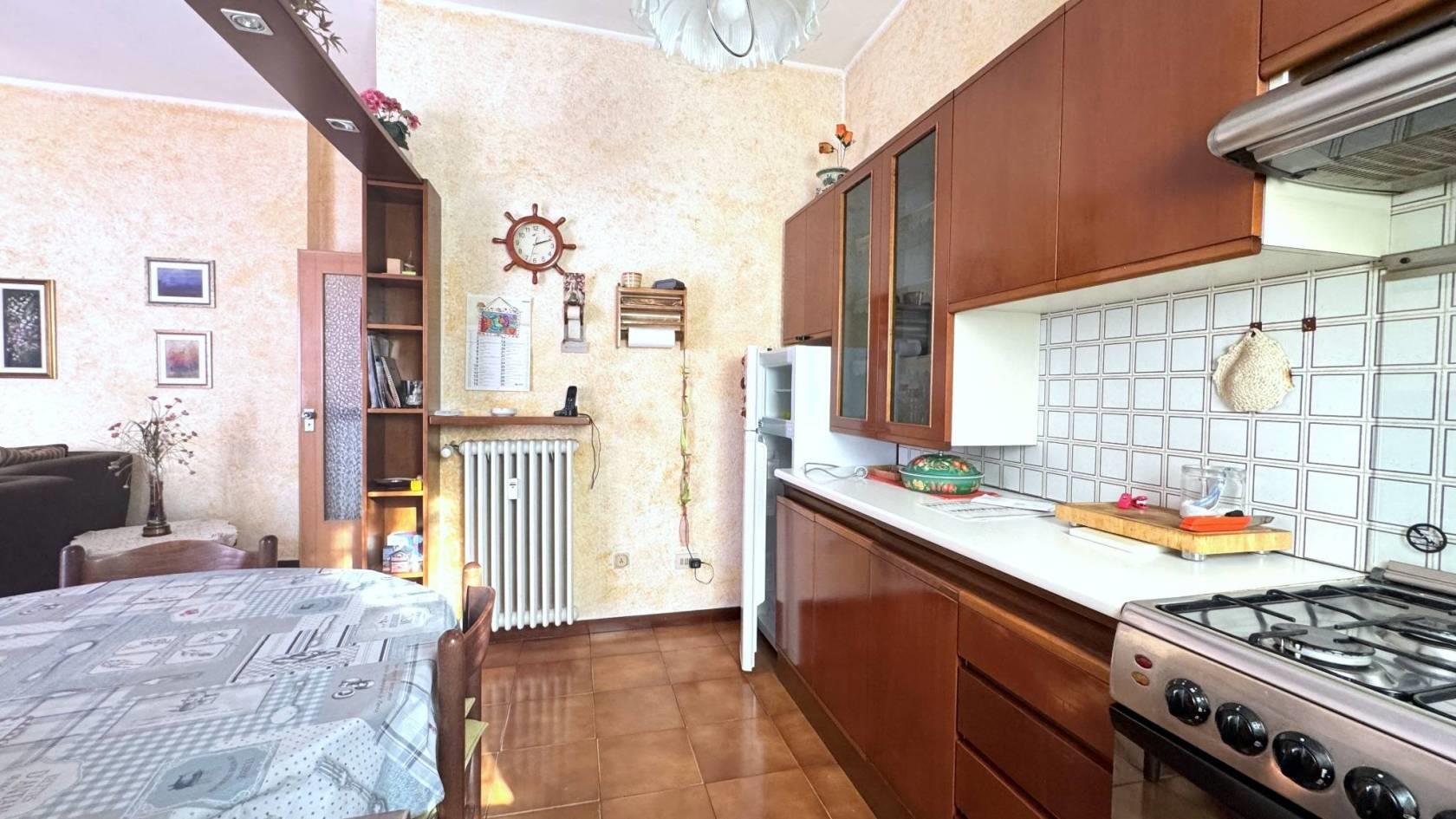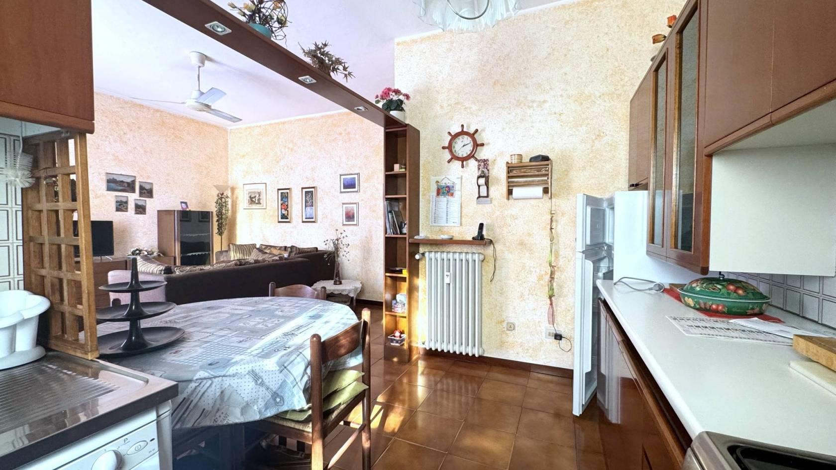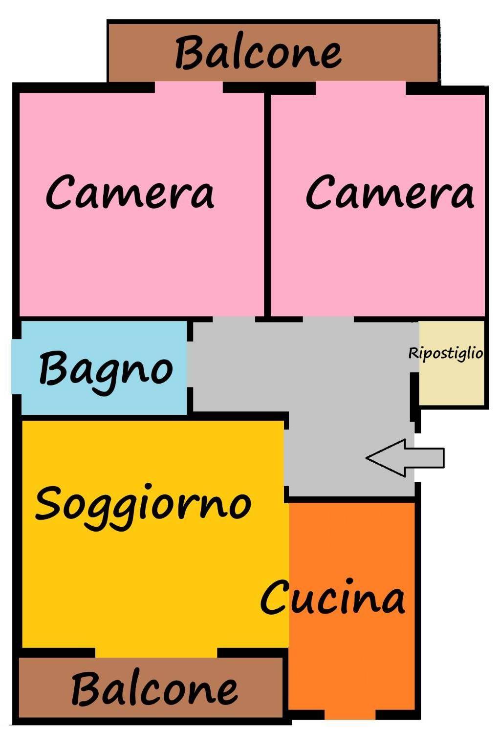 L’immobile gode di una doppia esposizione ed è arricchito da due balconi, uno affacciato sulla zona giorno e uno sulla zona notte. La distribuzione interna è funzionale e ben organizzata: ingresso su soggiorno con cucina, disimpegno con ripostiglio, due ampie camere matrimoniali e bagno finestrato.