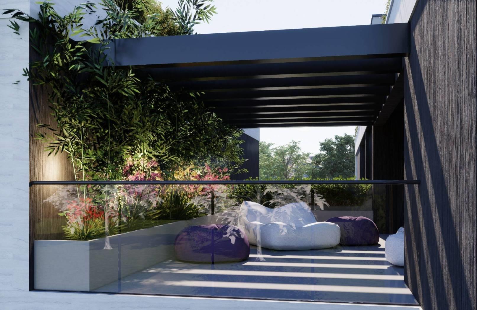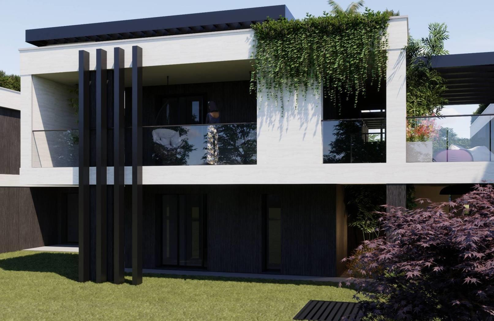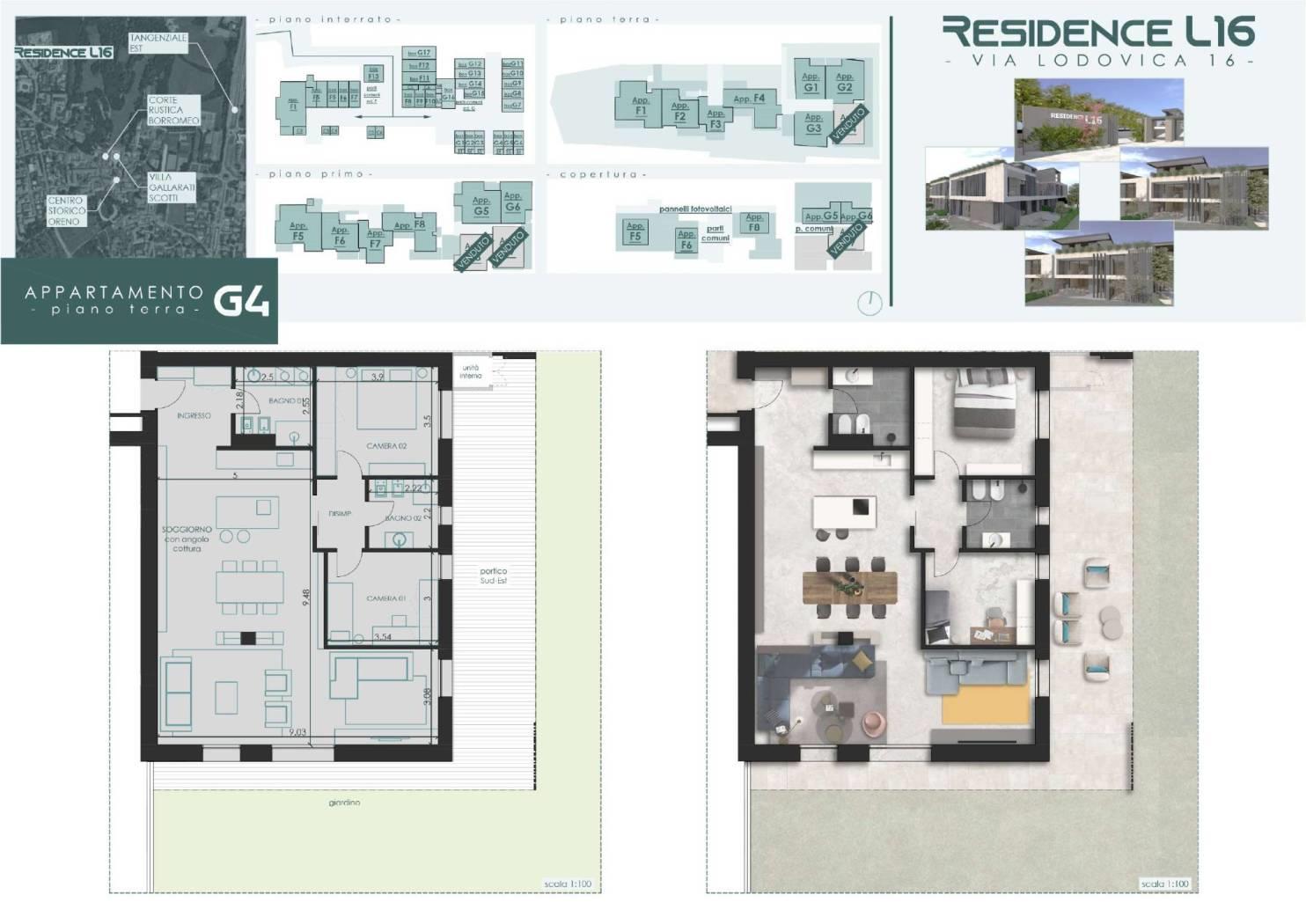 La palazzina si compone da 8 appartamenti, 4 al piano terra con giardini privati e 4 al piano primo impreziositi da logge e terrazzo sul tetto dell'edificio accessibile da scala autonoma.