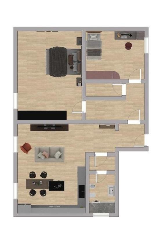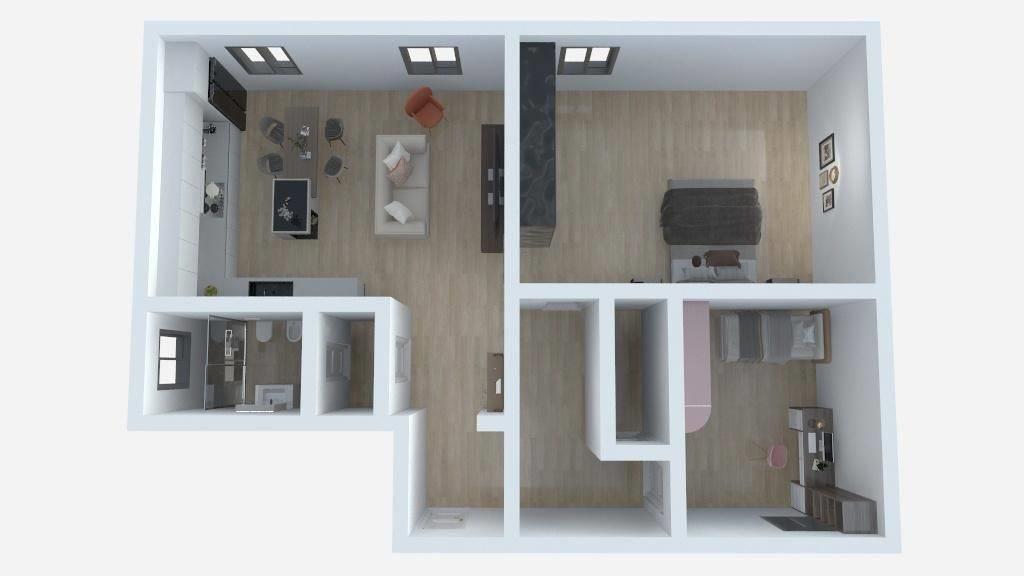 Sarà così composto: ingresso, zona giorno con cucina a vista, disimpegno con ripostiglio, camera matrimoniale, cameretta e bagno finestrato.