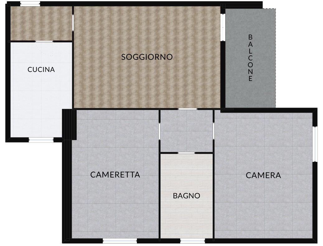 L’appartamento si apre su un ingresso che conduce all’ampio soggiorno, il quale affaccia su un comodo balcone, ideale per momenti di relax.