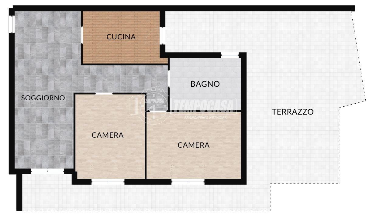 La zona notte è composta da due camere da letto di generose dimensioni, entrambe facilmente arredabili, e da un bagno finestrato che assicura aerazione naturale e comfort.