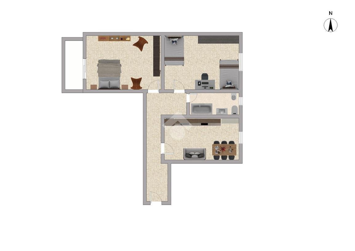 Zona giorno con cucina lasciata a vista, spaziosa camera matrimoniale con comodo balcone, cameretta di generose dimensioni e bagno finestrato con vasca.