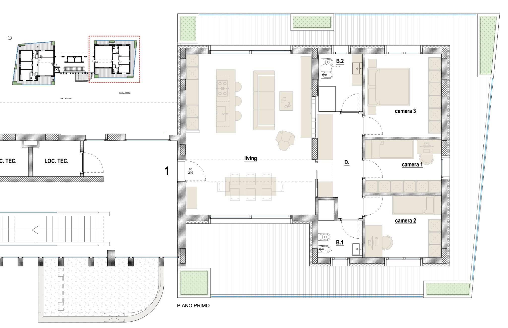 Il soggiorno è luminoso, arioso e pensato per accompagnare sia la vita quotidiana sia i momenti di convivialità. La zona notte ospita tre camere ben proporzionate e doppi servizi entrambi finestrati, confermando l’attenzione alla qualità e al comfort abitativo. Anche qui lo spazio esterno gioca un ruolo centrale: un terrazzo generoso che estende l’abitare verso l’esterno, ideale per creare zone relax, pranzi all’aperto o angoli verdi privati.