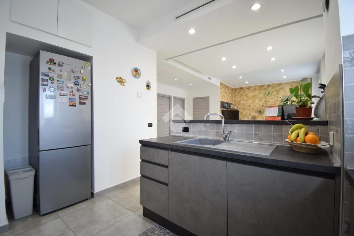 Entrando troviamo un disimpegno che accompagna all'ampia e luminosa zona giorno con cucina lasciata a vista e comodo balcone.