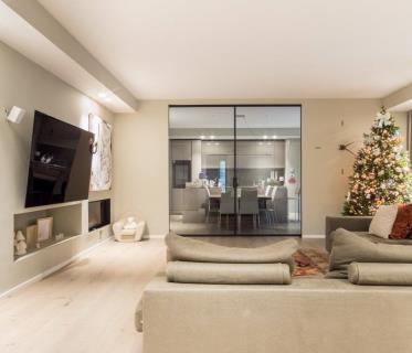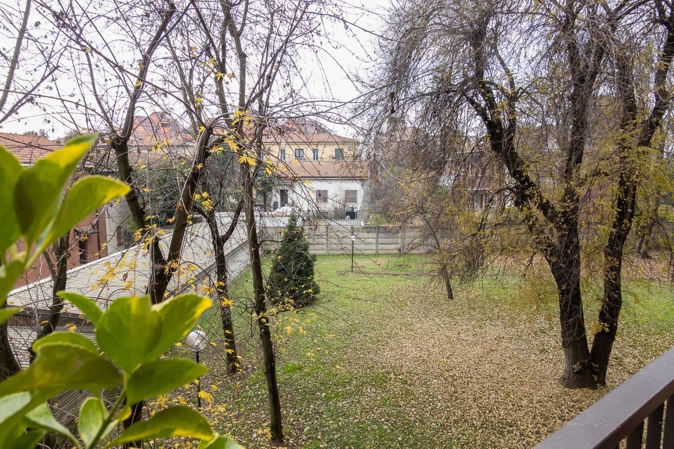 Il terrazzo splendidamente esposto sul bosco interno del parco condominale è coperto, e serve la zona giorno, sia la cucina che la zona living, esponendo ad ovest. Speciale la visuale sul tramonto durante l'estate.