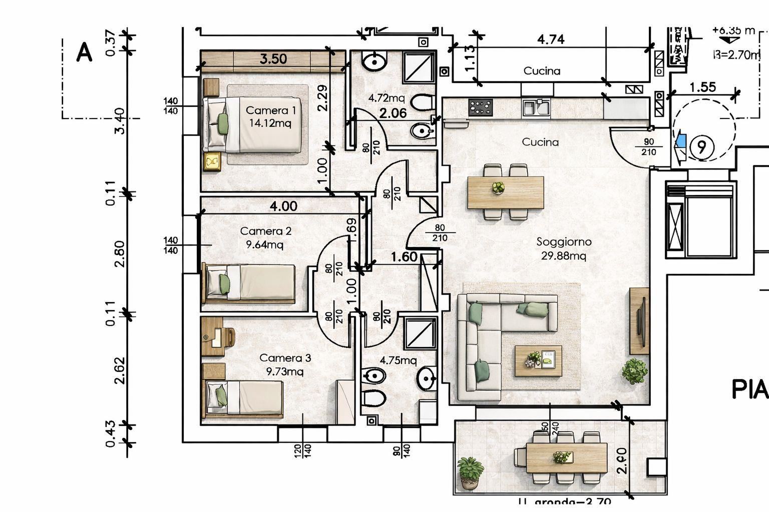 Ottimo 4 Locali composto da una zona living con cucina a vista molto luminosa e spaziosa, grazie all'ampia vetrata si accede al terrazzo coperto di mq. 13 attrezzabile per la zona pranzo, area conversazione e barbecue.