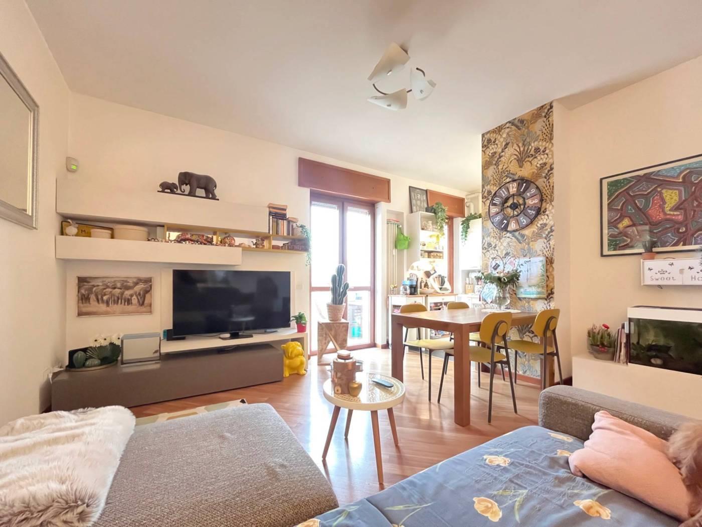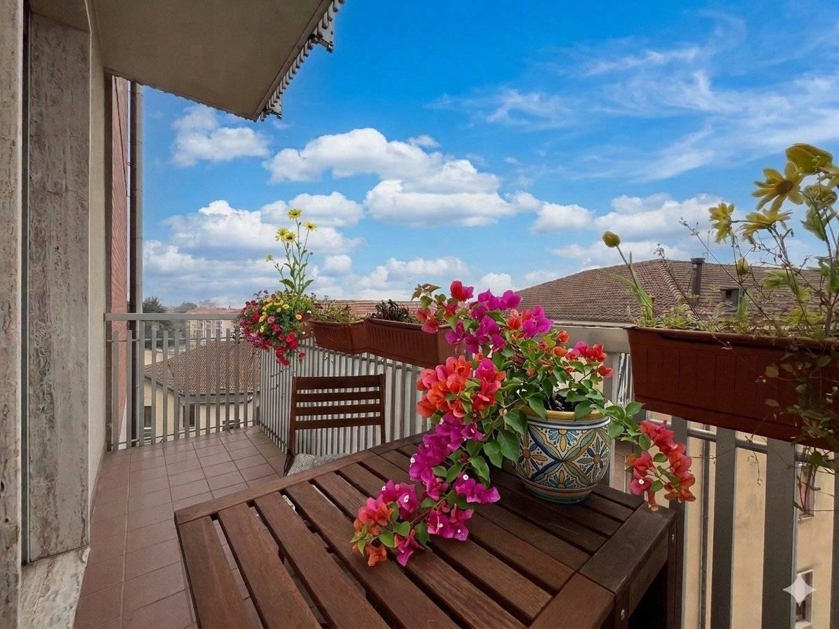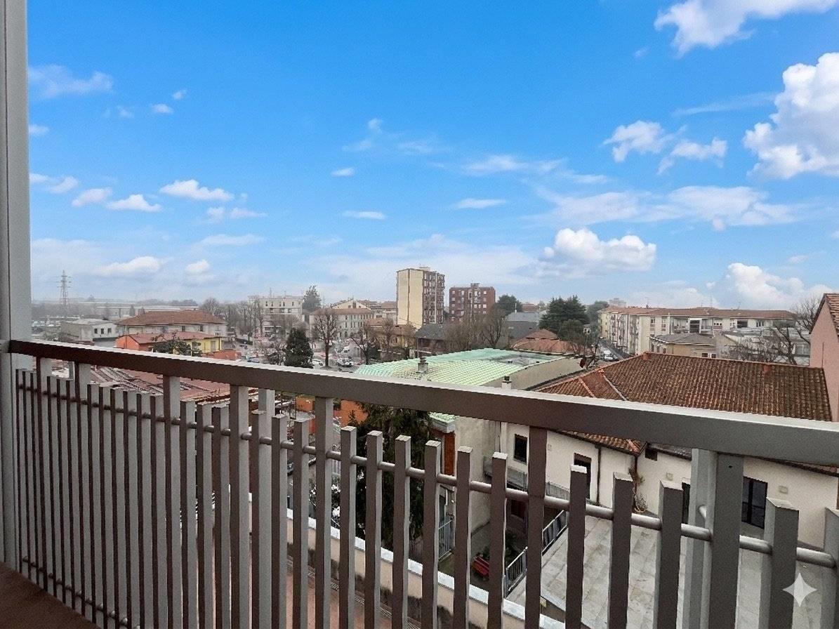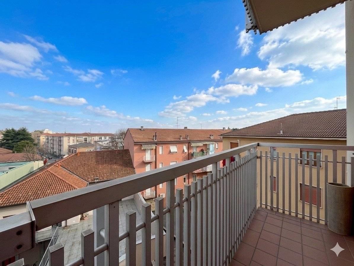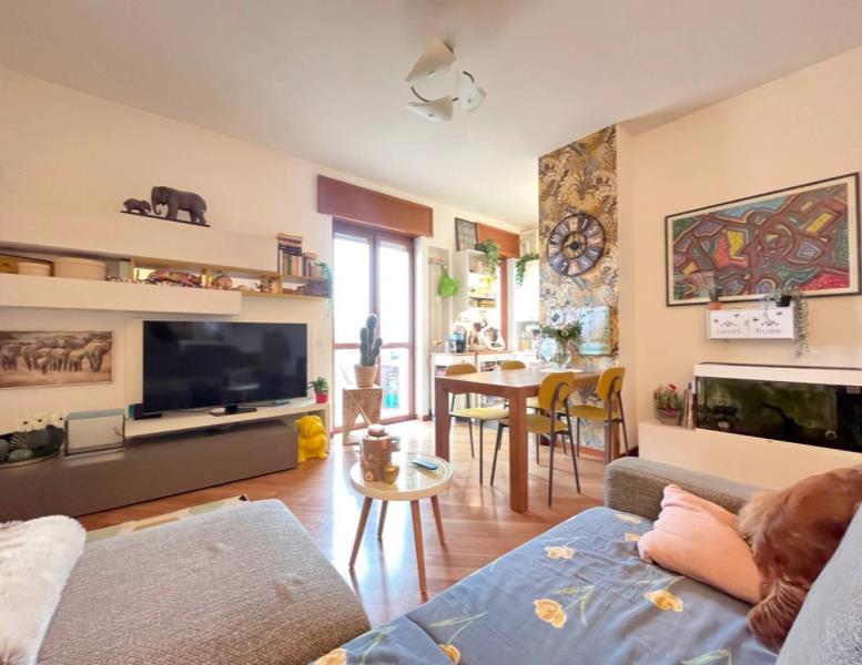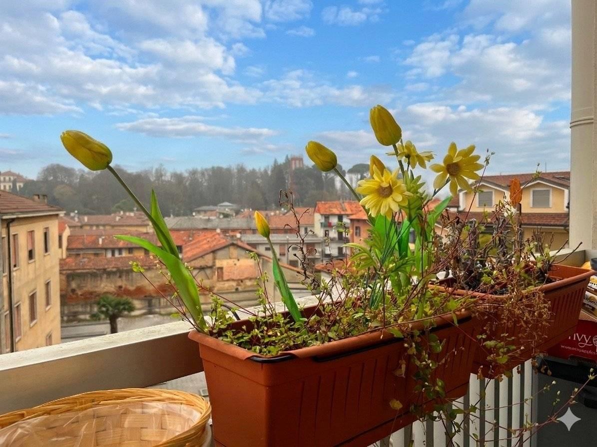 Ingresso direttamente nel soggiorno, con cucina a vista e ampia balconata con affaccio sui tetti circostanti, camera da letto matrimoniale con secondo balcone, seconda camera da letto, servizio finestrato con doccia e secondo servizio ad uso lavanderia. Completa la proprietà la cantina e il box.