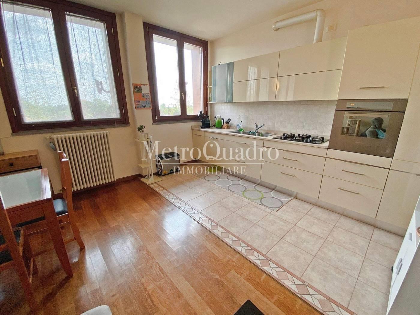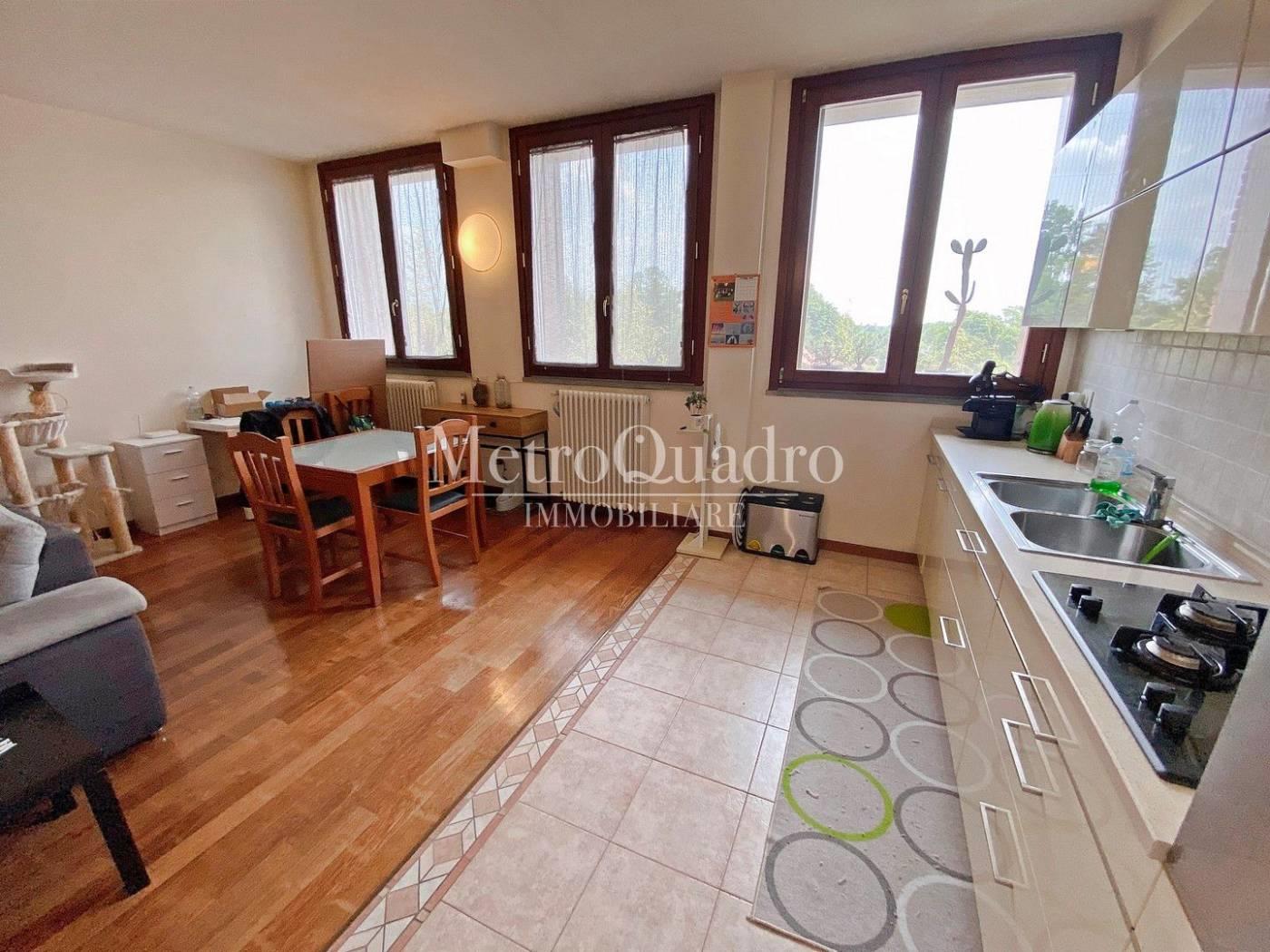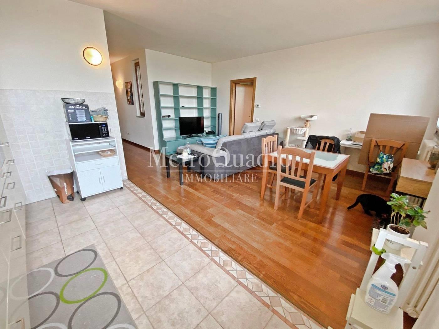 Situato al terzo ed ultimo piano servito da ascensore, abbiamo un comodo ingresso dove poter alloggiare l'armadio guardaroba, proseguendo si accede alla generosa e luminosa zona giorno composta dalla sala con la cucina a vista arredata e completa di tutti gli elettrodomestici. A completare l'ambiente troviamo un pratico ripostiglio con lavanderia. Il disimpegno da accesso alla camera da letto ed il bagno finestrato completo di vasca idromassaggio Teuco e box doccia. Immobile subito disponibile. Riscaldamento Centralizzato con contabilizzatore di calorie.