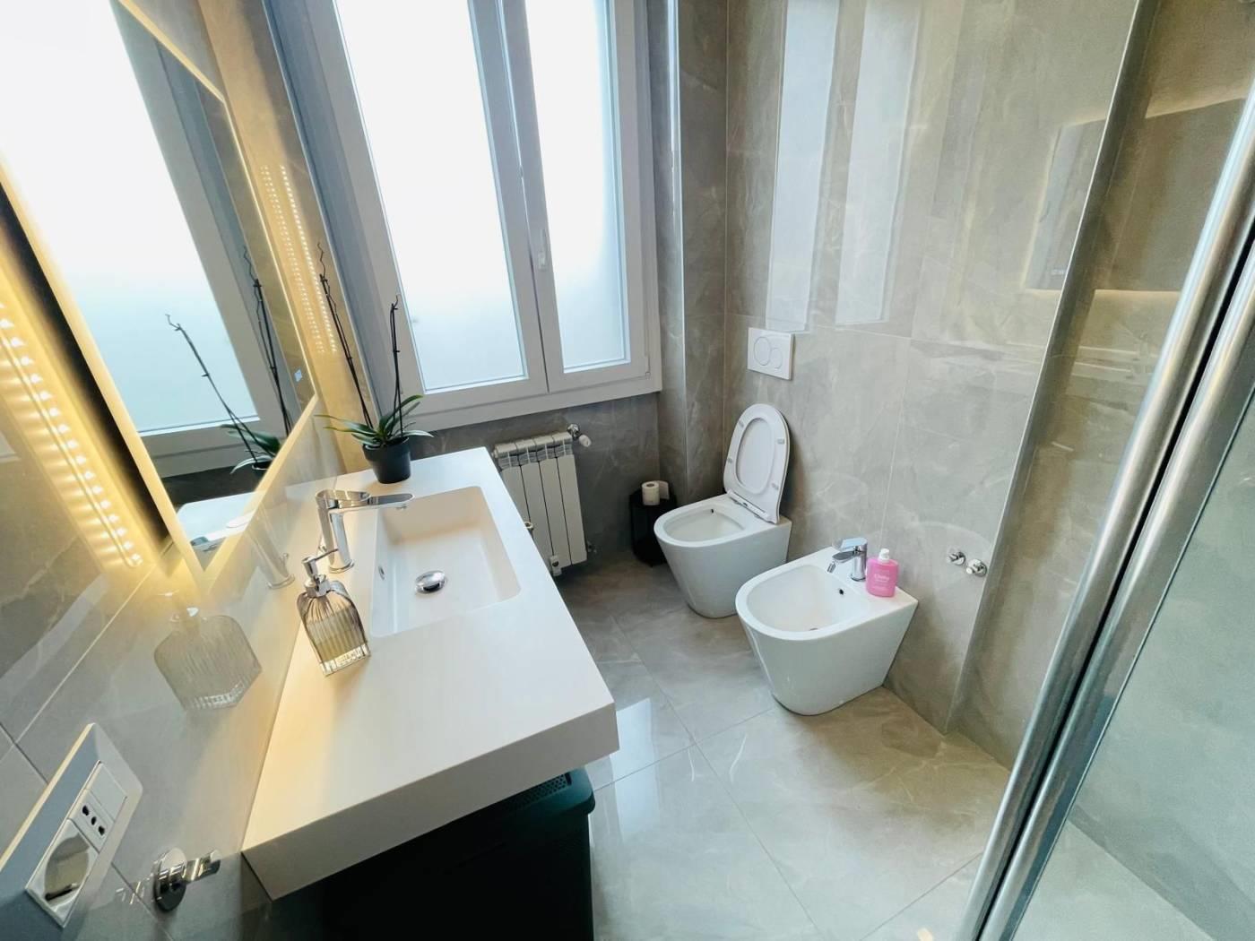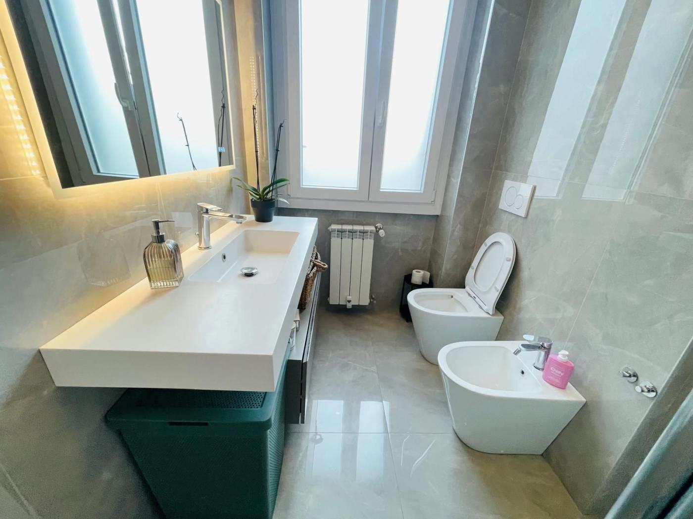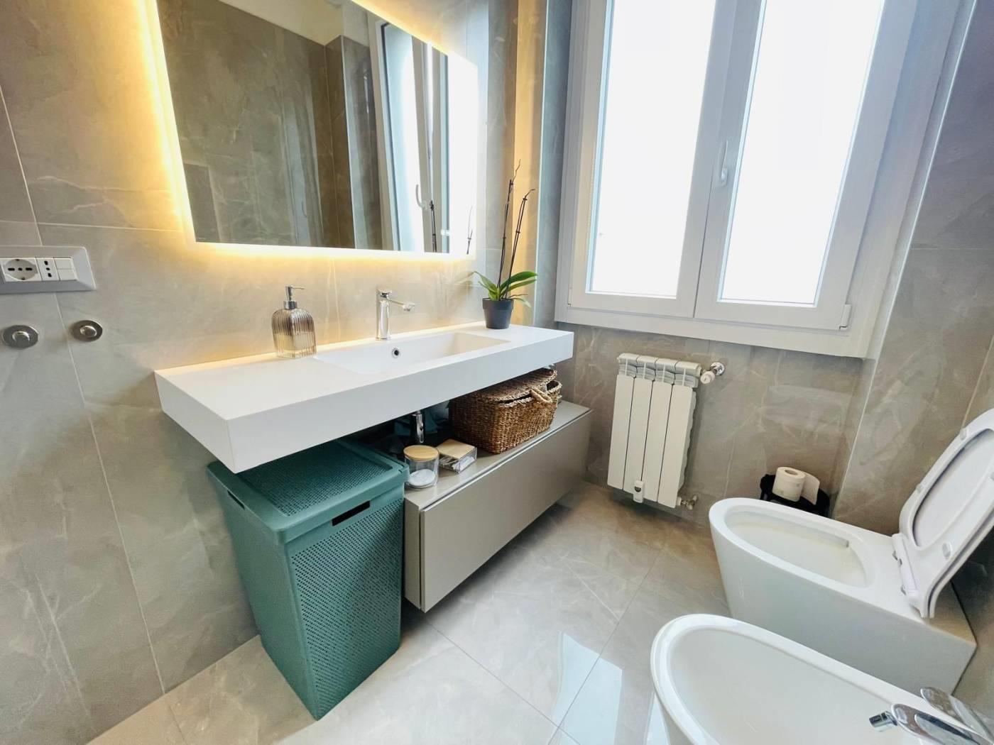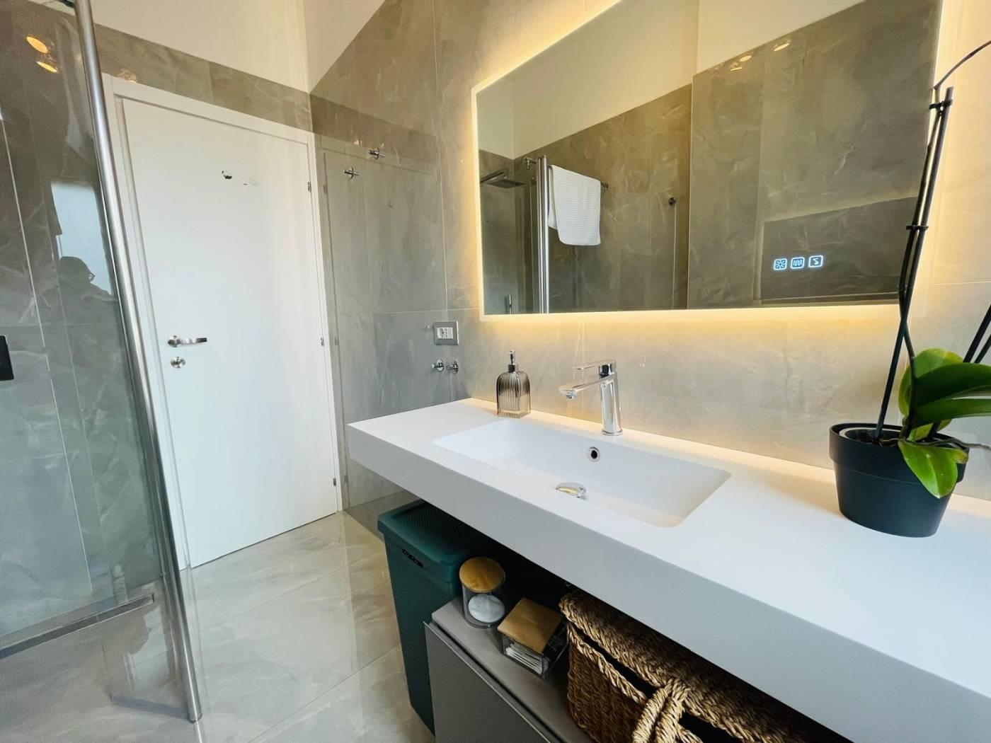 Il bagno, rifinito in marmo, rappresenta un ulteriore elemento distintivo dell’appartamento, mentre gli infissi in PVC con doppio vetro garantiscono ottimo isolamento termico e acustico.