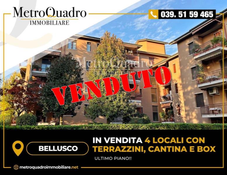 BELLUSCO - Corso Alpi - Situato all'interno di un complesso residenziale di una via a fondo chiuso, proponiamo ampio Appartamento di 4 locali di 144 mq posto al quarto ed ultimo piano servito da ascensore. La palazzina costruita nel 1977 risulta essere in ottime condizioni generali ed è circondata da ampi spazi verdi e cortile. L'Appartamento è composto da una spaziosa e luminosa zona giorno dove troviamo un comodo ingresso, il soggiorno doppio con zona pranzo e affaccio ad ovest sul terrazzino dotato di tendone da sole. La cucina separata è semiabitabile con la possibilità di creare un moderno open space e anch'essa è dotatata di terrazzino.