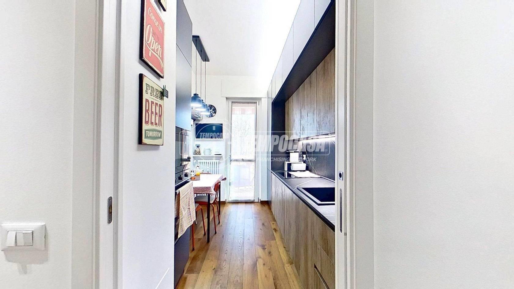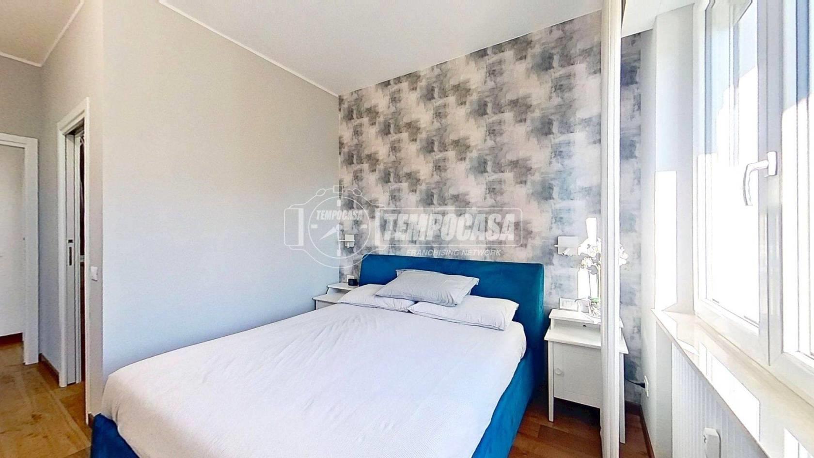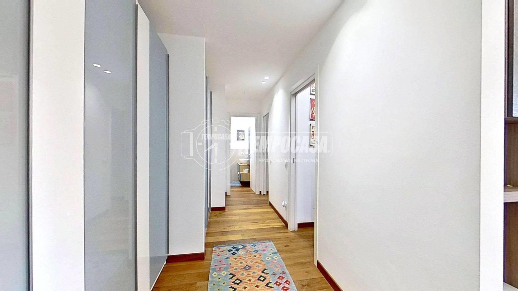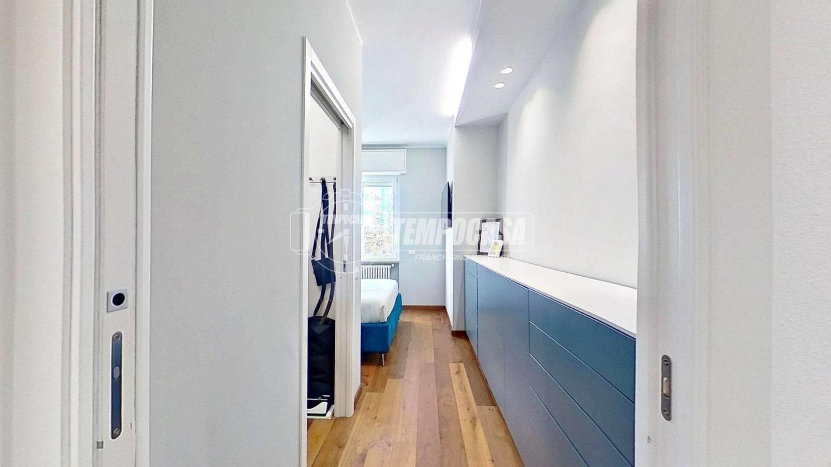 Proseguendo troviamo la cucina separata, funzionale e anch’essa con accesso al balcone, creando continuità tra gli spazi e un’ottima vivibilità quotidiana. In fondo al disimpegno si colloca il bagno, rifinito con materiali di pregio e completo di moderno box doccia. Accanto, la camera matrimoniale offre un ambiente intimo e ben organizzato, arricchito da una comoda cabina armadio.