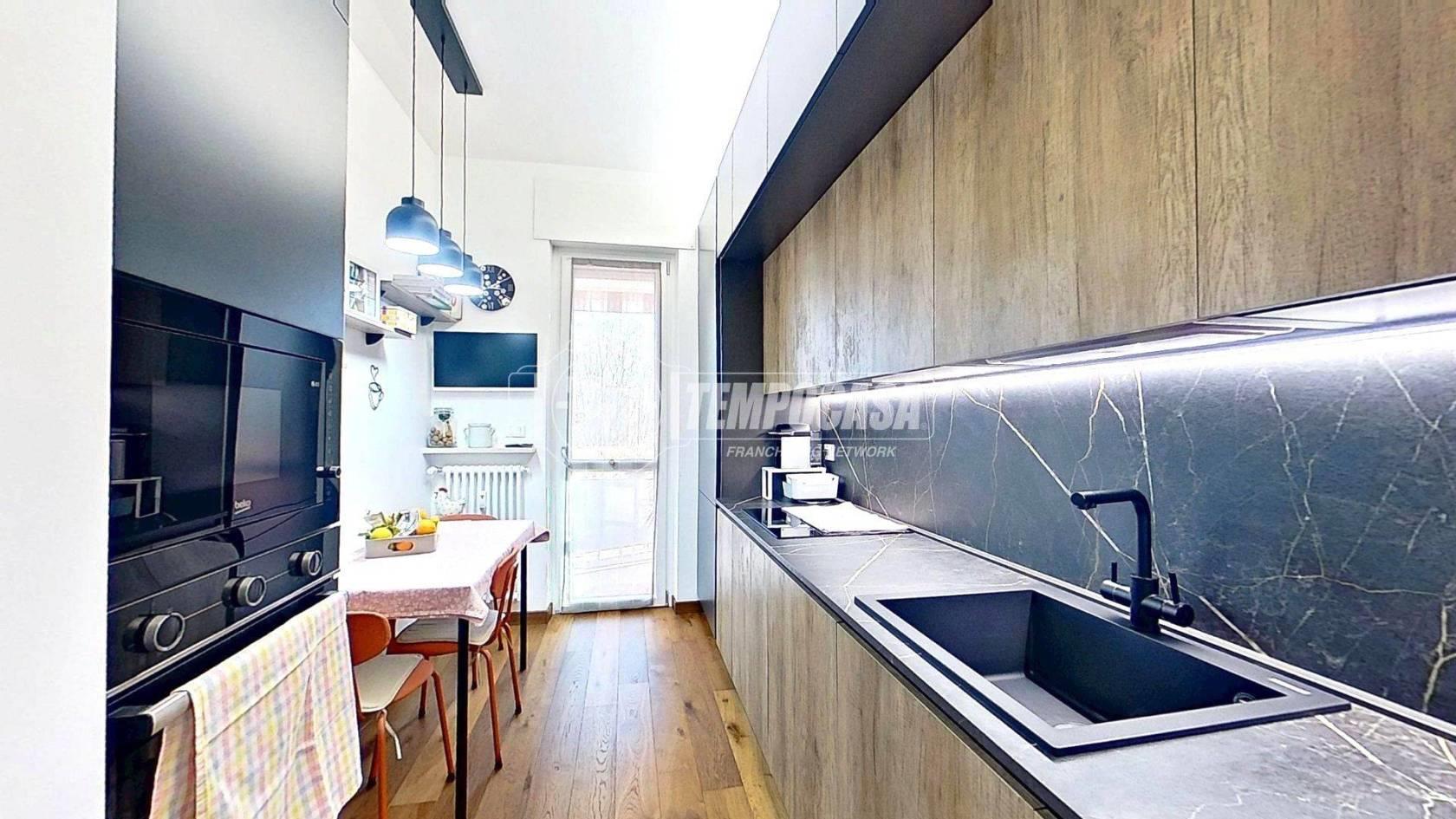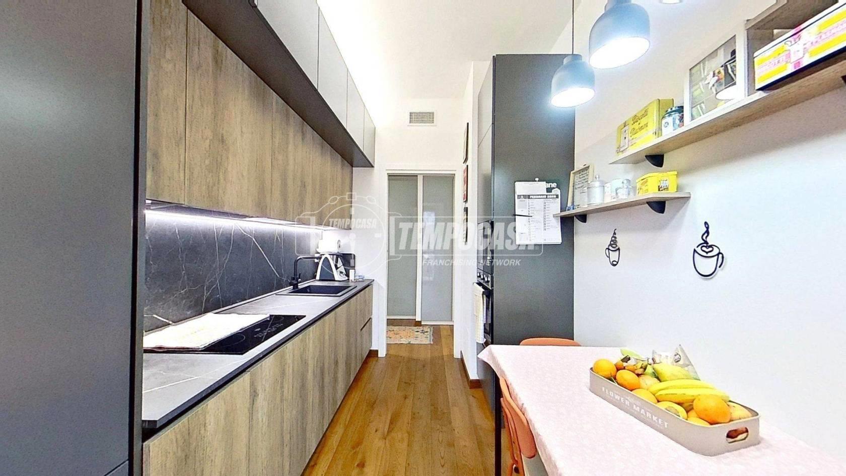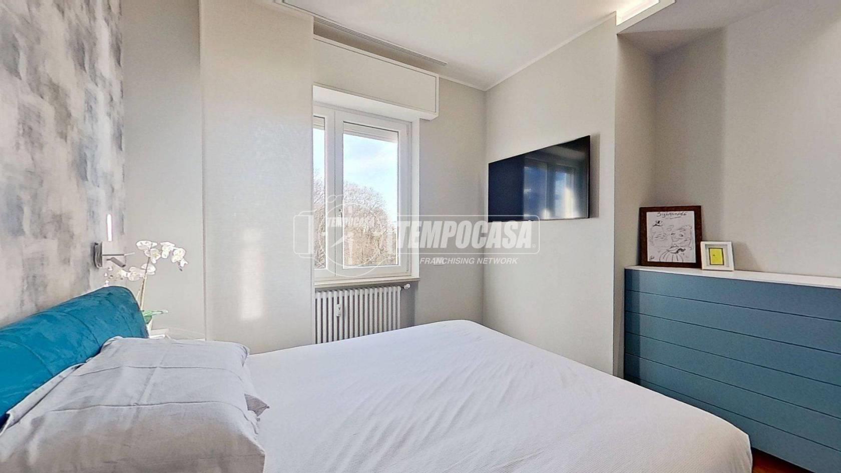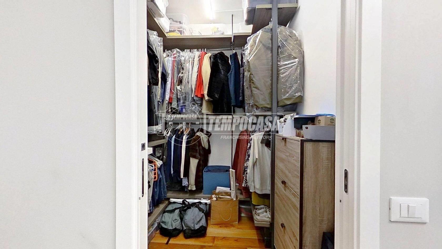 Proseguendo troviamo la cucina separata, funzionale e anch’essa con accesso al balcone, creando continuità tra gli spazi e un’ottima vivibilità quotidiana. In fondo al disimpegno si colloca il bagno, rifinito con materiali di pregio e completo di moderno box doccia. Accanto, la camera matrimoniale offre un ambiente intimo e ben organizzato, arricchito da una comoda cabina armadio.
