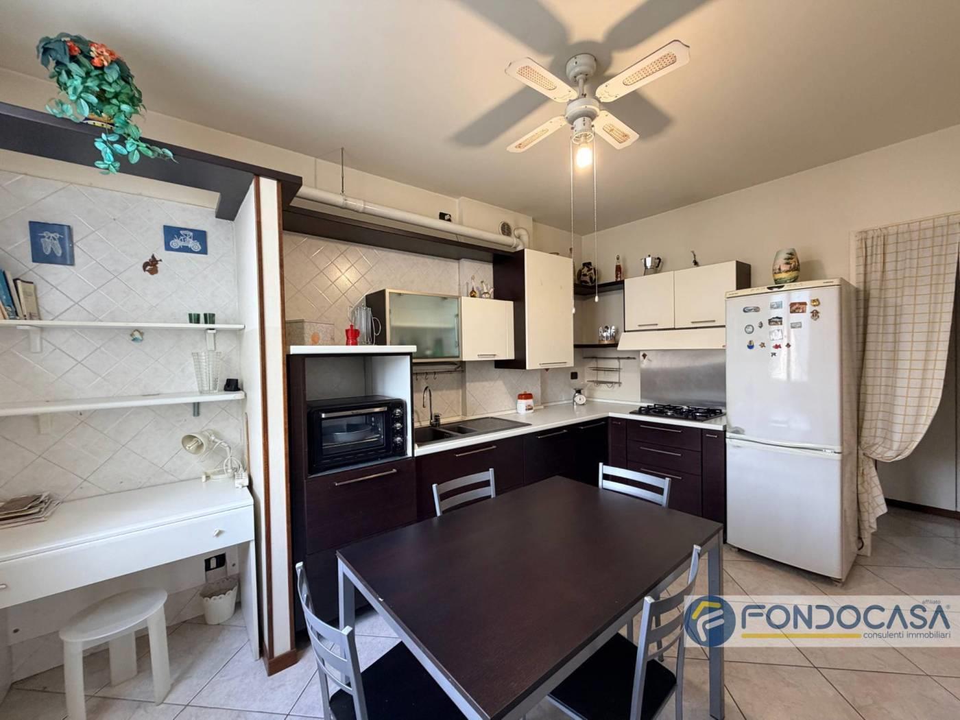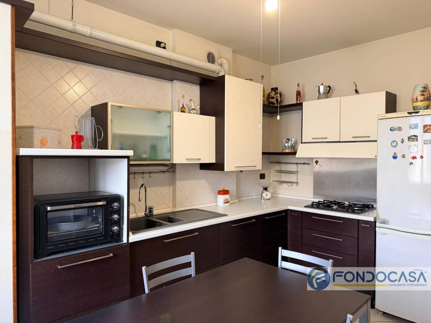 L'appartamento si apre sulla zona giorno composta da soggiorno e cucina abitabile, entrambi con accesso al balcone, oltre a bagno di servizio