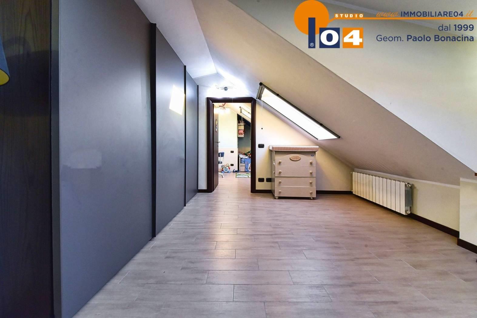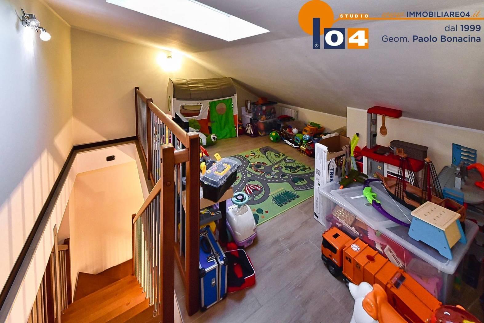Piano superiore (con secondo ingresso indipendente) . Ampio disimpegno‚ perfetto come area studio‚ hobby o lettura oltre a zona notte: camera matrimoniale‚ camera singola‚ due utili ripostigli e bagno.