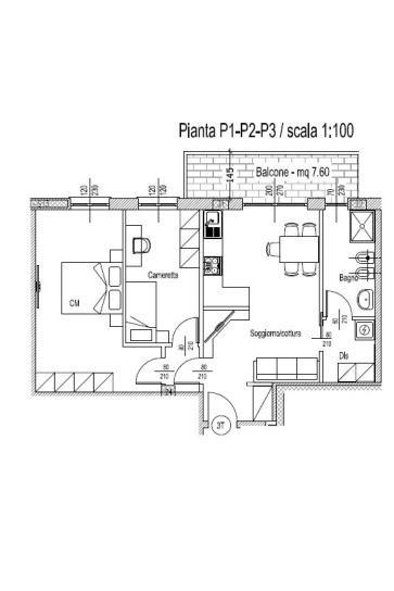 Trilocale di 70 mq, sito al PIANO TERZO, composto da ingresso che porta al luminoso soggiorno dal quale si accede al TERRAZZO DI 7,60 MQ, cucina a vista, bagno con accesso sullo stesso terrazzo, disimpegno, camera matrimoniale e cameretta.