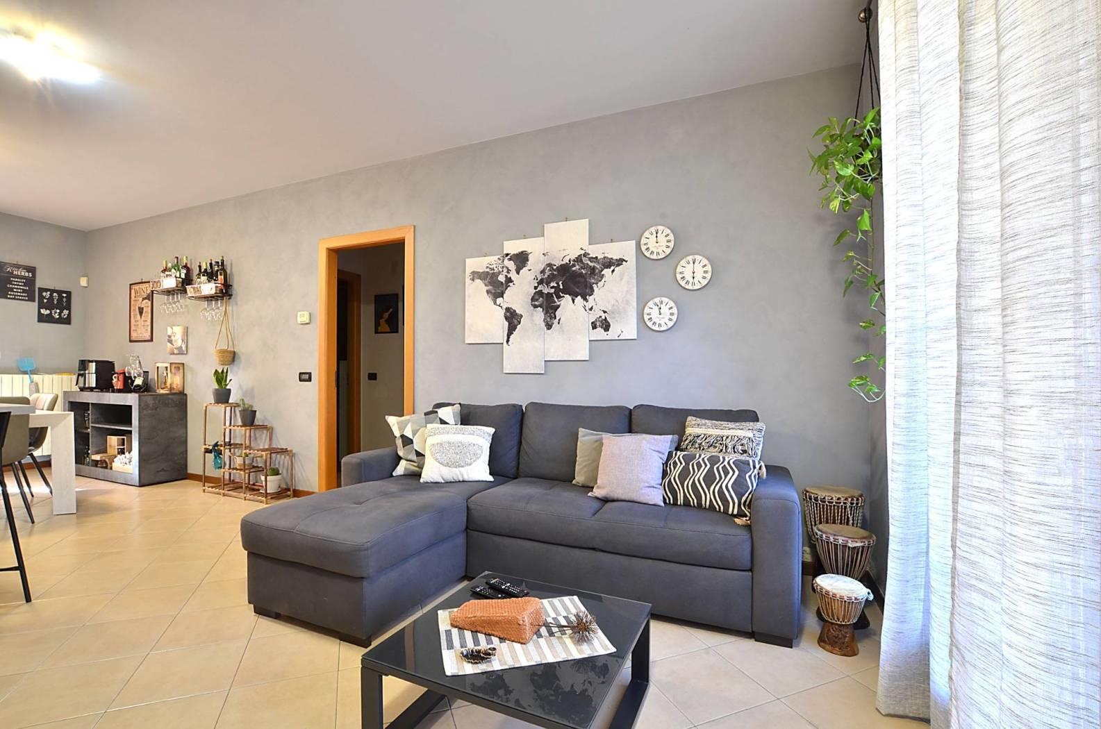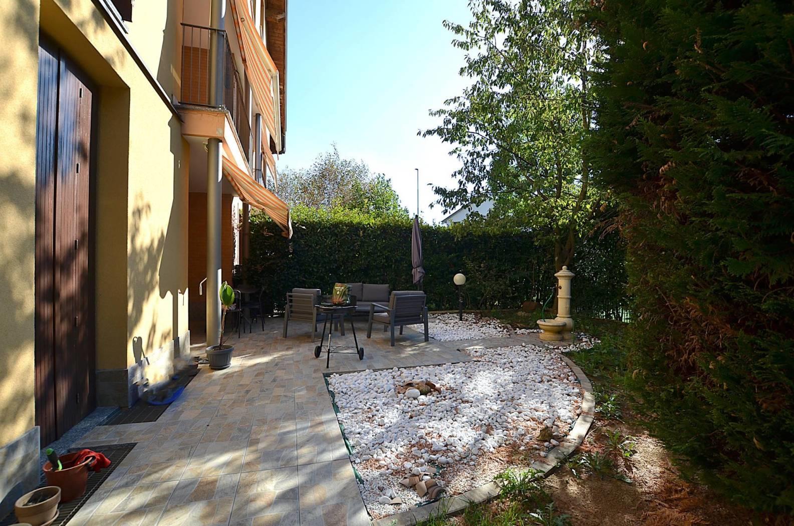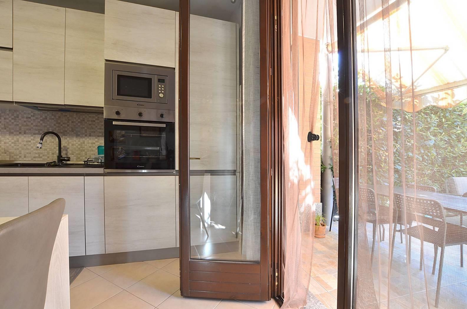 L'appartamento ha l'ingresso nella zona giorno composta dall'area relax e dalla zona cucina con ampio tavolo da pranzo; questo ambiente ha una doppia uscita, da un lato verso un portico e una zona pavimentata affacciata sull'interno del contesto e dall'altro verso un terrazzo coperto e la zona giardino, disposta su due lati dell'appartamento.
