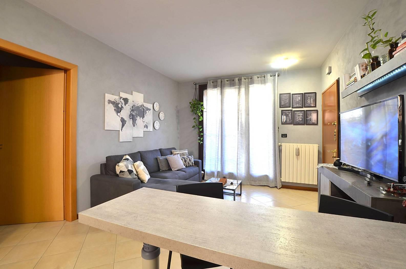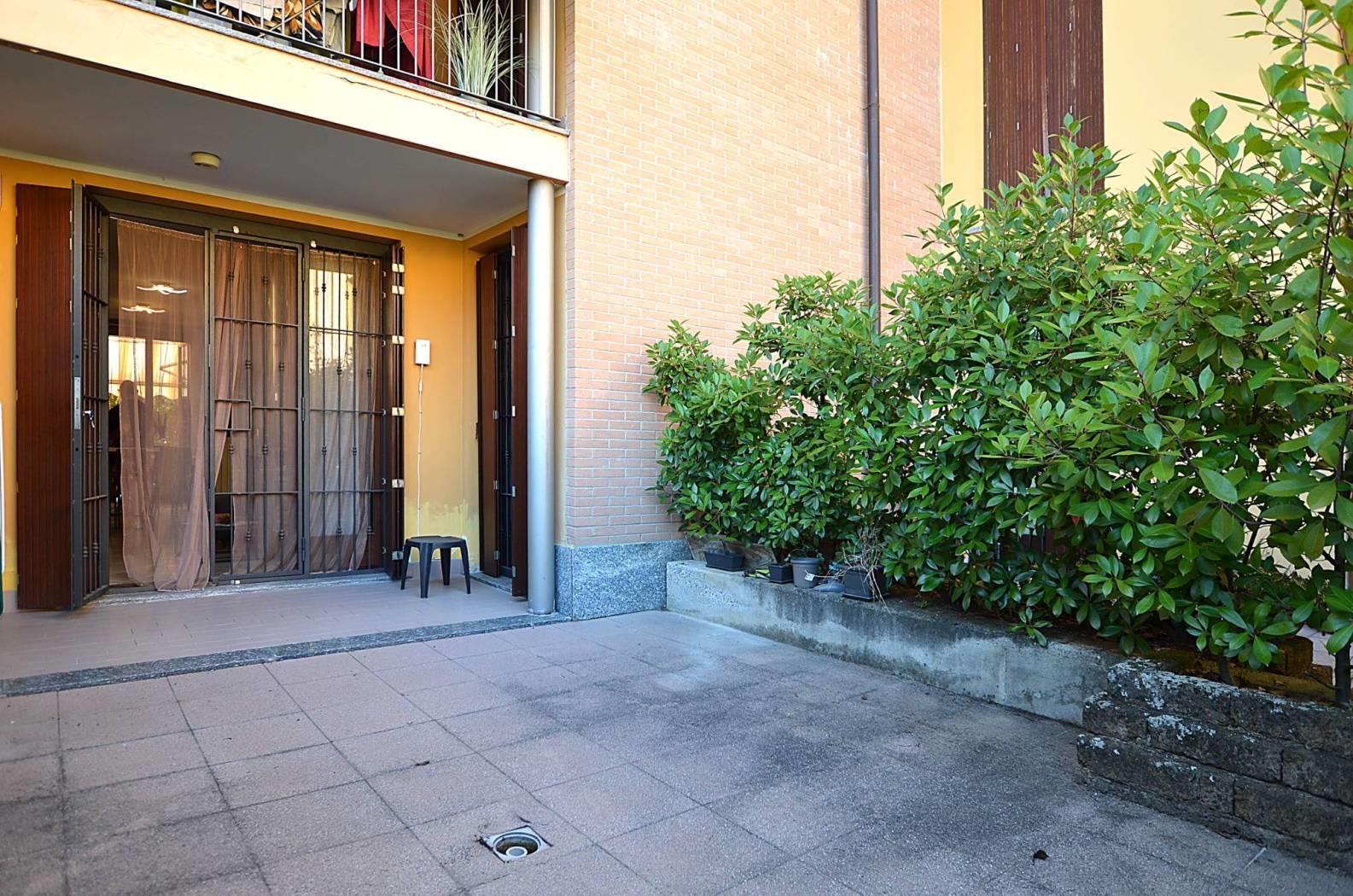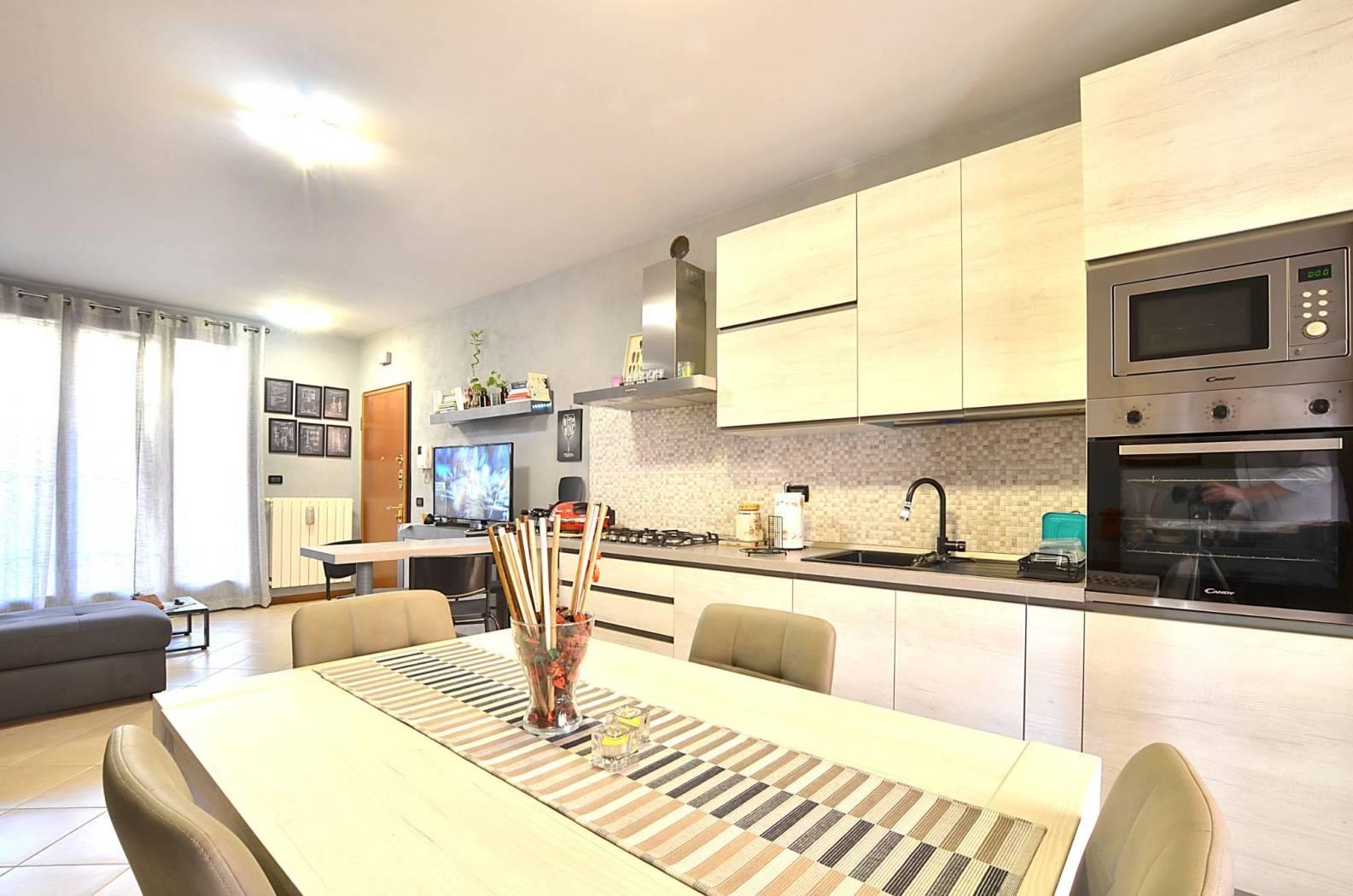 L'appartamento ha l'ingresso nella zona giorno composta dall'area relax e dalla zona cucina con ampio tavolo da pranzo; questo ambiente ha una doppia uscita, da un lato verso un portico e una zona pavimentata affacciata sull'interno del contesto e dall'altro verso un terrazzo coperto e la zona giardino, disposta su due lati dell'appartamento.
