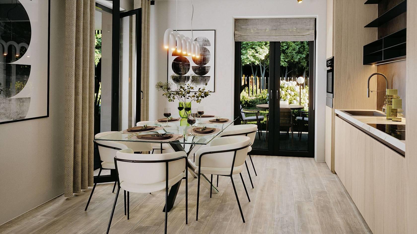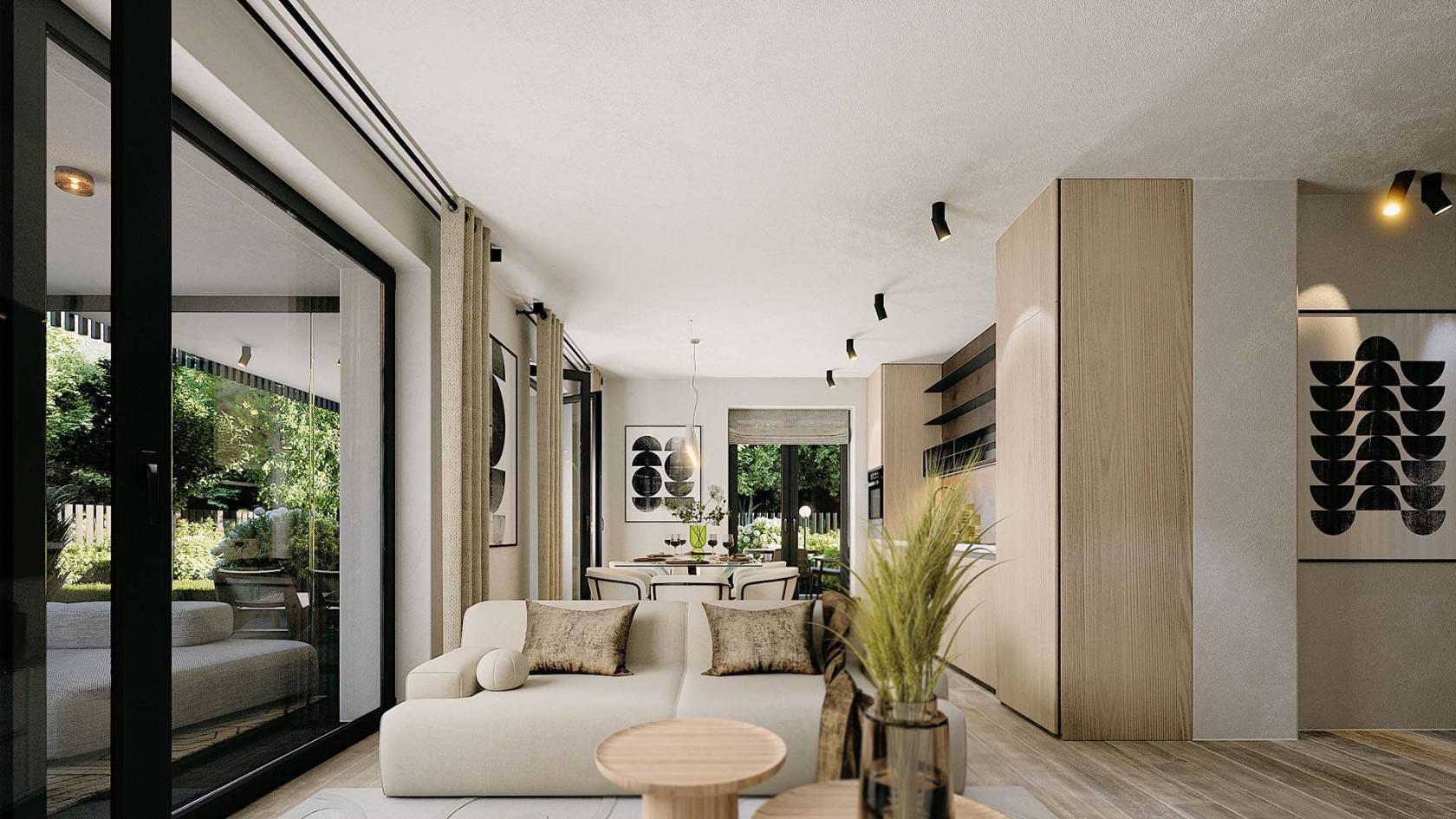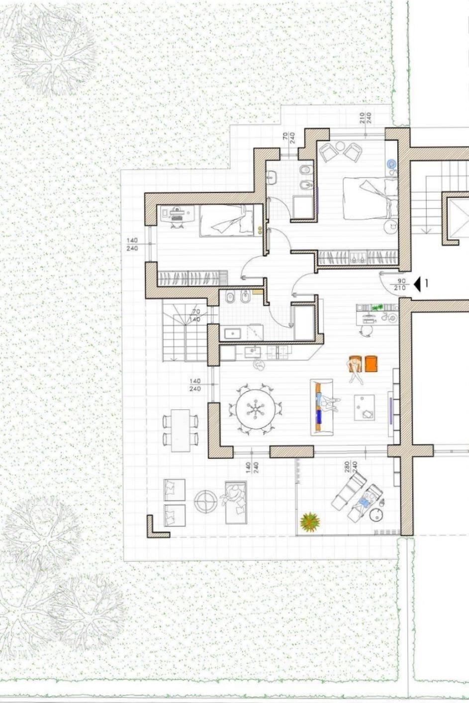 -L'appartamento A1 è così composto: al piano terra, ingresso su ampia zona giorno con cucina a vista, la doppia esposizione Sud ed Ovest ci permette di avere sempre un ottima luminosità attraverso le ampie porte finestre dalle quali si accede anche al portico ed al giardino privato oltre che al "giardino d'inverno". La zona notte è caratterizzata da ampie camere esposte a Nord ed Ovest. L'appartamento è dotato di doppi servizi finestrati.