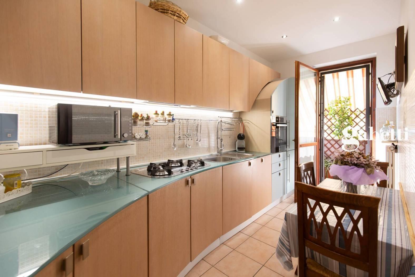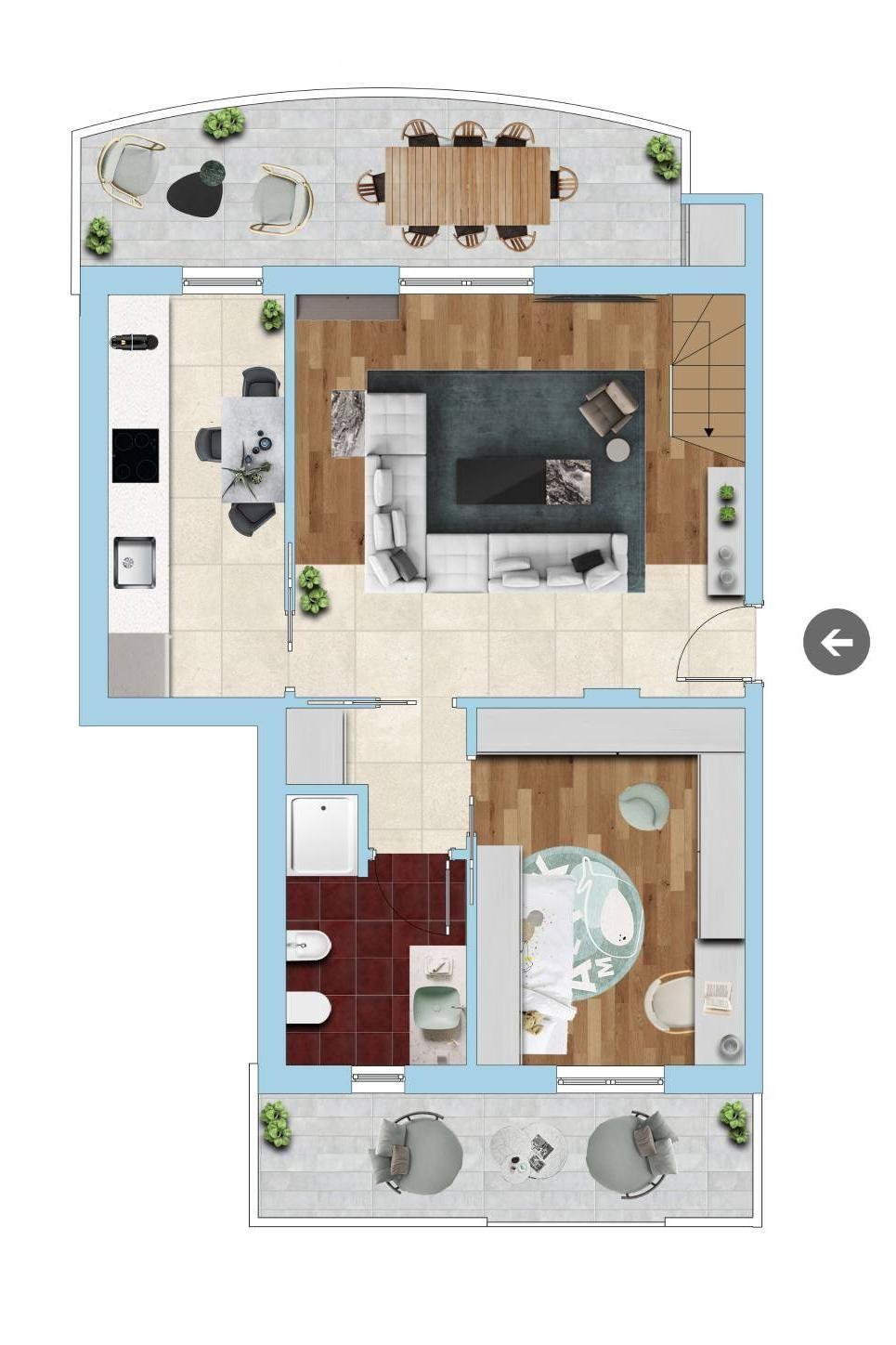 L'unità immobiliare è composta da un ampio salone con terrazzo, una cucina abitabile, un bagno e una camera da letto al piano primo. Un elegante scala in muratura rivestita in marmo ci porta in una caratteristica mansarda dove troviamo un balconcino coperto, una spaziosa camera matrimoniale in suite con letto in diagonale, cabina armadio e bagno.