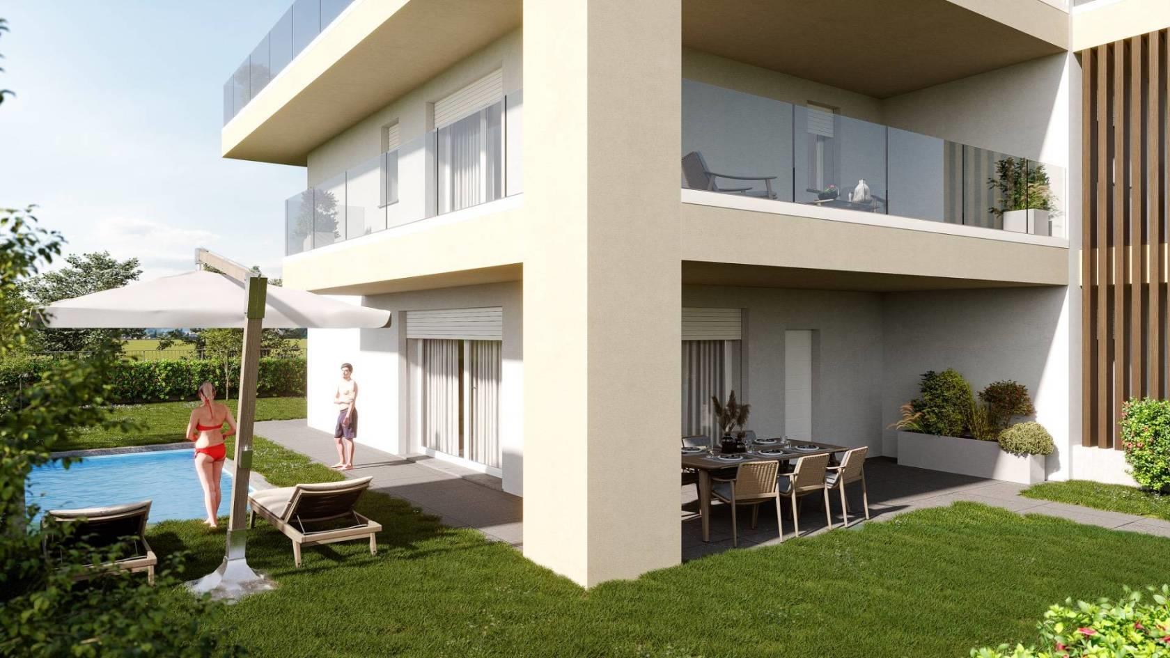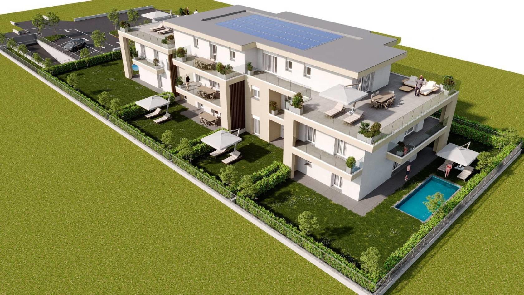 Bernareggio - Proponiamo un esclusivo appartamento in costruzione, situato al piano terra di una minipalazzina con giardino privato di 150 mq dove è possibile ammirare degli scorci di tramonto circondato dalla tranquillità assoluta. L'appartamento è composto da un ampio salone con vetrata panoramica scorrevole, una cucina abitabile, tre camere di cui una con cabina armadio e bagno privato oltre ad un secondo bagno. L'immobile è dotato di un impianto di riscaldamento autonomo con pompa di calore e pannelli fotovoltaici posati sulla copertura, che permetteranno di gestire al meglio i consumi. Gli infissi e le finestre saranno in triplo vetro PVC, garantendo isolamento termico e acustico.