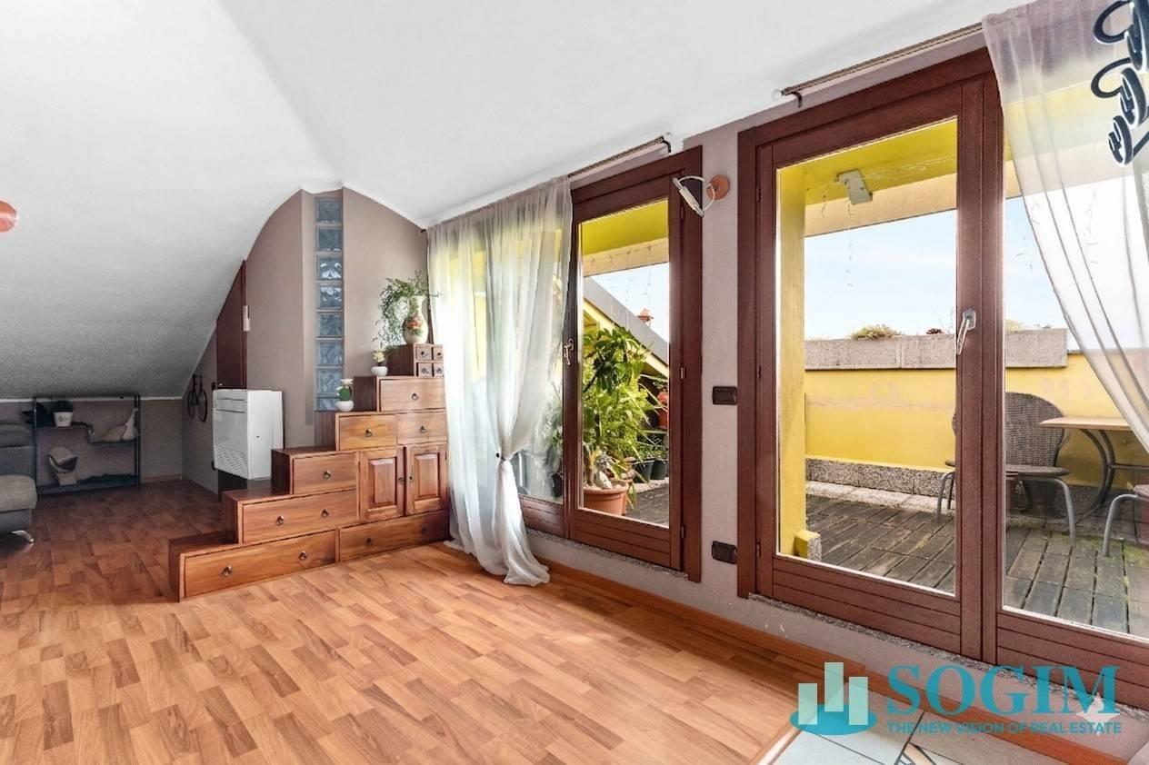 L'ingresso conduce alla luminosa zona living con cucina a vista e spazio pranzo, valorizzata da ampie vetrate scorrevoli che permettono l'accesso al gradevole terrazzino, ideale per momenti di relax.