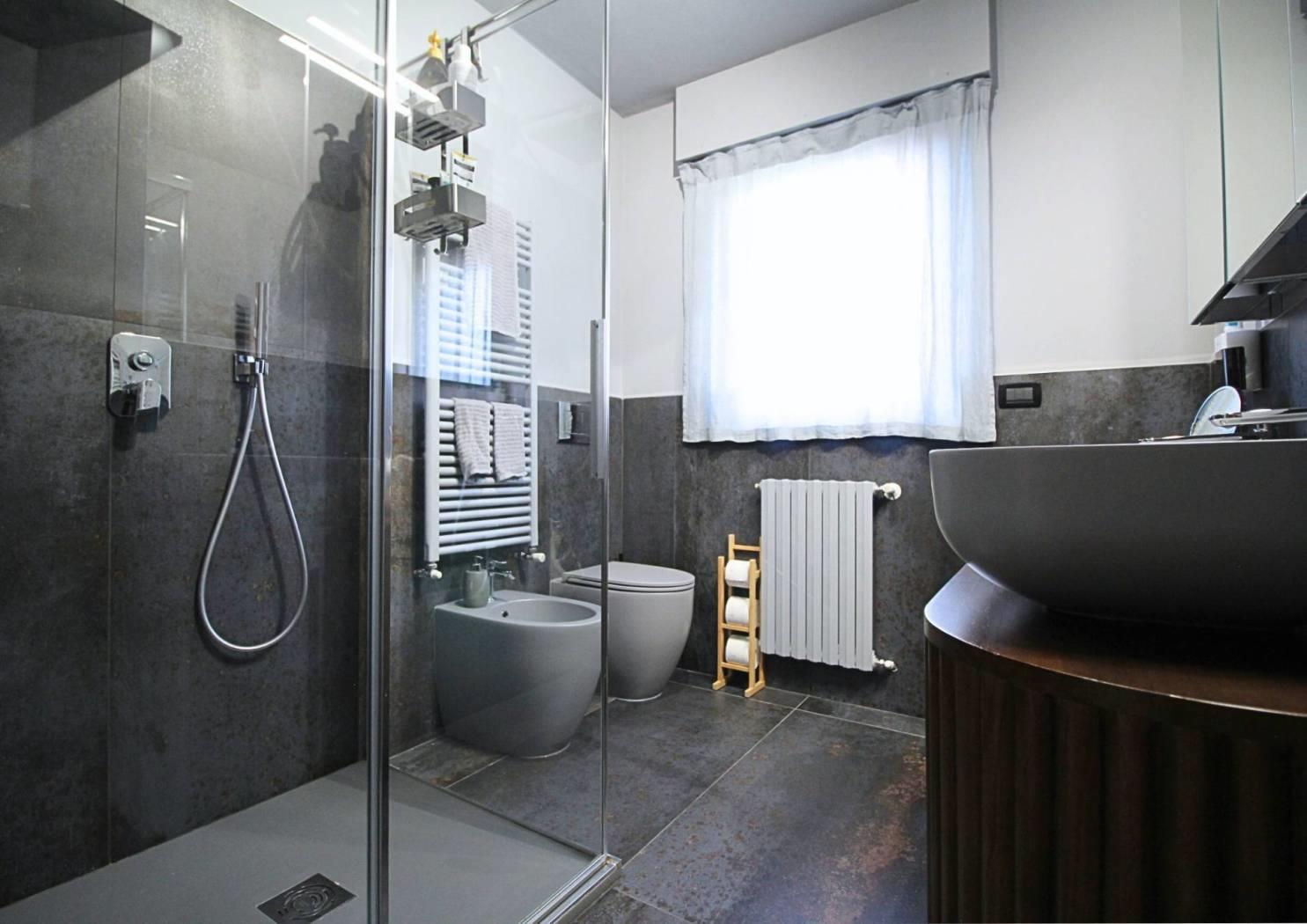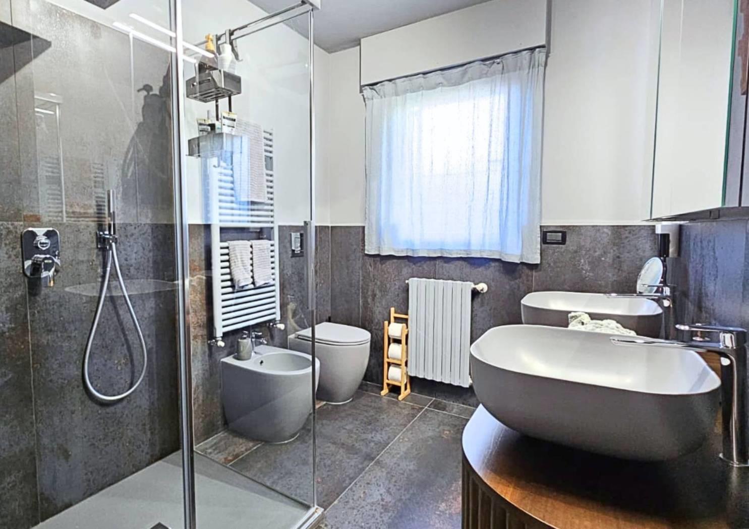 Il bagno è moderno, con doccia walk-in di ampie dimensioni e doppio lavabo. La camera matrimoniale è ben proporzionata e accogliente.