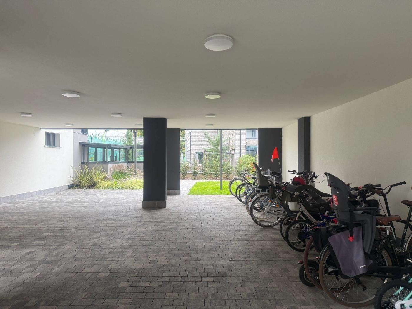 Inoltre, il giardino condominiale con panchine offre uno spazio verde dove trascorrere piacevoli momenti all'aria aperta. Completano la proposta un box singolo e una cantina, oltre a posteggi per biciclette e possibilità di parcheggio esterno. Situato in una zona strategica, comoda per le tangenziali e vicina a centri commerciali.