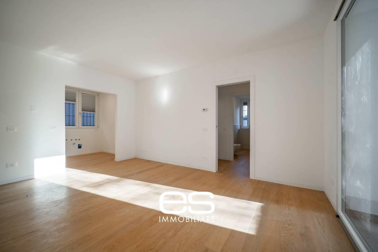 La soluzione è così composta: ingresso prospicente un ampio e luminoso soggiorno caratterizzato da una splendida vetrata con serramento scorrevole che si apre su una loggia coperta.