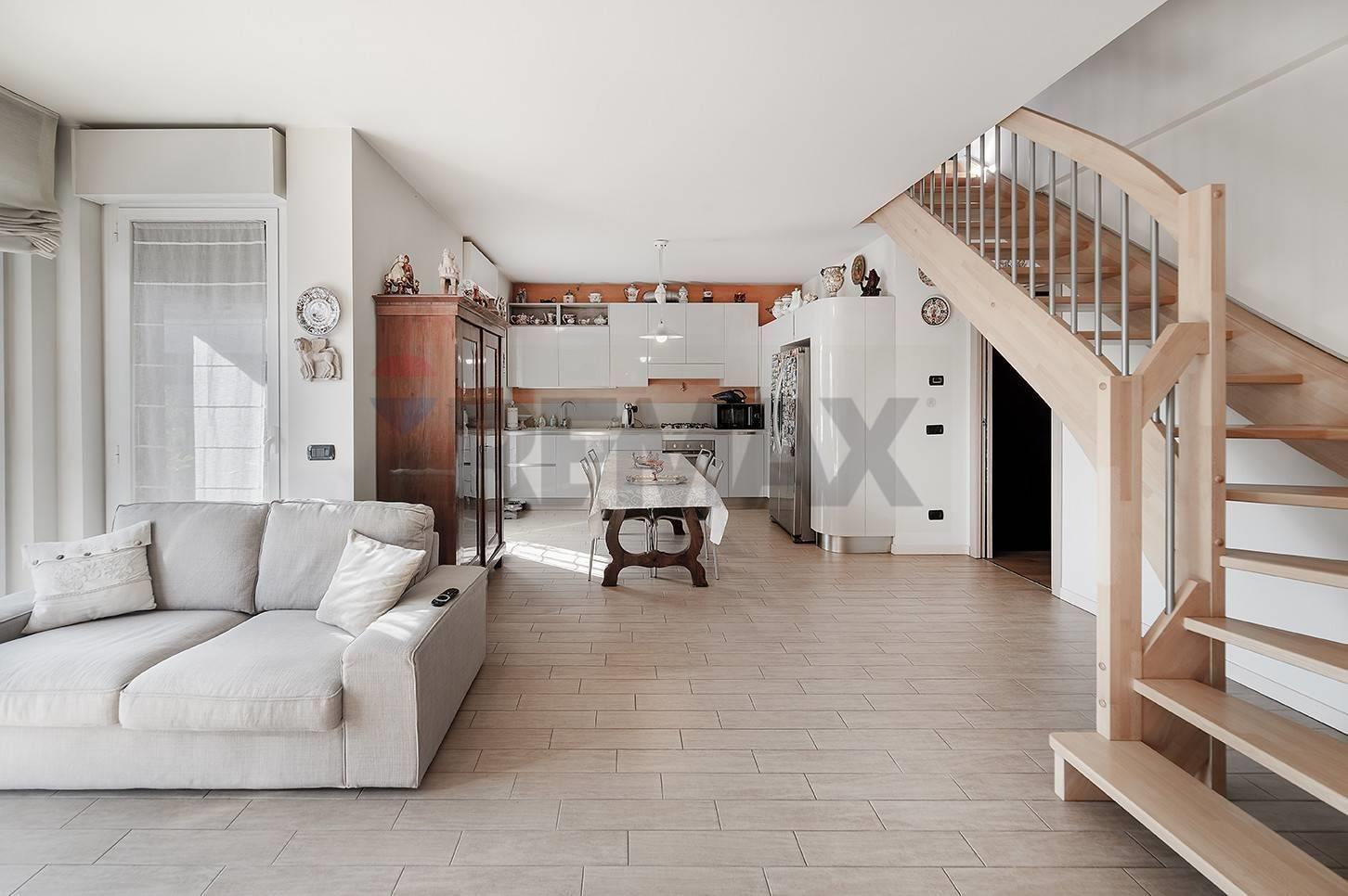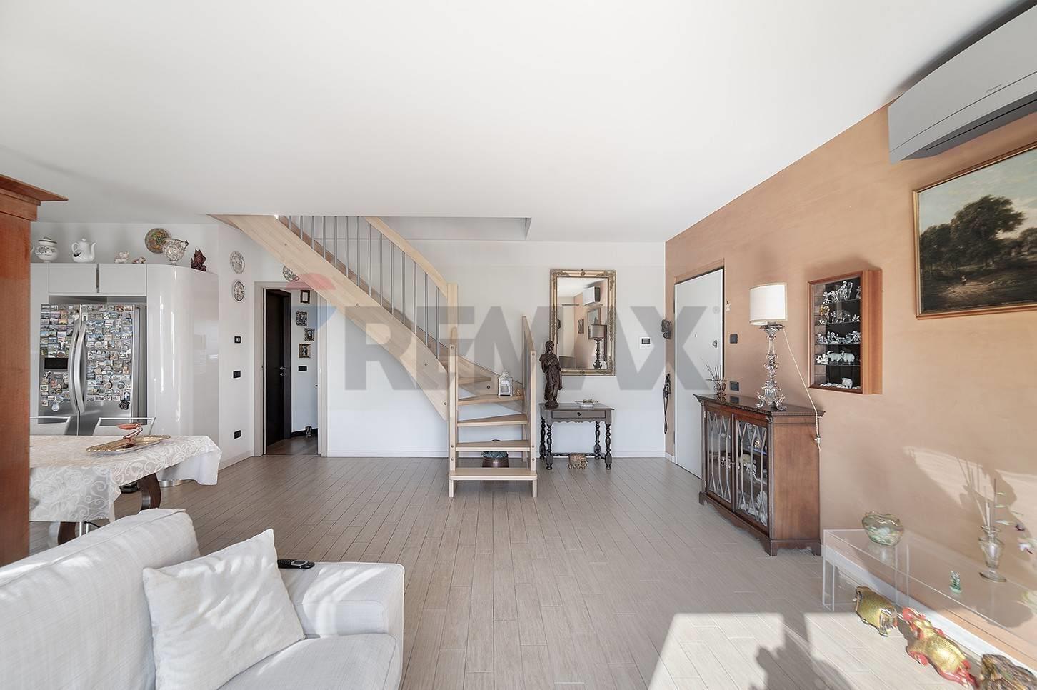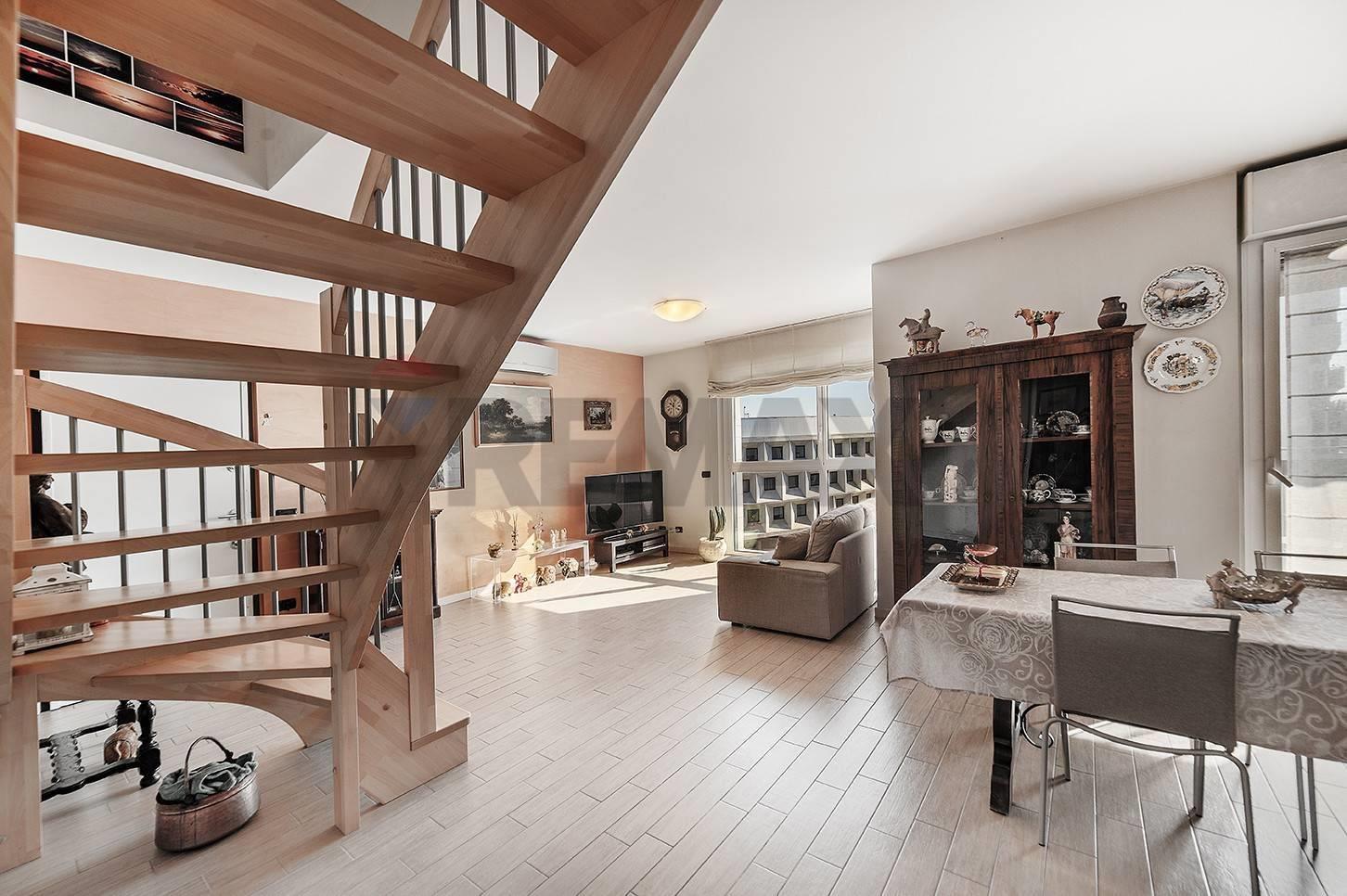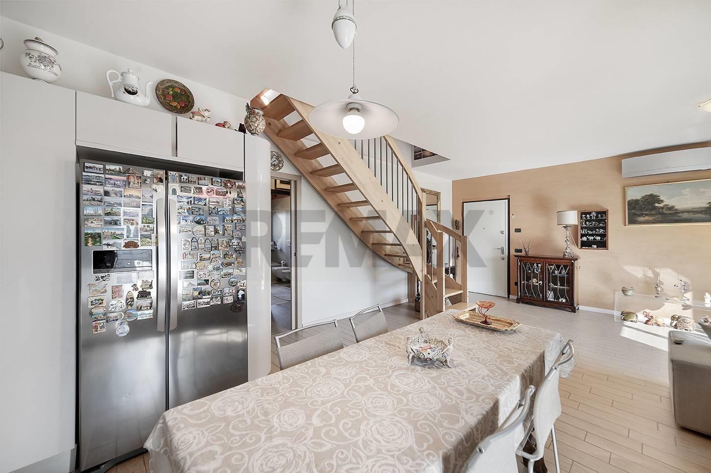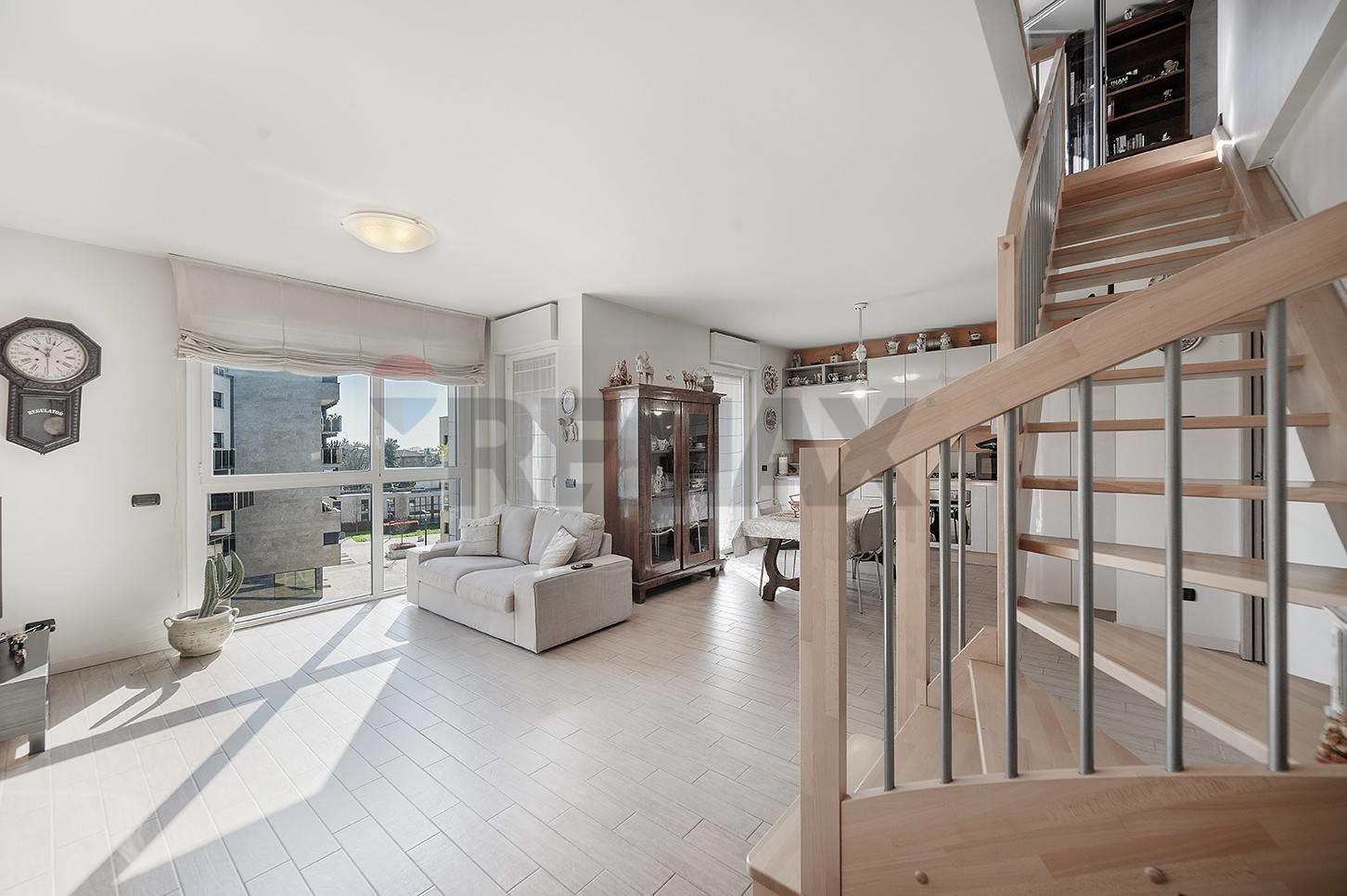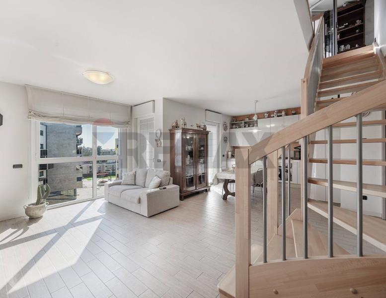 La proprietà si sviluppa su una superficie complessiva di 100 mq circa con un'ampia zona giorno al piano con pavimentazione in grès effetto legno, cucina a vista e uscita sul primo terrazzo dell'appartamento, un disimpegno che accompagna alla zona notte rivestita in parquet con una spaziosa camera matrimoniale che si affaccia su una balconata e un bagno finestrato con vasca, sanitari sospesi e scaldasalviette; la comoda scala interna in legno accompagna al piano mansardato dove si trova un'ampia zona open space interamente rivestita in parquet da adibire a camera ulteriore, zona hobby, studio o gym, con un piccolo vano oggi ad uso cabina armadio e un servizio completo finestrato; vero plus, l'uscita sull'ampia terrazza solarium.