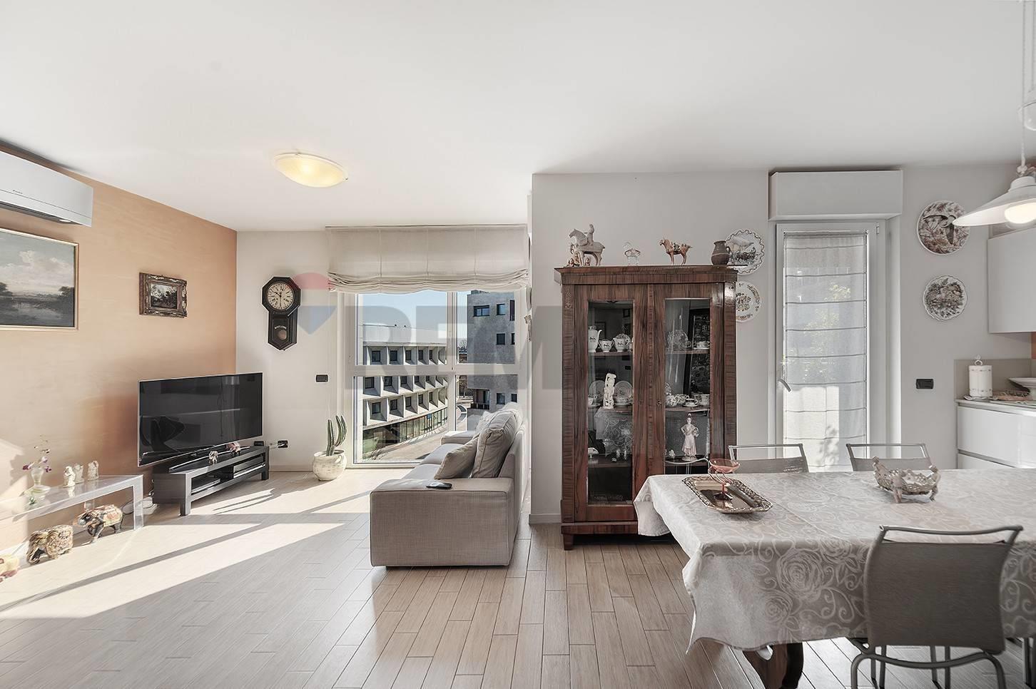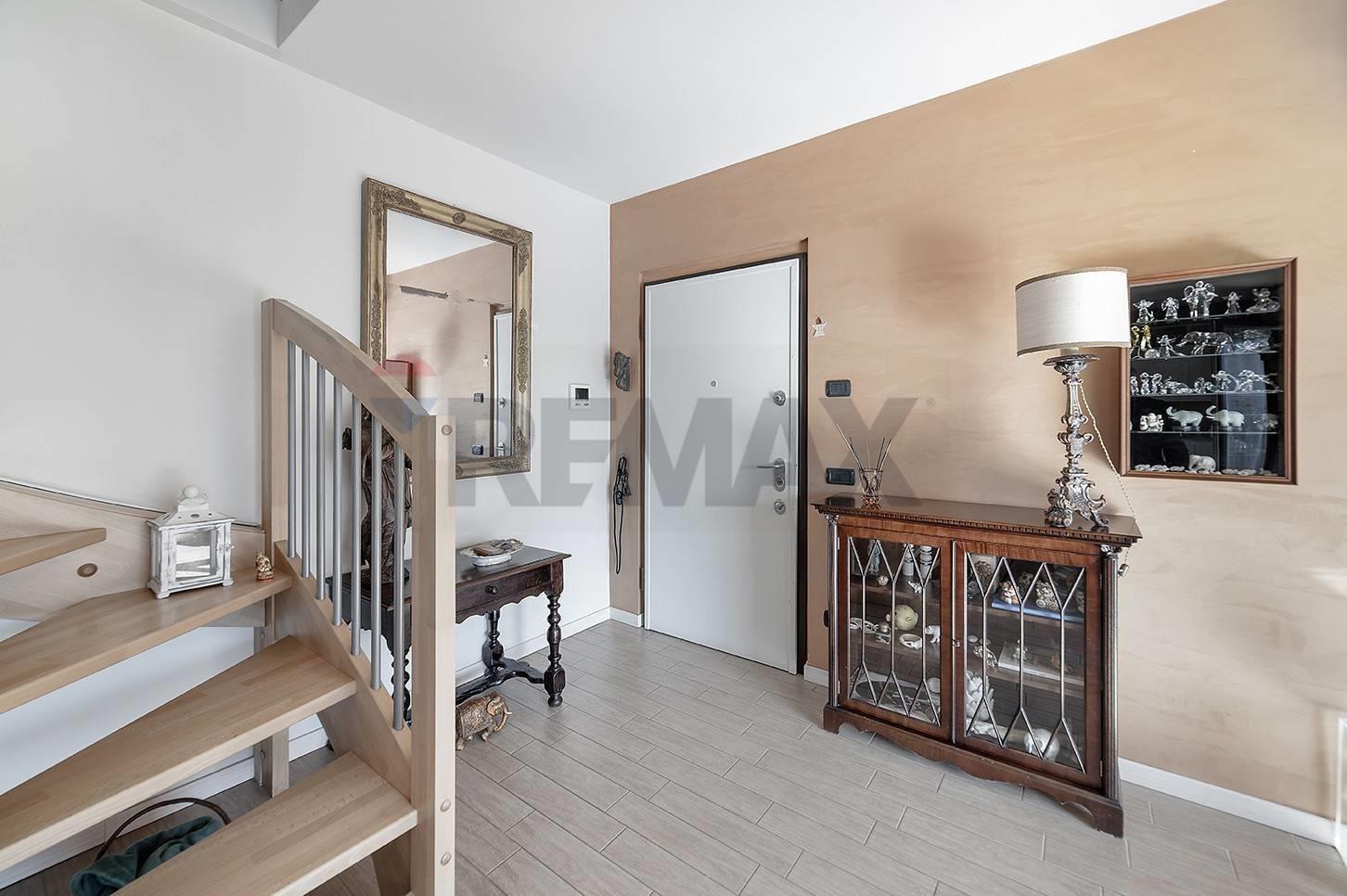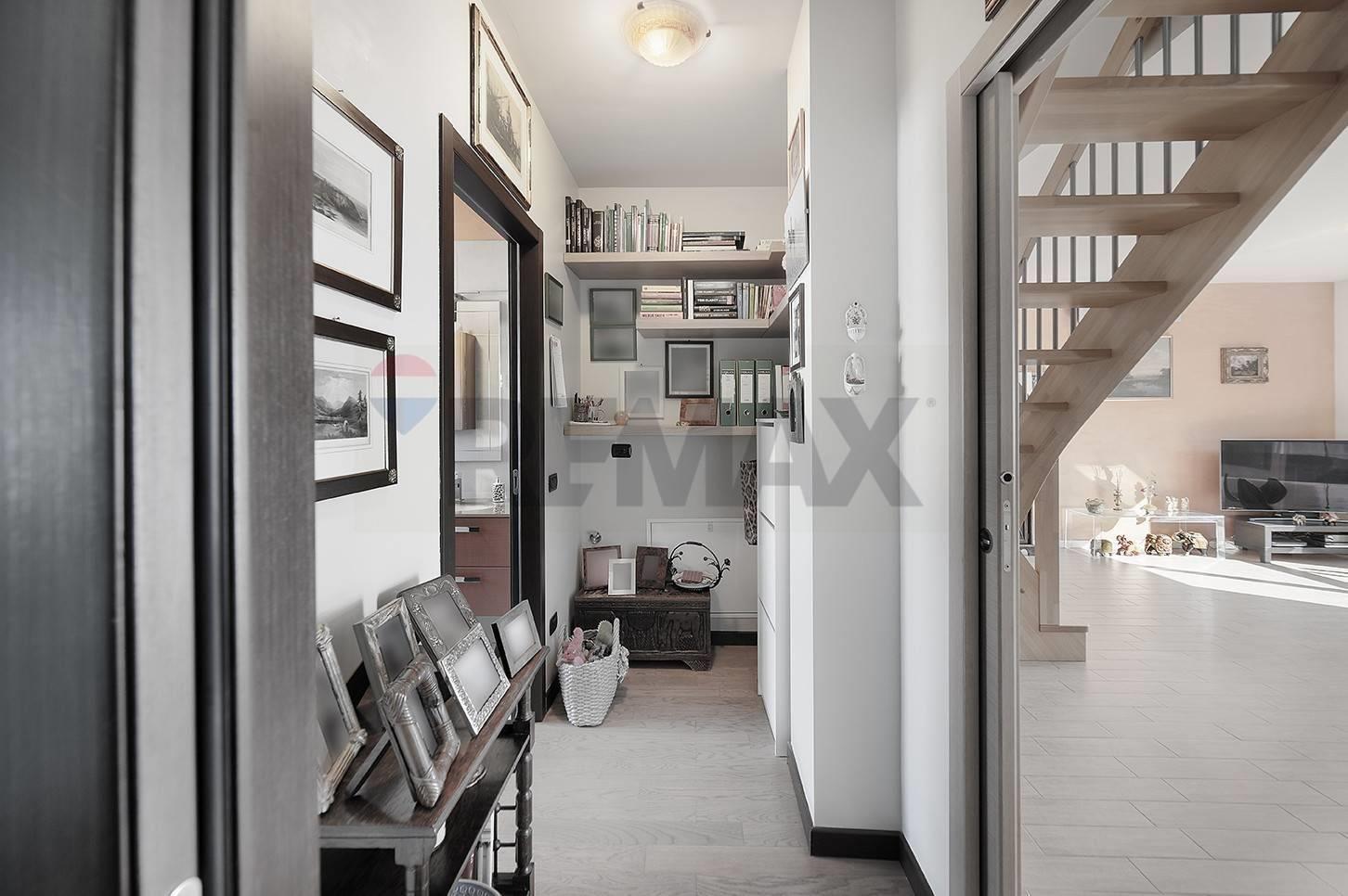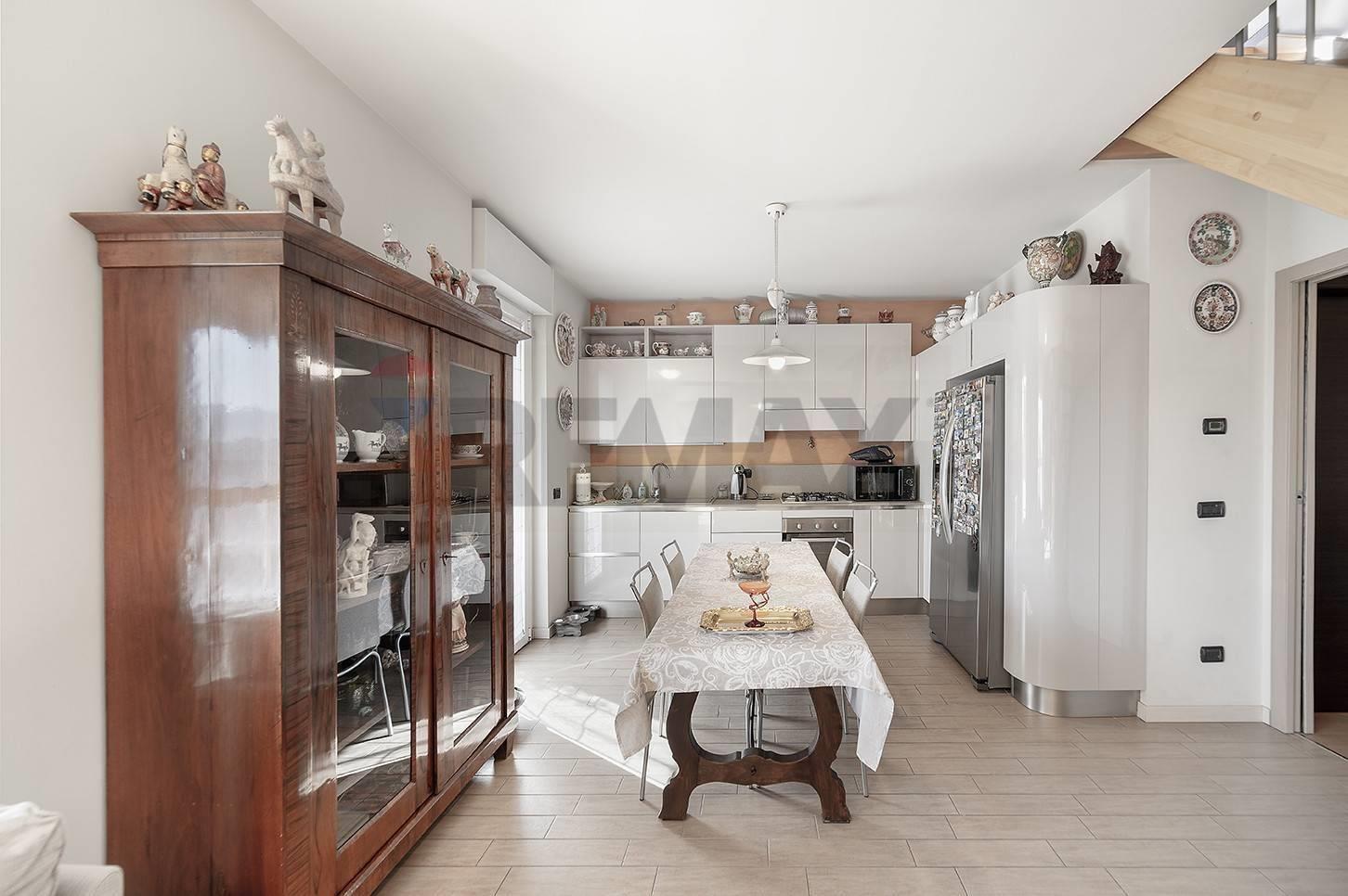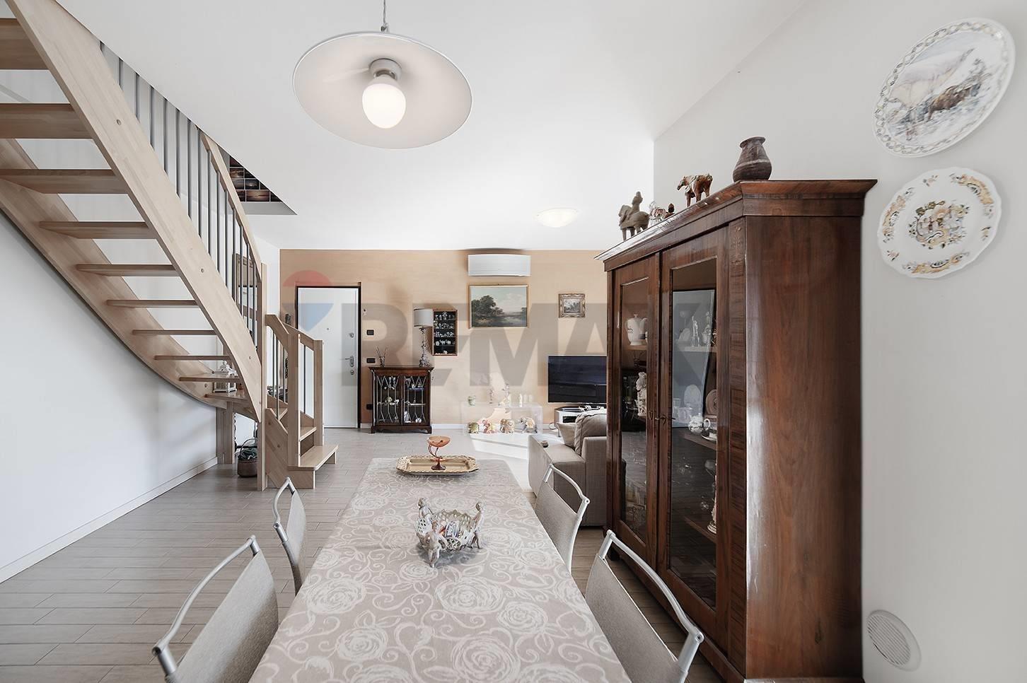 La proprietà si sviluppa su una superficie complessiva di 100 mq circa con un'ampia zona giorno al piano con pavimentazione in grès effetto legno, cucina a vista e uscita sul primo terrazzo dell'appartamento, un disimpegno che accompagna alla zona notte rivestita in parquet con una spaziosa camera matrimoniale che si affaccia su una balconata e un bagno finestrato con vasca, sanitari sospesi e scaldasalviette; la comoda scala interna in legno accompagna al piano mansardato dove si trova un'ampia zona open space interamente rivestita in parquet da adibire a camera ulteriore, zona hobby, studio o gym, con un piccolo vano oggi ad uso cabina armadio e un servizio completo finestrato; vero plus, l'uscita sull'ampia terrazza solarium.