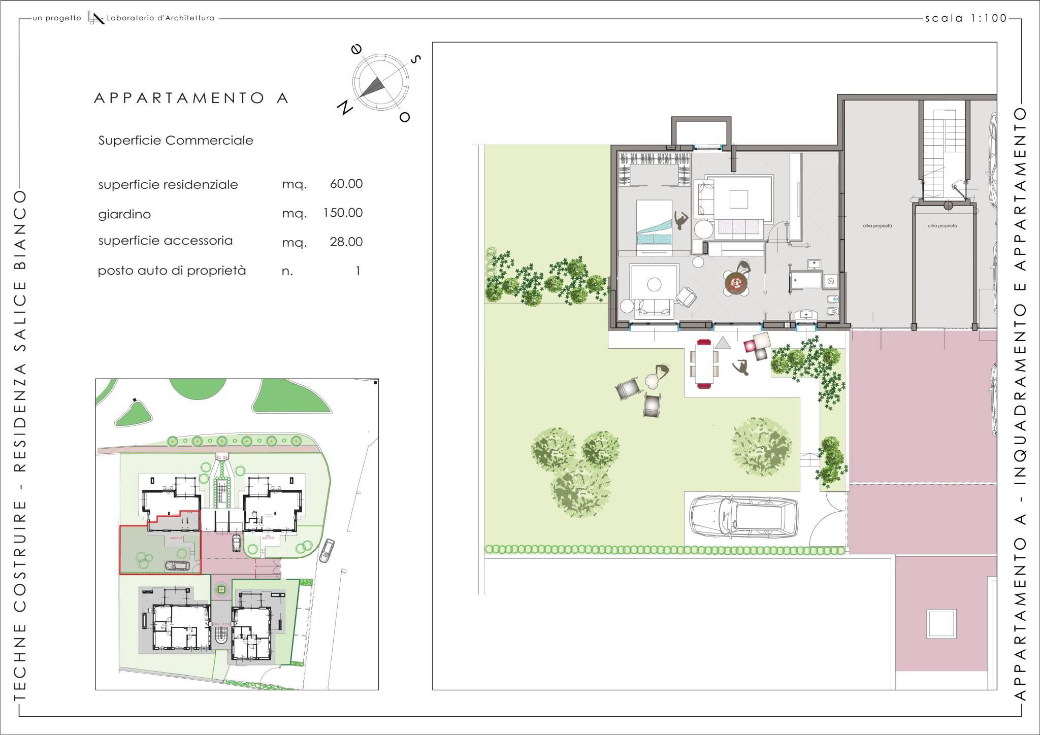 La soluzione qui proposta, prevede un appartamento di 2 locali al piano terra con giardino di proprietà e portico.