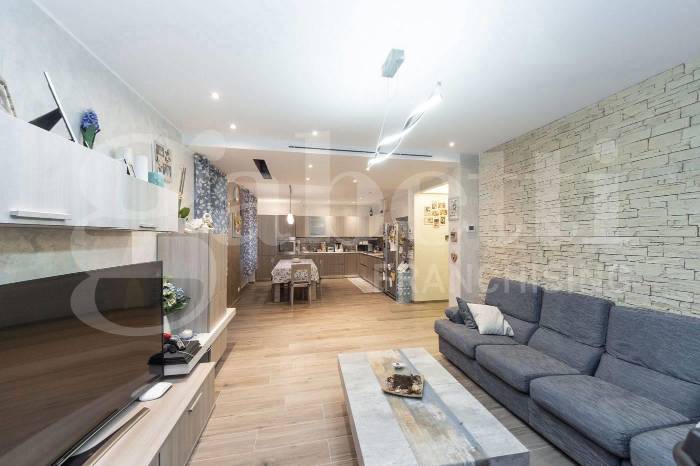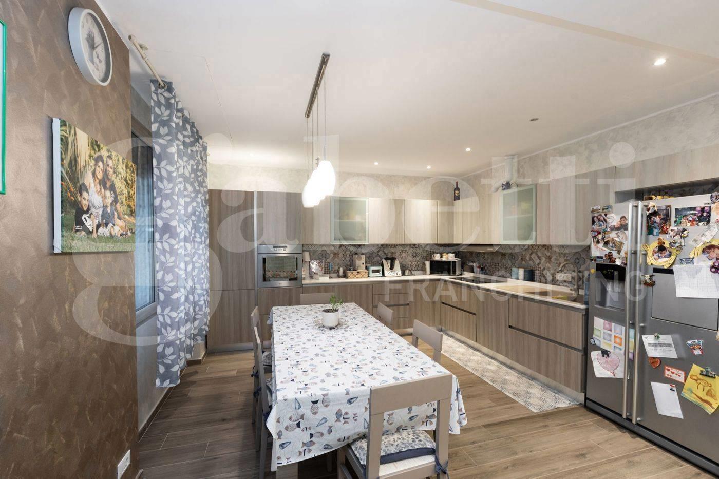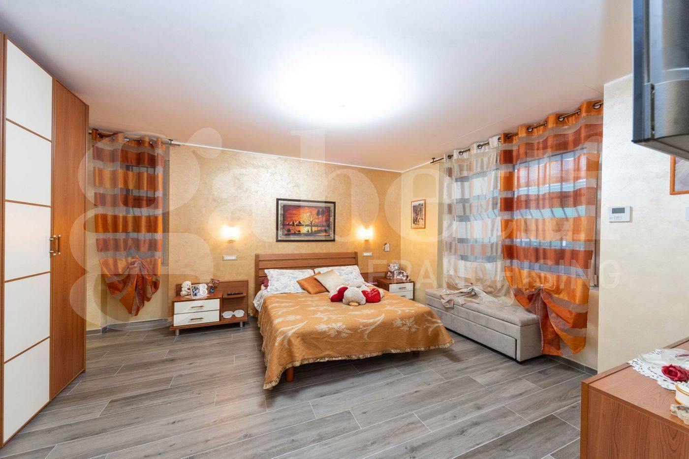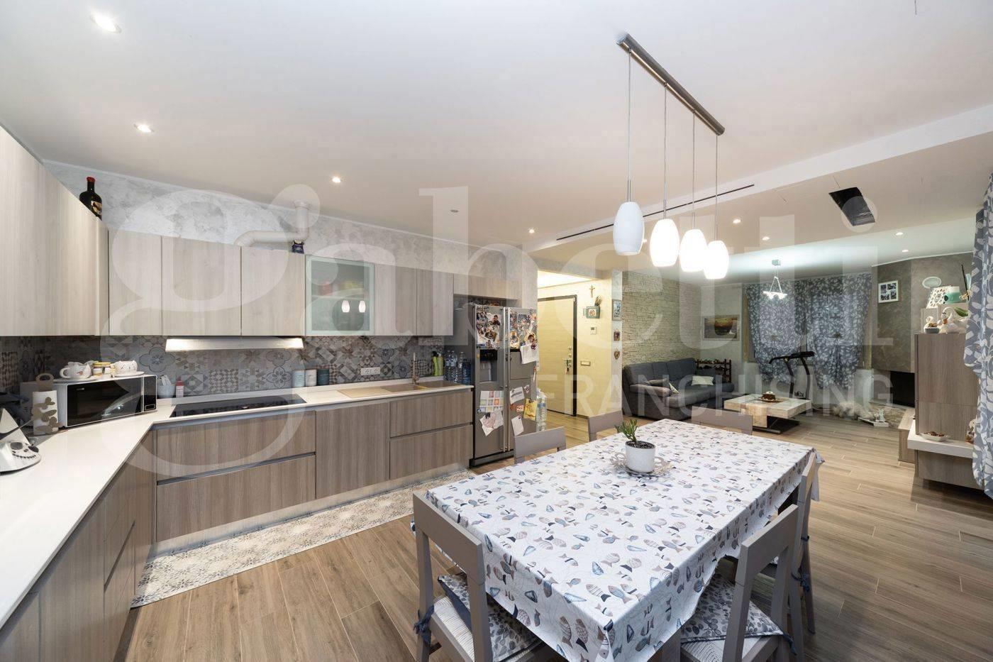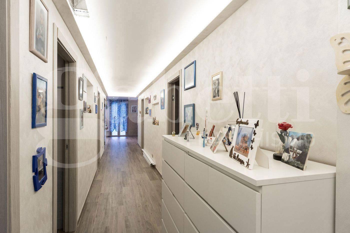 Gli interni sono luminosi grazie alle grandi finestre con infissi moderni di ultima generazione dotati di zanzariere e grate antintrusione; il soggiorno doppio accoglie gli ospiti con finiture raffinate tra cui una parete effetto pietra naturale, camino angolare moderno e illuminazione a faretti LED incassati sul soffitto. Gli spazi risultano ottimamente distribuiti lungo un corridoio principale che conduce alle camere da letto spaziose ed alla cucina abitabile (eventualmente separabile), garantendo praticità sia negli eventi conviviali che nella vita quotidiana.