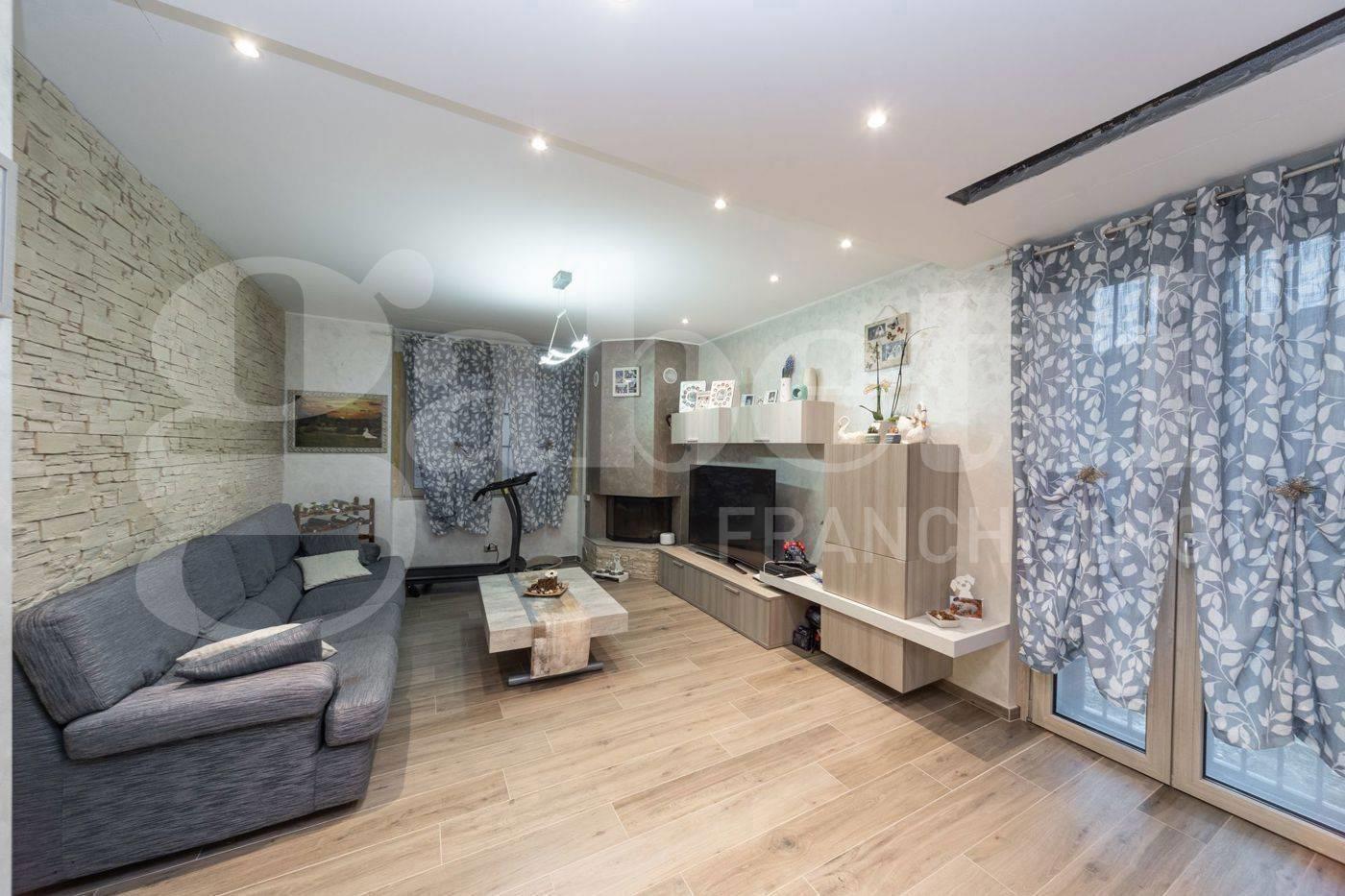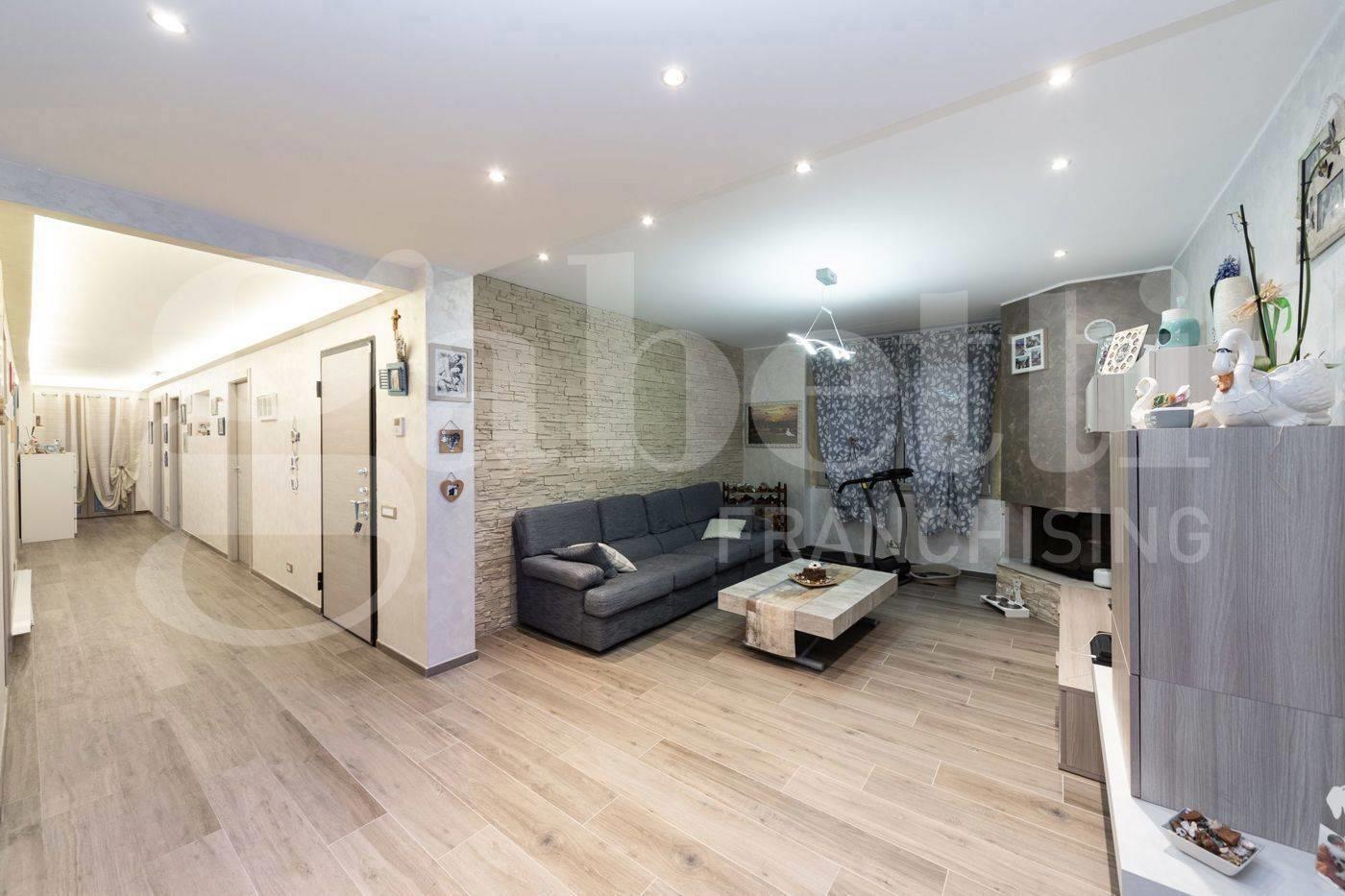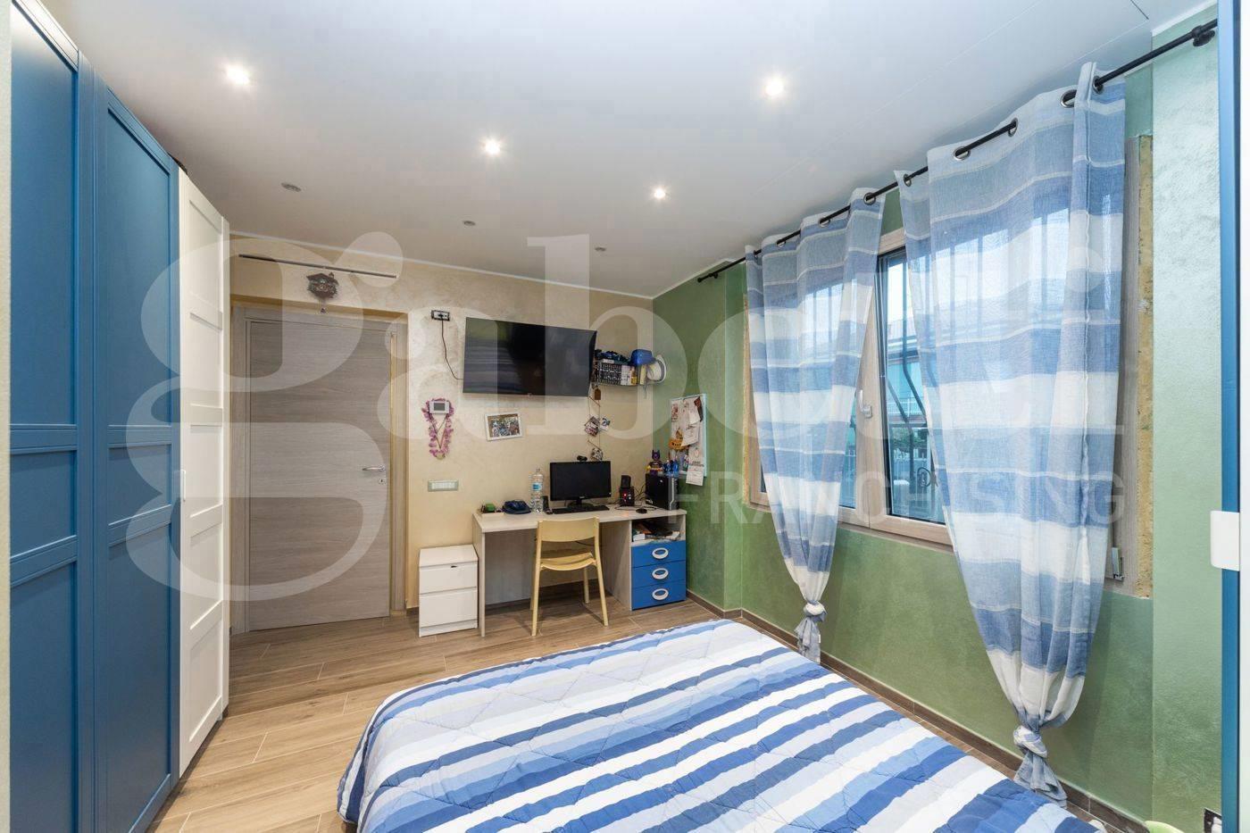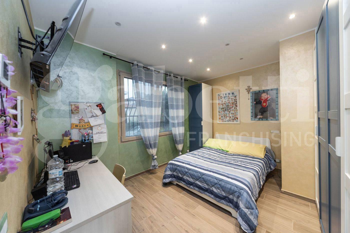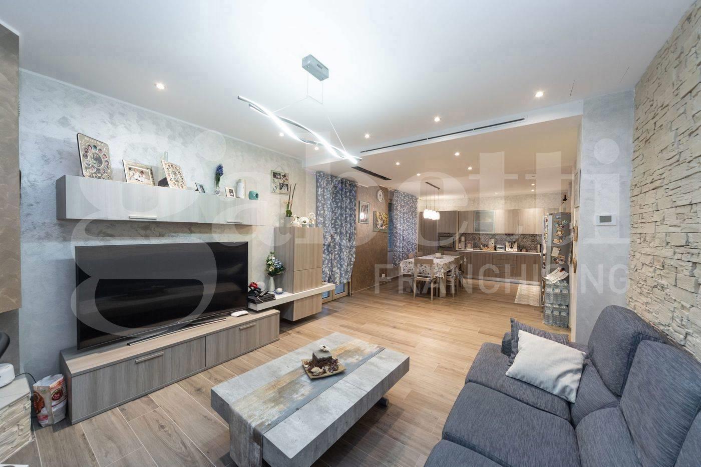 Gli interni sono luminosi grazie alle grandi finestre con infissi moderni di ultima generazione dotati di zanzariere e grate antintrusione; il soggiorno doppio accoglie gli ospiti con finiture raffinate tra cui una parete effetto pietra naturale, camino angolare moderno e illuminazione a faretti LED incassati sul soffitto. Gli spazi risultano ottimamente distribuiti lungo un corridoio principale che conduce alle camere da letto spaziose ed alla cucina abitabile (eventualmente separabile), garantendo praticità sia negli eventi conviviali che nella vita quotidiana.