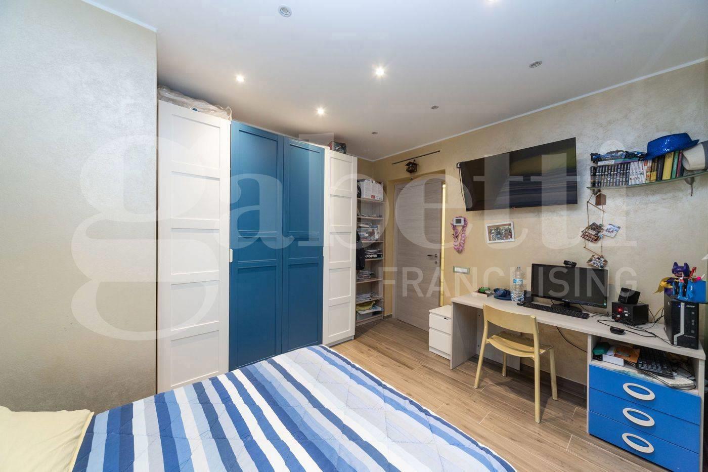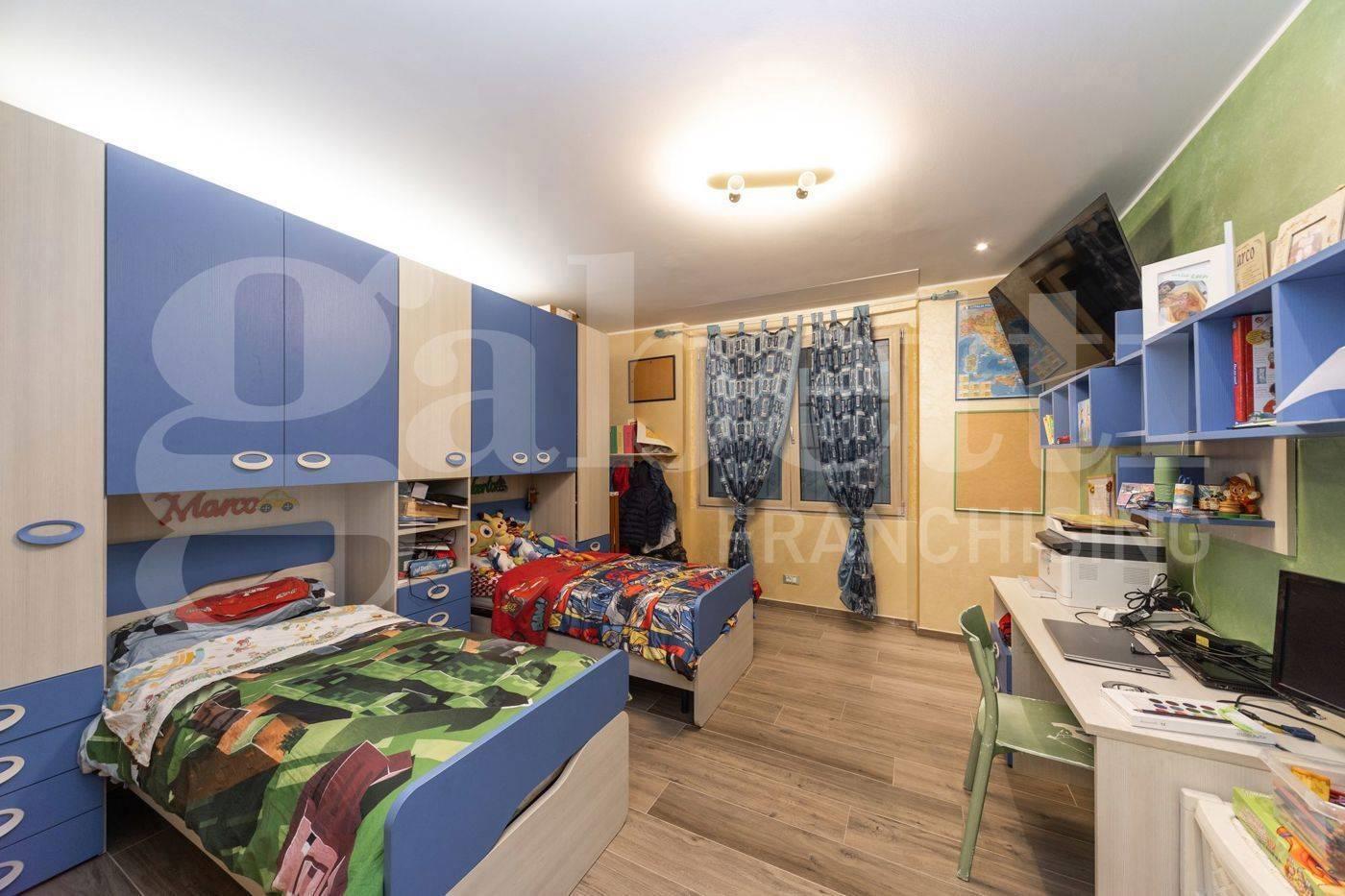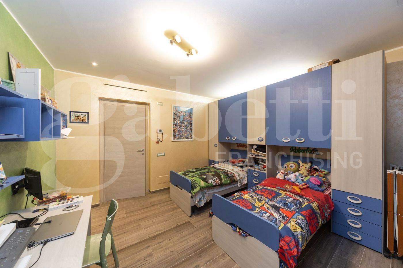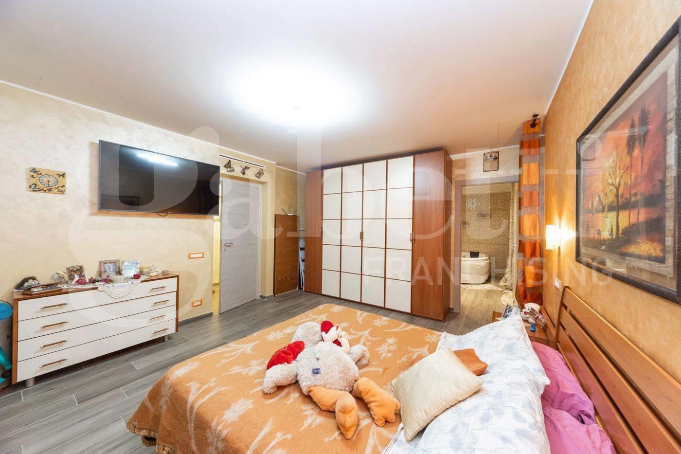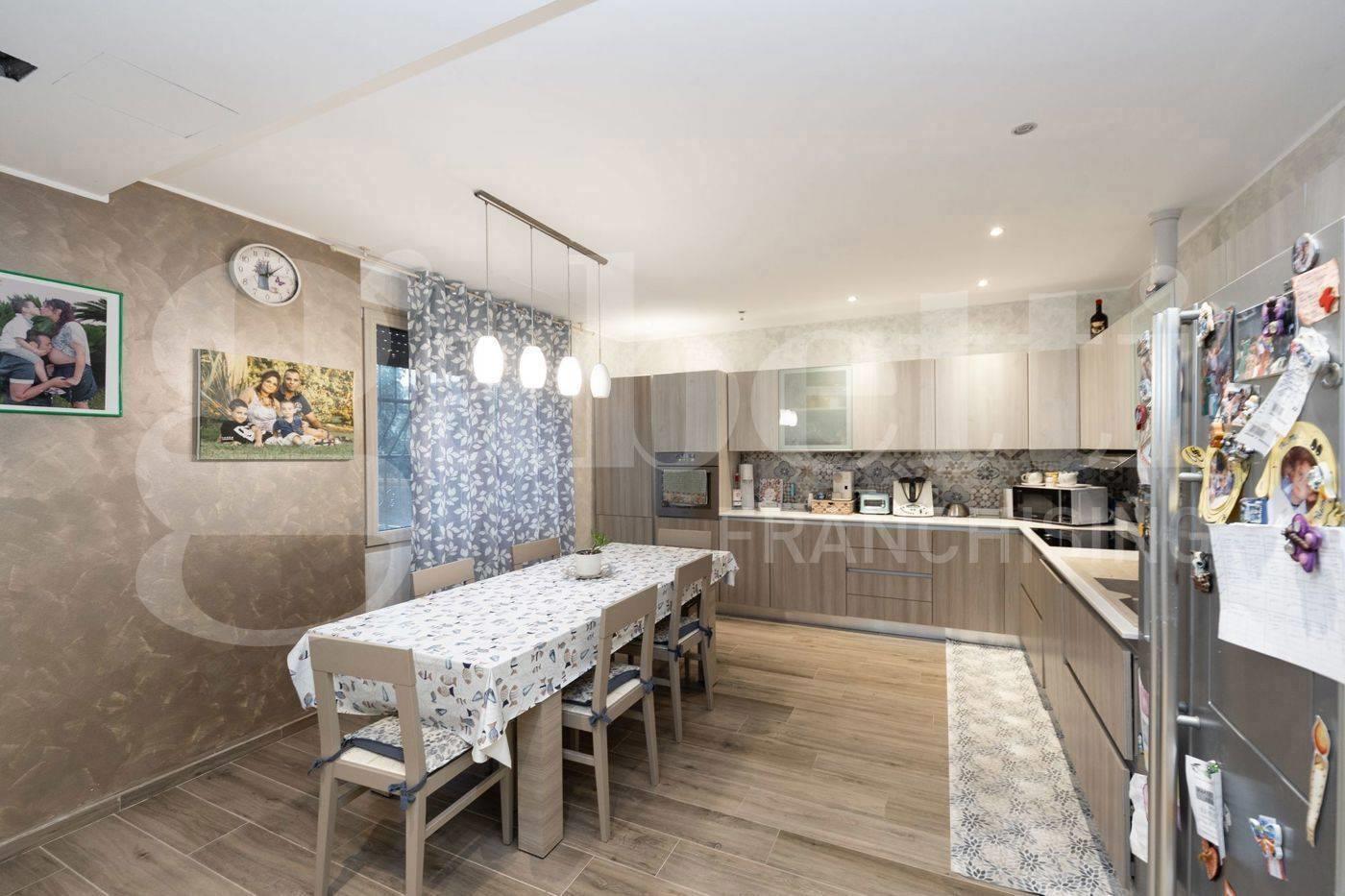 Gli interni sono luminosi grazie alle grandi finestre con infissi moderni di ultima generazione dotati di zanzariere e grate antintrusione; il soggiorno doppio accoglie gli ospiti con finiture raffinate tra cui una parete effetto pietra naturale, camino angolare moderno e illuminazione a faretti LED incassati sul soffitto. Gli spazi risultano ottimamente distribuiti lungo un corridoio principale che conduce alle camere da letto spaziose ed alla cucina abitabile (eventualmente separabile), garantendo praticità sia negli eventi conviviali che nella vita quotidiana.