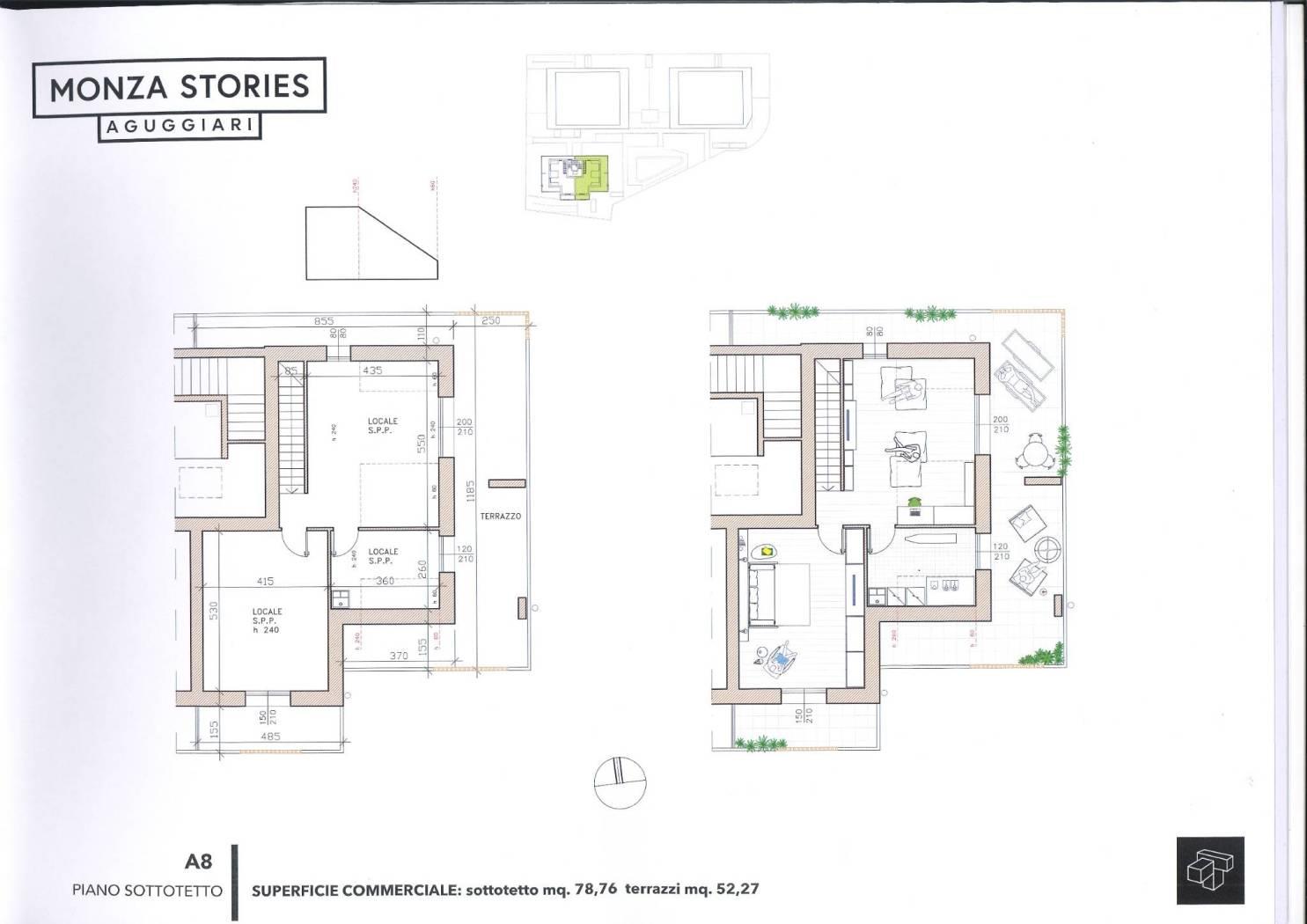 Dopo il successo di Monza Stories Triante e Monza Stories Cederna, a pochi minuti dal centro, in una tranquilla zona residenziale, partirà a breve la realizzazione di Monza Stories Aguggiari: tre palazzine in classe A4, con appartamenti di 3-4 locali, dal design moderno, terrazzi, giardini, serre bioclimatiche, impianti sostenibili e performanti per un reale investimento sul tuo futuro. La soluzione qui proposta è l’appartamento A/7, 4 locali al terzo piano di Mq. 92 con mansarda di Mq. 78 composto da: Ampio soggiorno con accesso al terrazzo di Mq.14, cucina abitabile con accesso diretto all'ampio balcone di Mq.10 oltre ad una balconata di circa 14mq, camera da letto e doppi servizi. Al piano superiore, collegato da una comoda scala in muratura, camera da letto con balcone, ampio studio/locale hobby e servizio con accesso all'ampio terrazzo. Consegna Giugno/Settembre 2026. Completa la proprietà la cantina e la disponibilità di box di varie dimensioni.