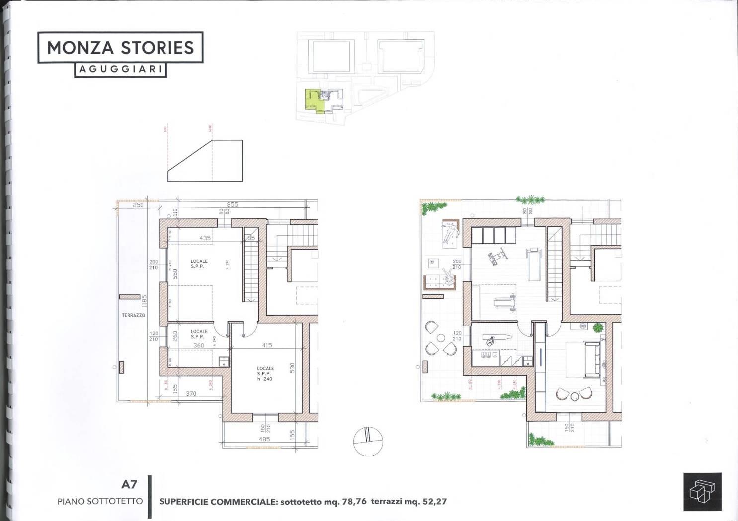 Dopo il successo di Monza Stories Triante e Monza Stories Cederna, a pochi minuti dal centro, in una tranquilla zona residenziale, partirà a breve la realizzazione di Monza Stories Aguggiari: tre palazzine in classe A4, con appartamenti di 3-4 locali, dal design moderno, terrazzi, giardini, serre bioclimatiche, impianti sostenibili e performanti per un reale investimento sul tuo futuro. La soluzione qui proposta è l’appartamento A/8, 4 locali al terzo piano di Mq. 92 con mansarda di Mq. 78 composto da: Ampio soggiorno con accesso al terrazzo di Mq.14, cucina abitabile con accesso diretto all'ampio balcone di Mq.10 oltre ad una balconata di circa 14mq, camera da letto e doppi servizi. Al piano superiore, collegato da una comoda scala in muratura, camera da letto con balcone, ampio studio/locale hobby e servizio con accesso all'ampio terrazzo. Consegna Giugno/Settembre 2026. Completa la proprietà la cantina e la disponibilità di box di varie dimensioni.