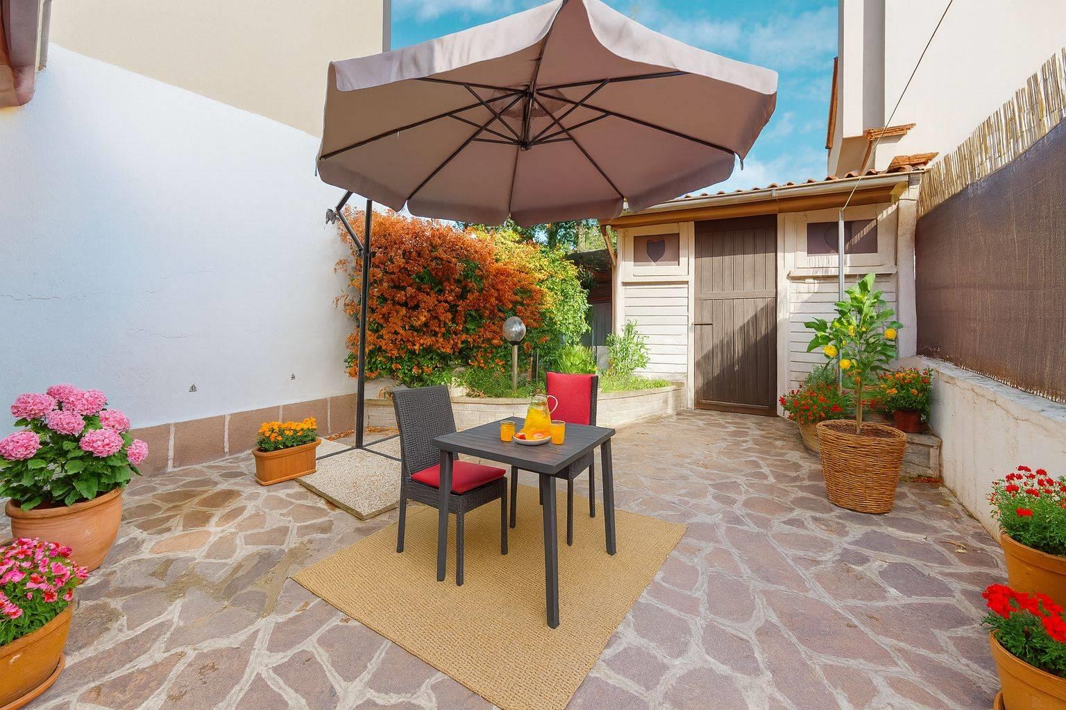 Al piano terra si apre una zona giorno accogliente, composta da un soggiorno spazioso e una cucina abitabile separata che gode di un affaccio diretto sul giardino privato piastrellato, un angolo riservato perfetto per pranzi all’aperto, momenti di relax o per chi ama avere uno spazio esterno facilmente gestibile. A completare il piano, un bagno finestrato, pratico e ben rifinito.
