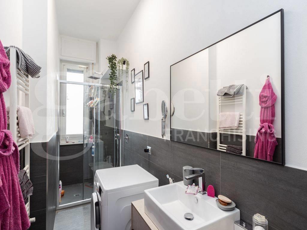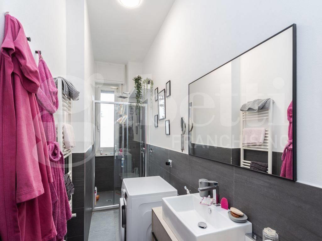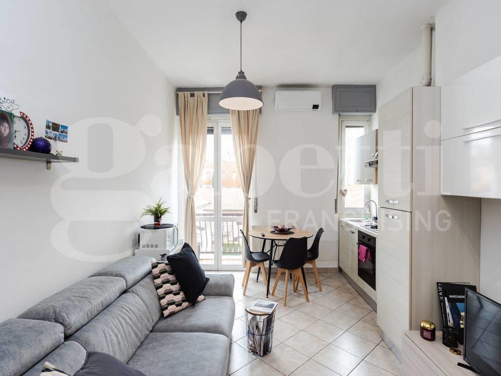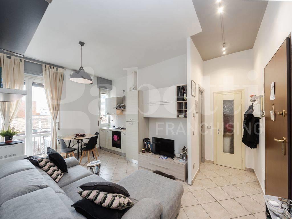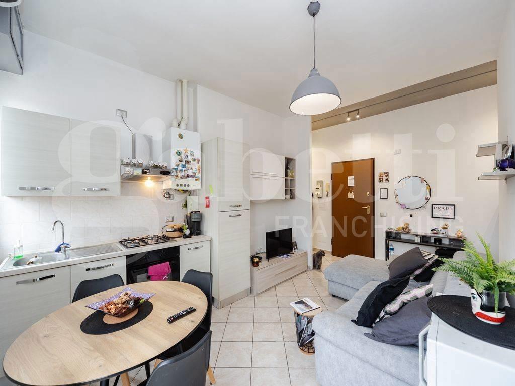 L'appartamento si apre su un soggiorno open space molto luminoso grazie alle ampie finestre con accesso diretto al balcone privato che regala una vista aperta sui tetti della città. La cucina a vista è dotata di arredi chiari contemporanei ed elettrodomestici recenti: ideale per chi ama vivere la casa ogni giorno o ricevere amici.