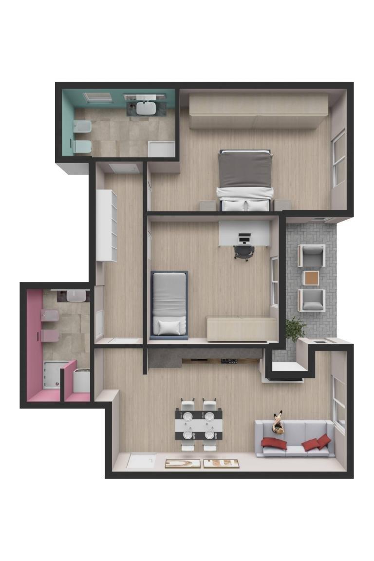 L’appartamento, posto al piano terreno con ascensore, si presenta con un ingresso che conduce alla zona living con cucina a vista, ambiente moderno e ideale per la vita quotidiana e bagno con aspirazione. La zona notte, ben separata, è composta da due camere da letto di comode dimensioni e un bagno padronale finestrato.
