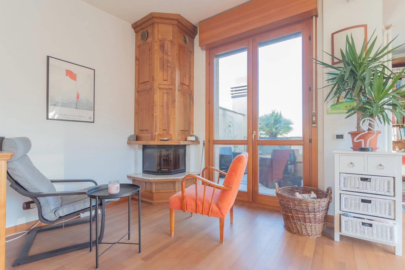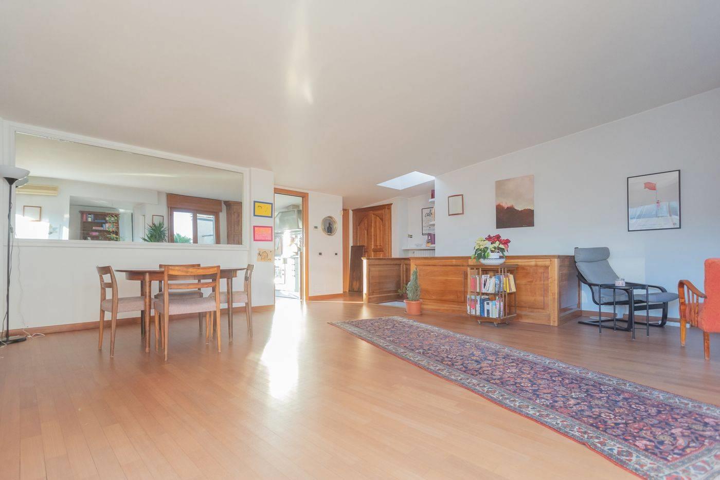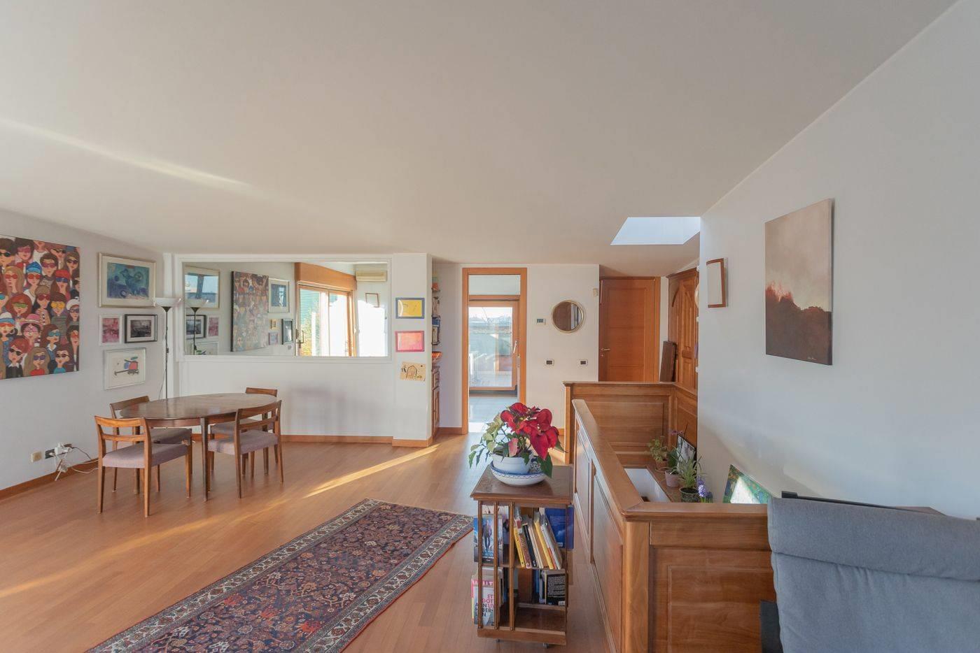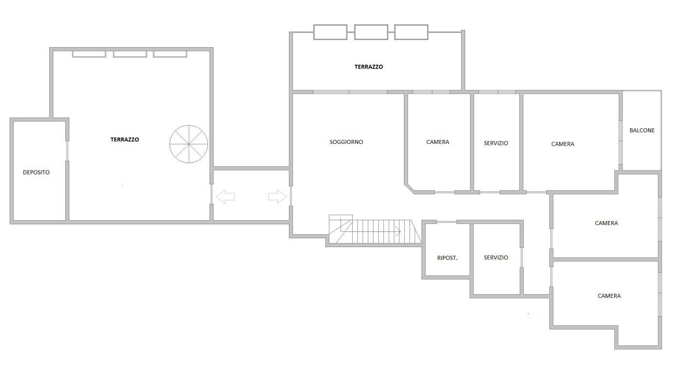 5° ed ultimo piano con ingresso, ampio salone con camino e due terrazzi di 14 mq e 9 mq, cucina abitabile con terrazzo di 20 mq, servizio e ripostiglio;