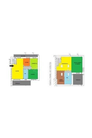 La soluzione è così composta: P2: Ampio Salone suddiviso tra zona living al qual si accede al terrazzo e zona pranzo al quale si accede all'altro balcone, comoda cucina abitabile anch'essa con sbocco su balcone, disimpegno, bagno, camera matrimoniale e cameretta. P.3 (mansarda/sottotetto) : Locale open-space suddiviso da un comodo armadio a muro che separa la cabina armadio/studio, altro servizio (lavanderia) , altro locale adibito a camera da letto con sbocco su TERRAZZO.