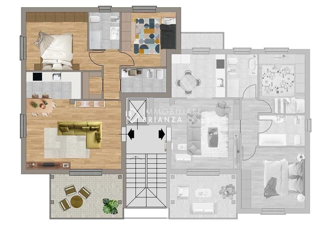 BESANA BRIANZA: zona centralissima, Via Beato Angelico, in mini palazzina di prossima realizzazione, al piano primo proponiamo appartamento di TRE LOCALI DOPPI SERVIZI E TERRAZZO. L'immobile è suddiviso come segue: ingresso su soggiorno con terrazzo di mq. 12,50 esposto a sud, cucina abitabile lasciata a vista, disimpegno notte, dove troviamo un ripostiglio, una camera matrimoniale, una camera singola, un bagno finestrato con box doccia ed un bagno di servizio.