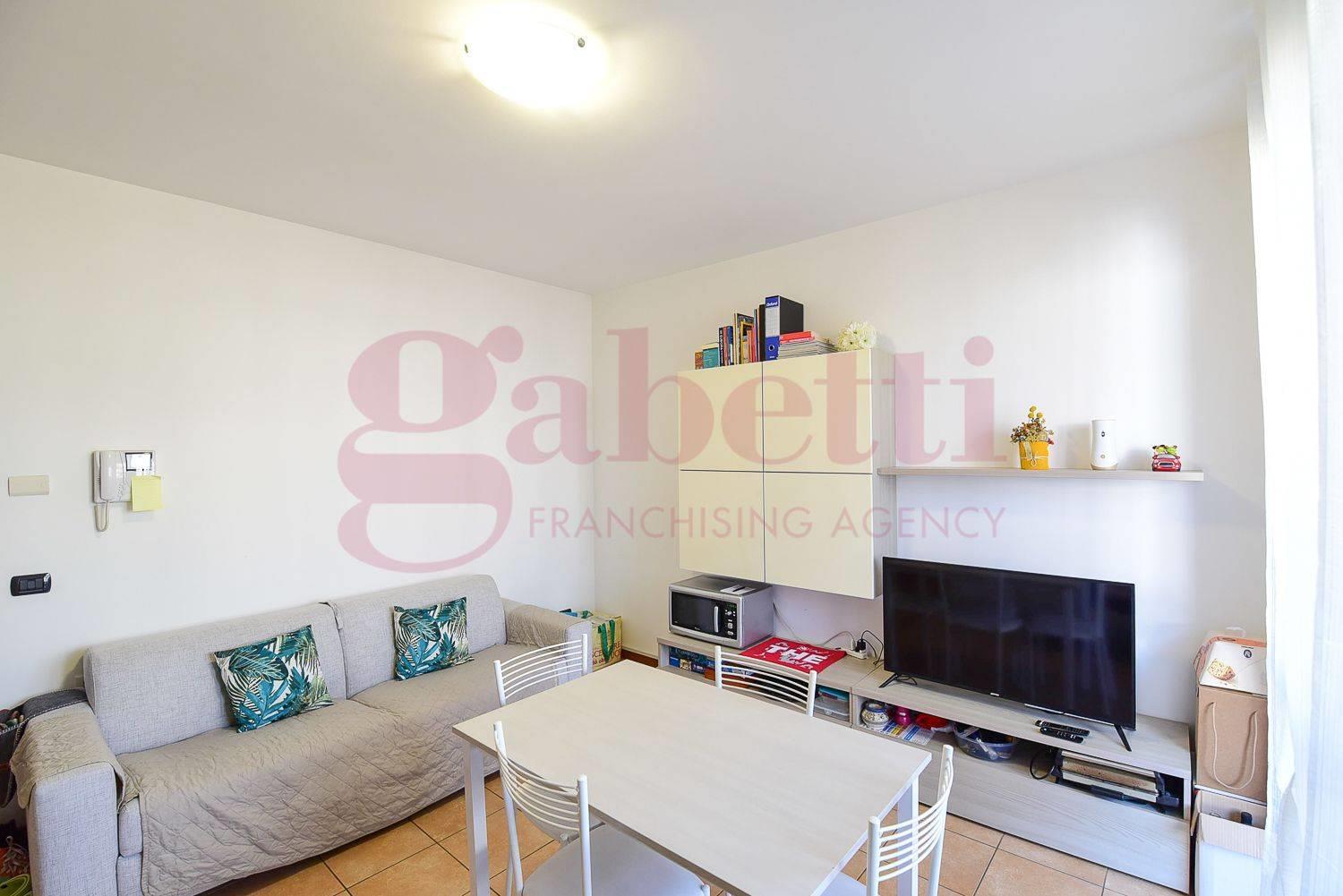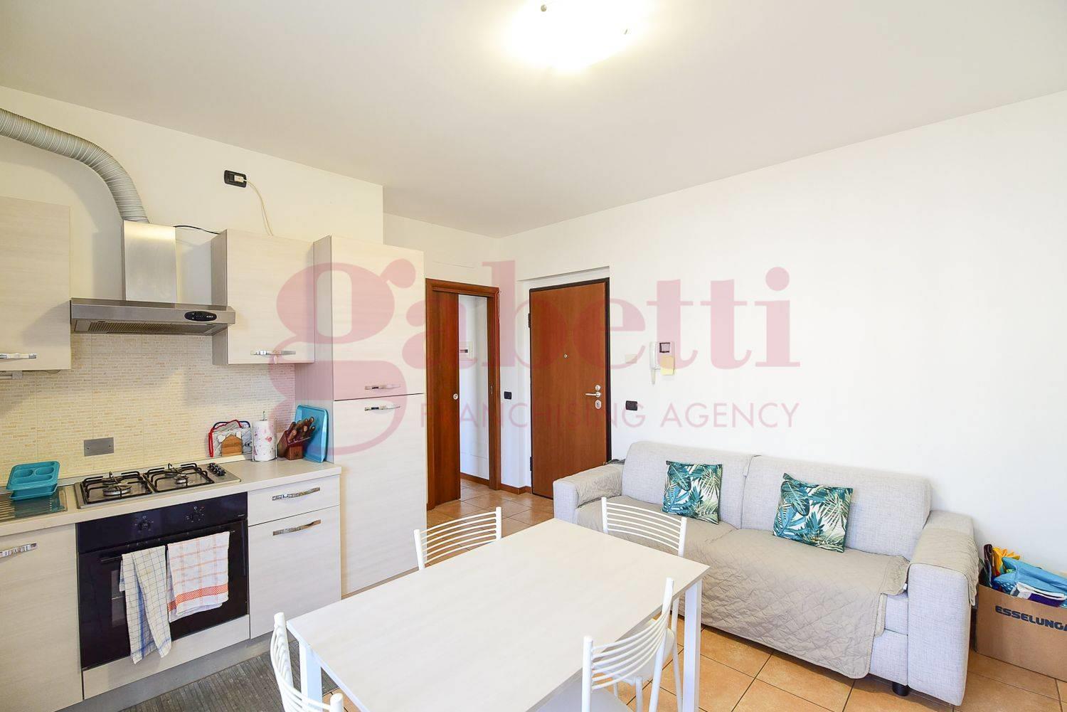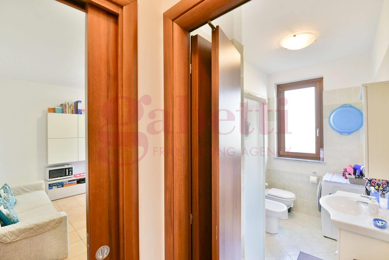 L’appartamento è composto da ingresso, soggiorno con angolo cottura e accesso a un ampio balcone, disimpegno, camera da letto e bagno finestrato completo di box doccia.