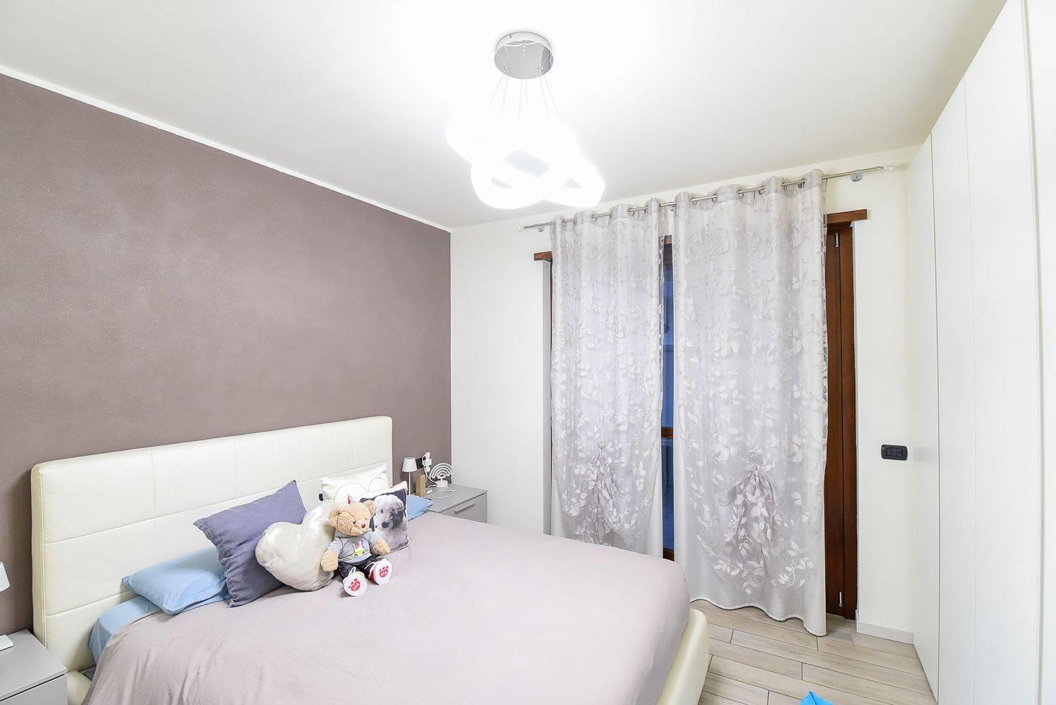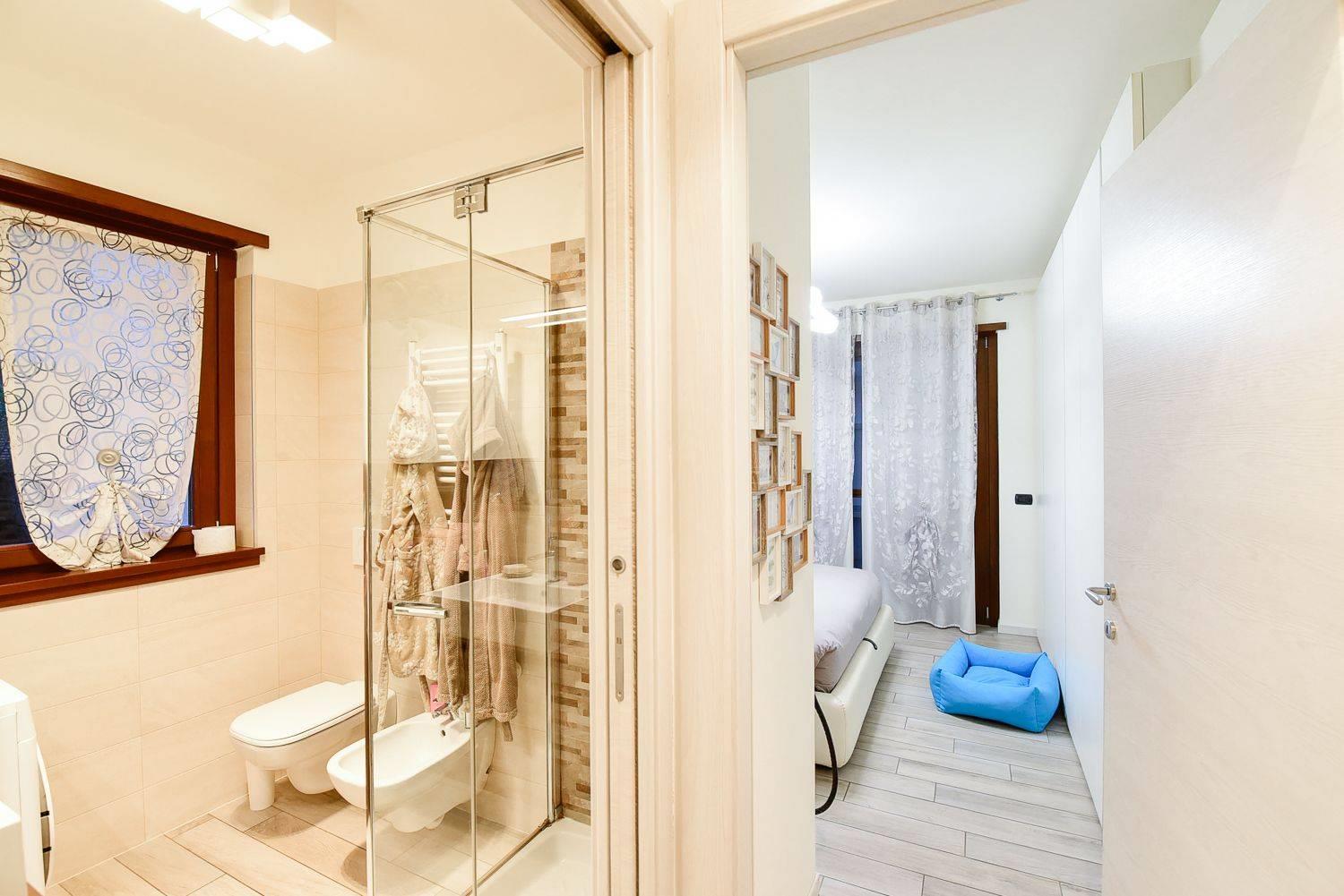 Spostandoci nella zona notte troviamo poi l'ampia camera da letto anch'essa con accesso diretto al giardino ed il bagno che gode oggi della presenza di un comodo box doccia.