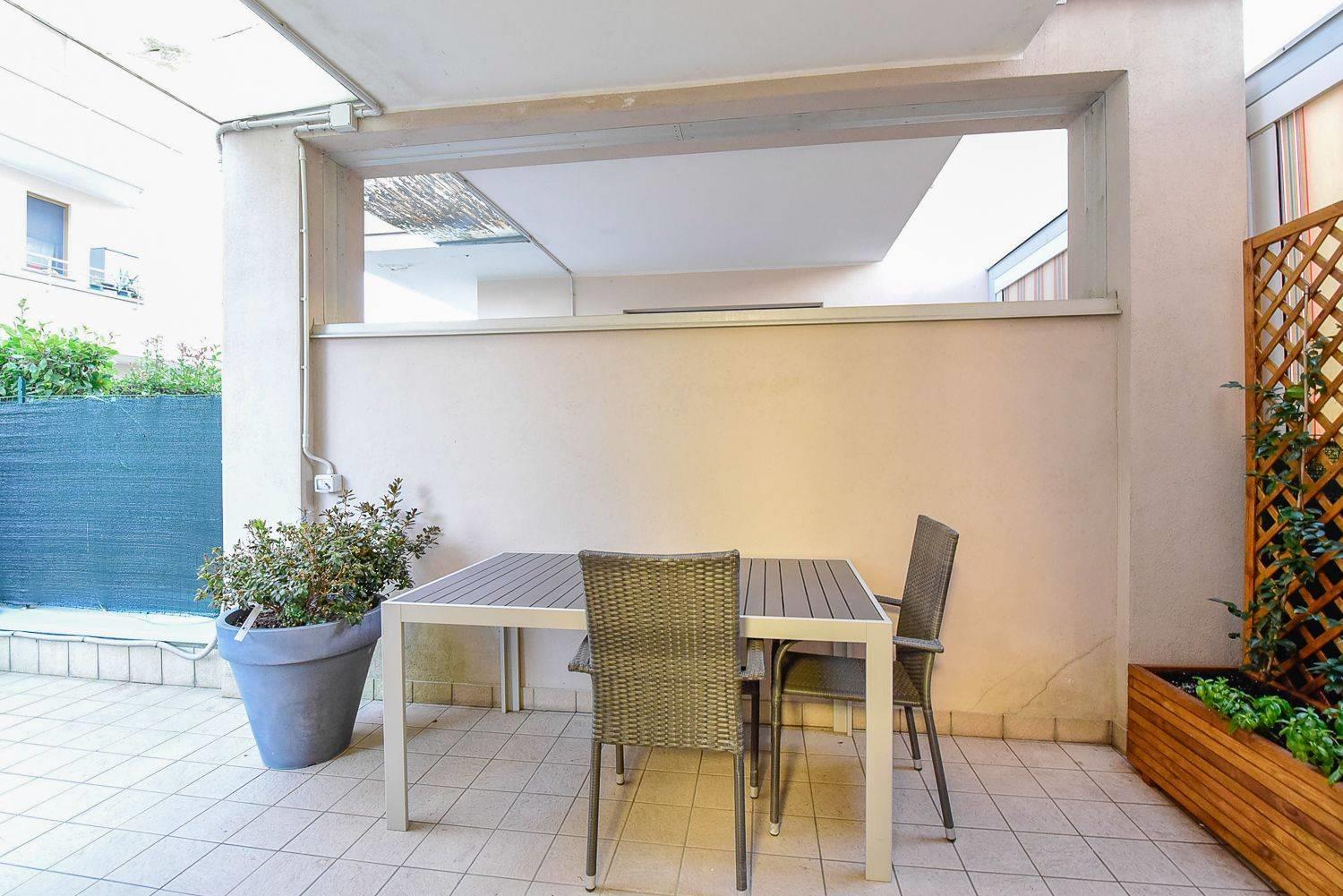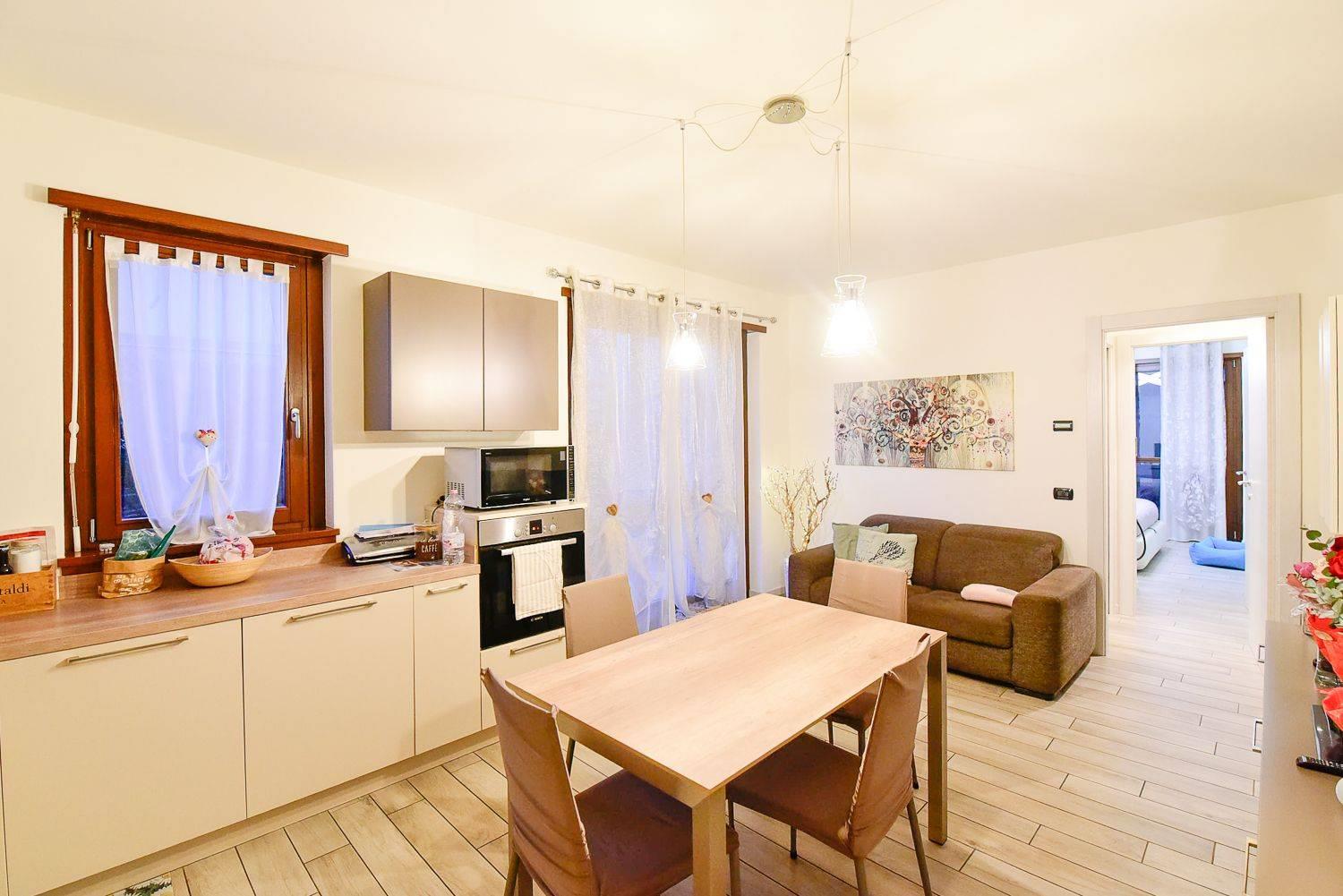 Funge da benvenuto un ampia zona giorno in open-space con accesso diretto al giardino di proprietà tramite porta finestra in doppio vetro.