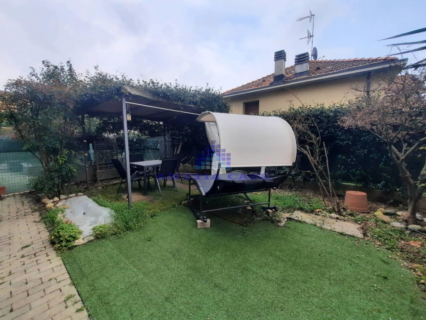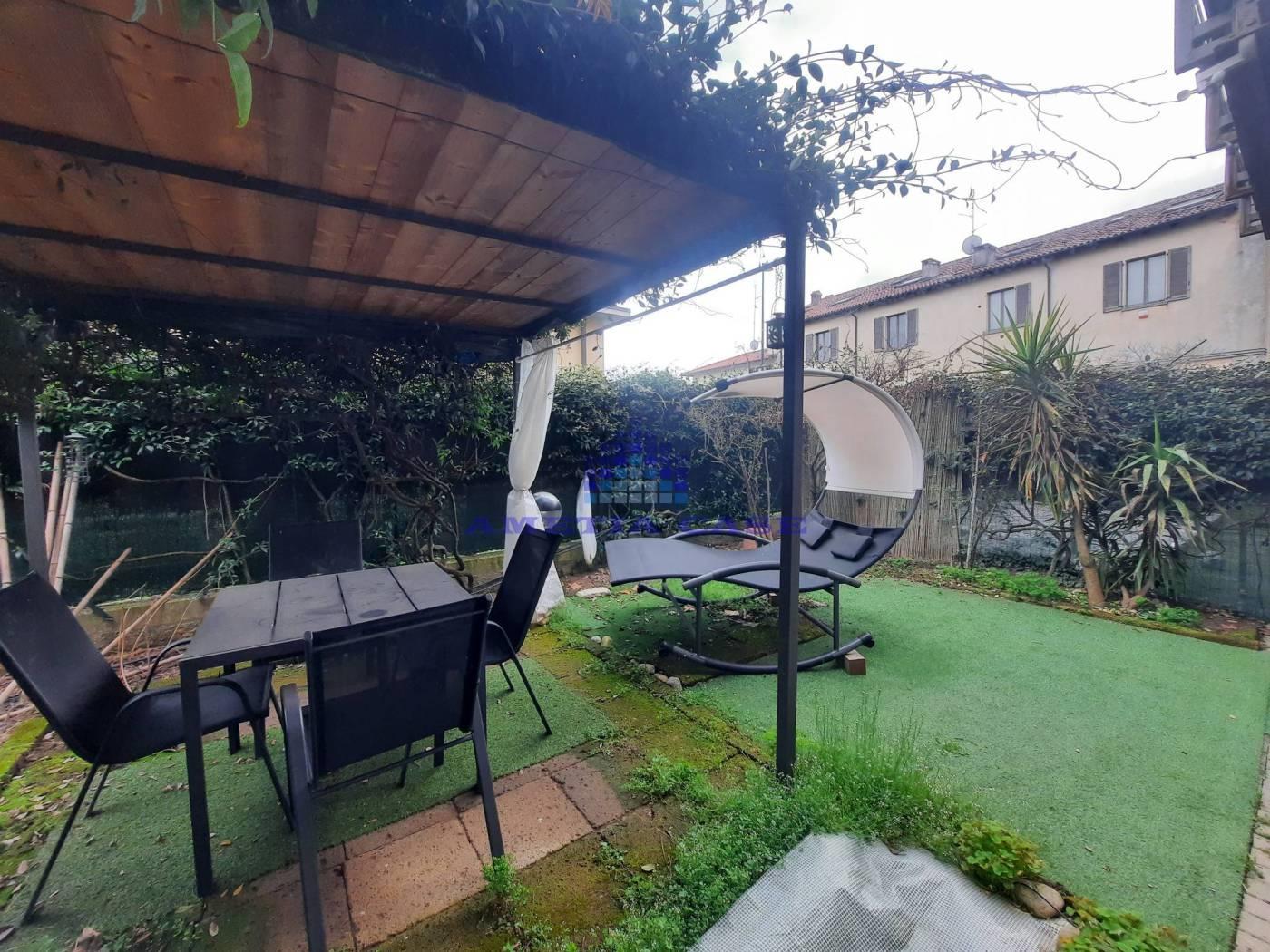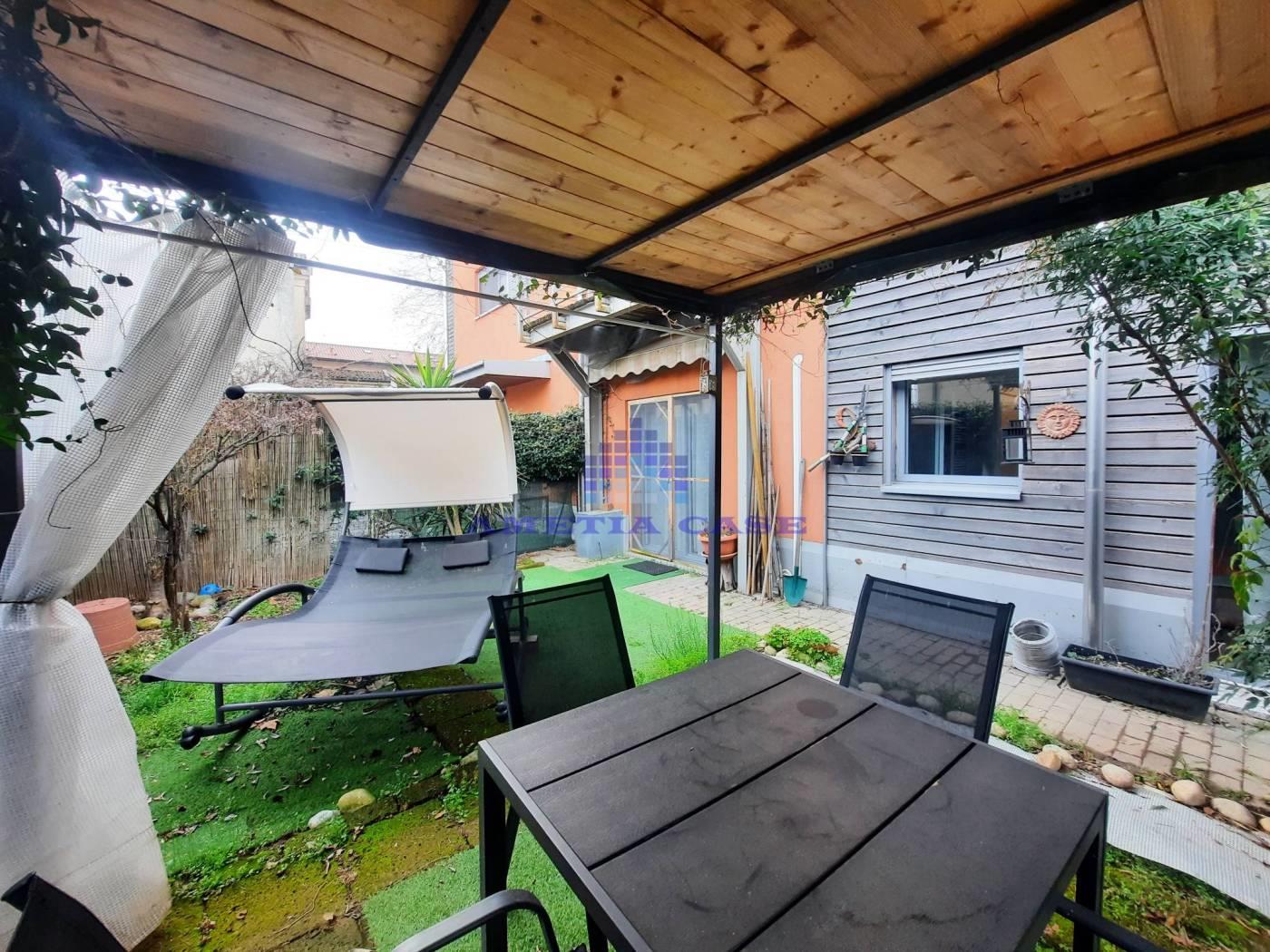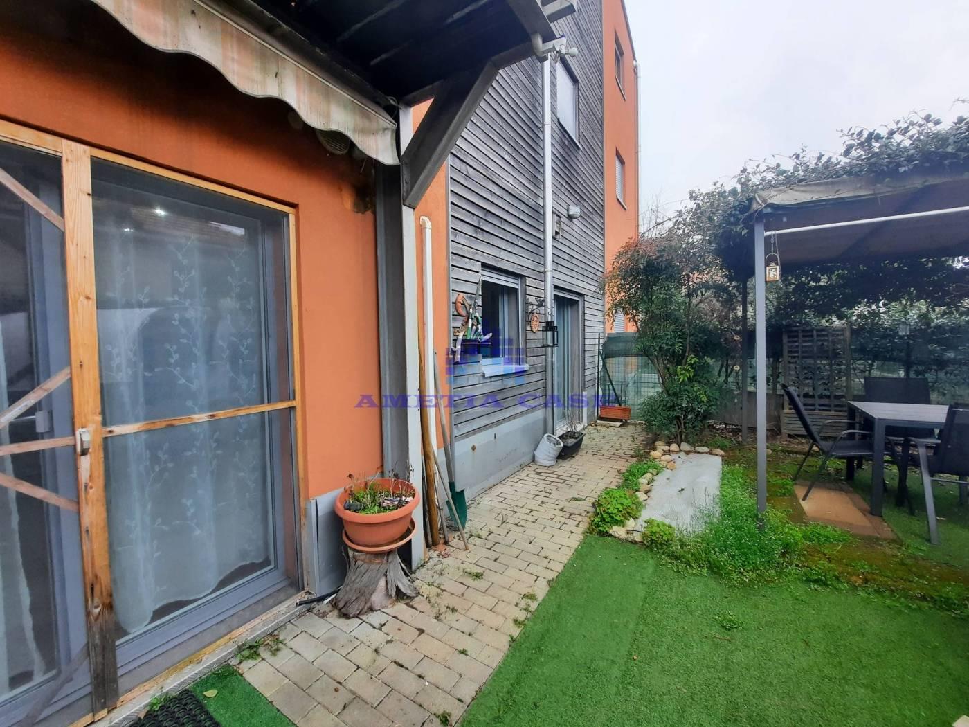 L'abitazione si affaccia su graziosa area esterna dotata di bersò coperto e tenda da sole.